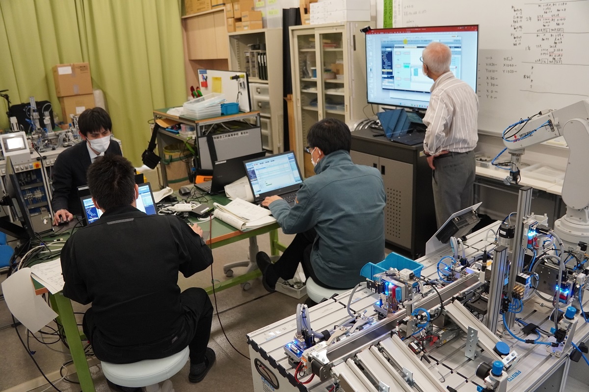 今日、2年生は総合実習でした。電気系・高度ものづくり技能の追求と実践(メカトロニクス職種)班は、2日間に渡ってMPS装置講習会を受けました。