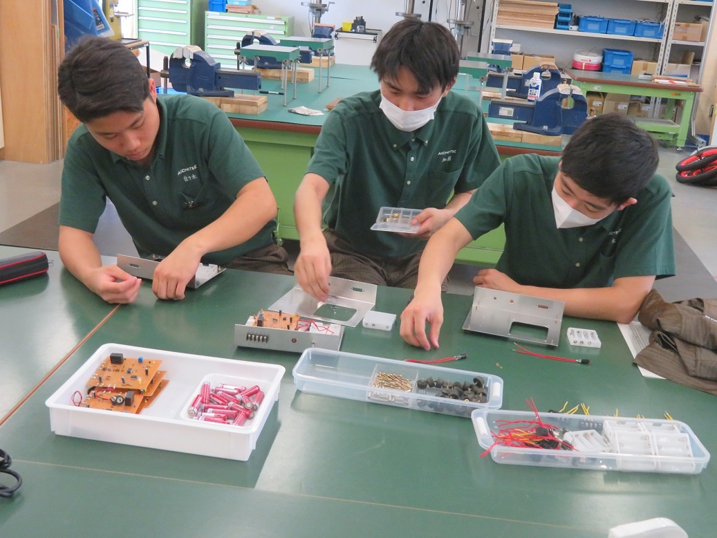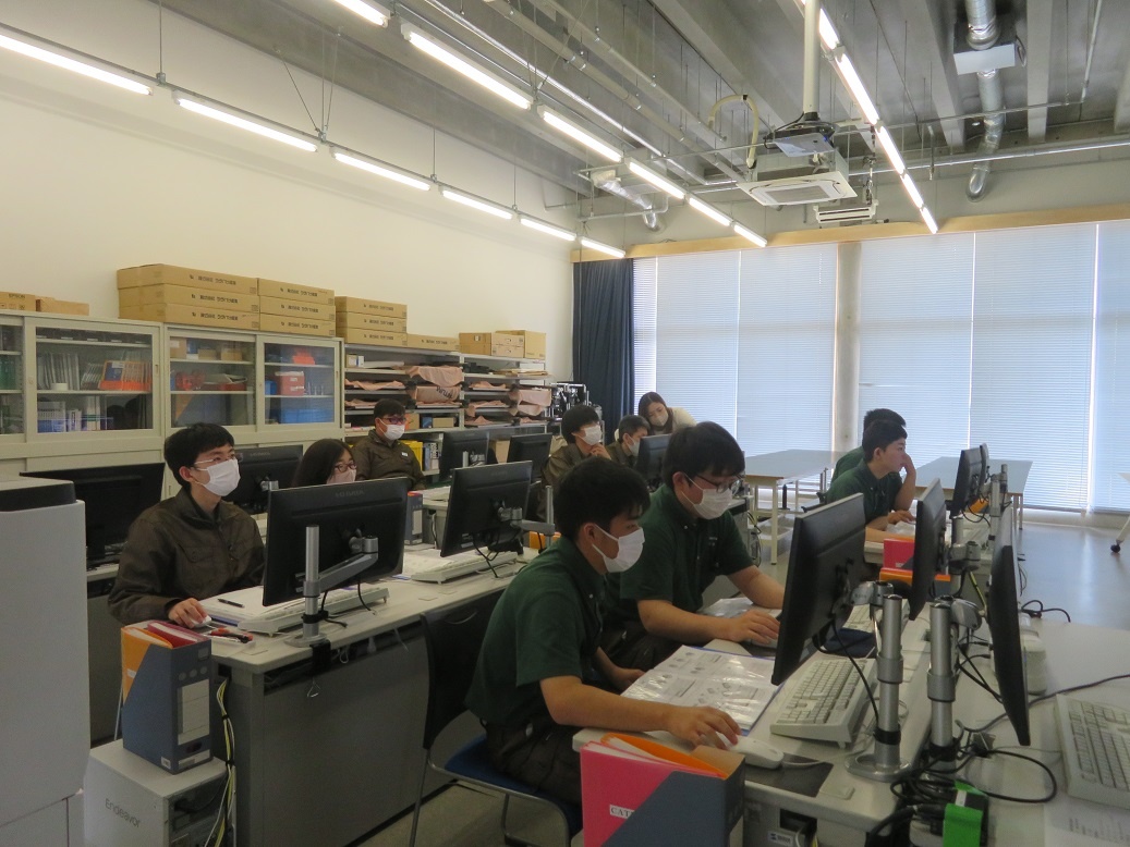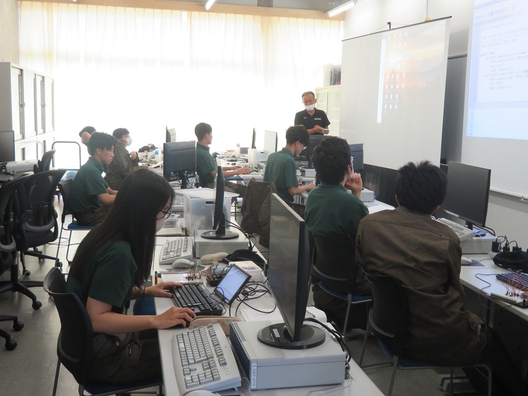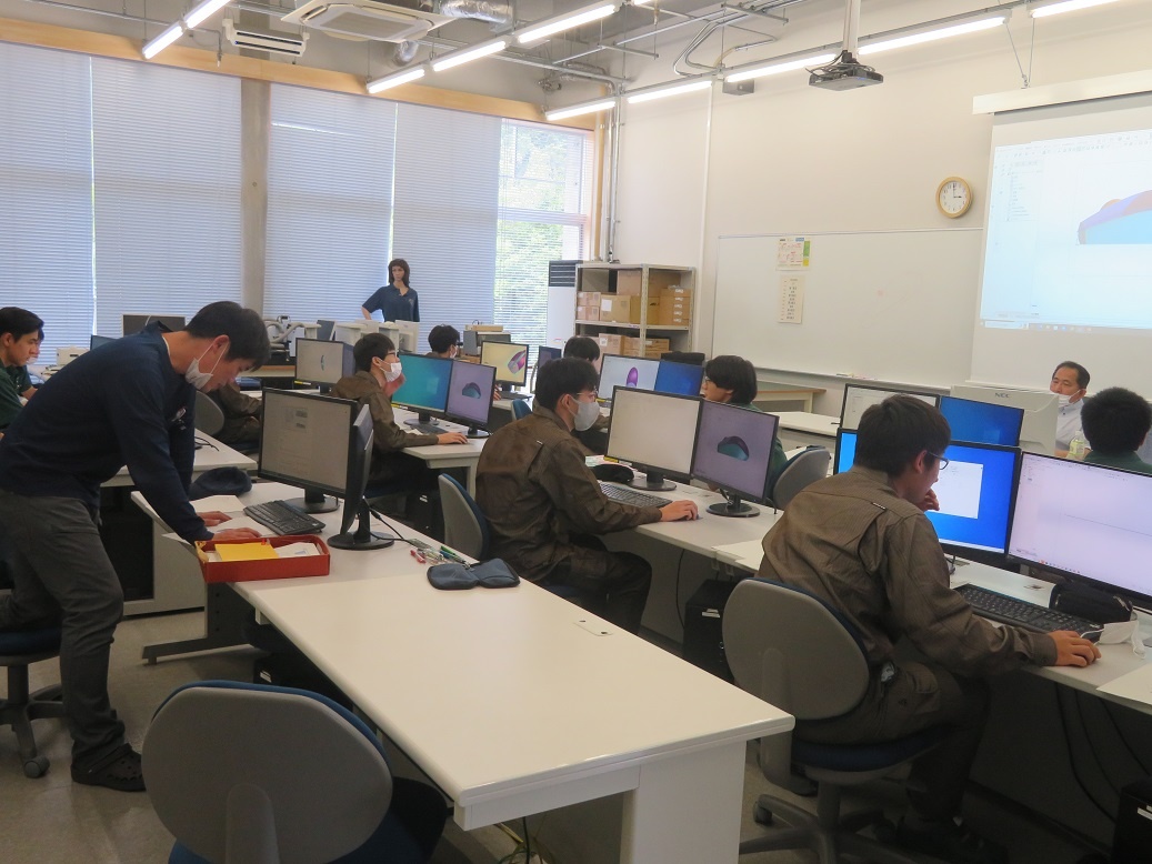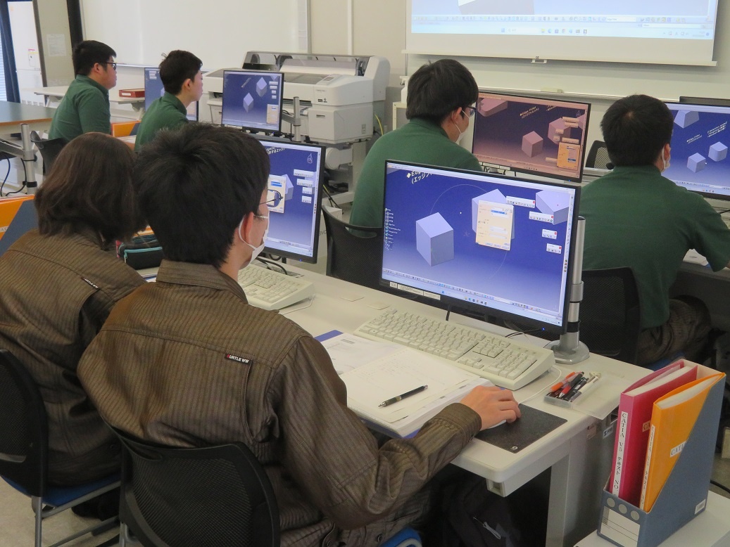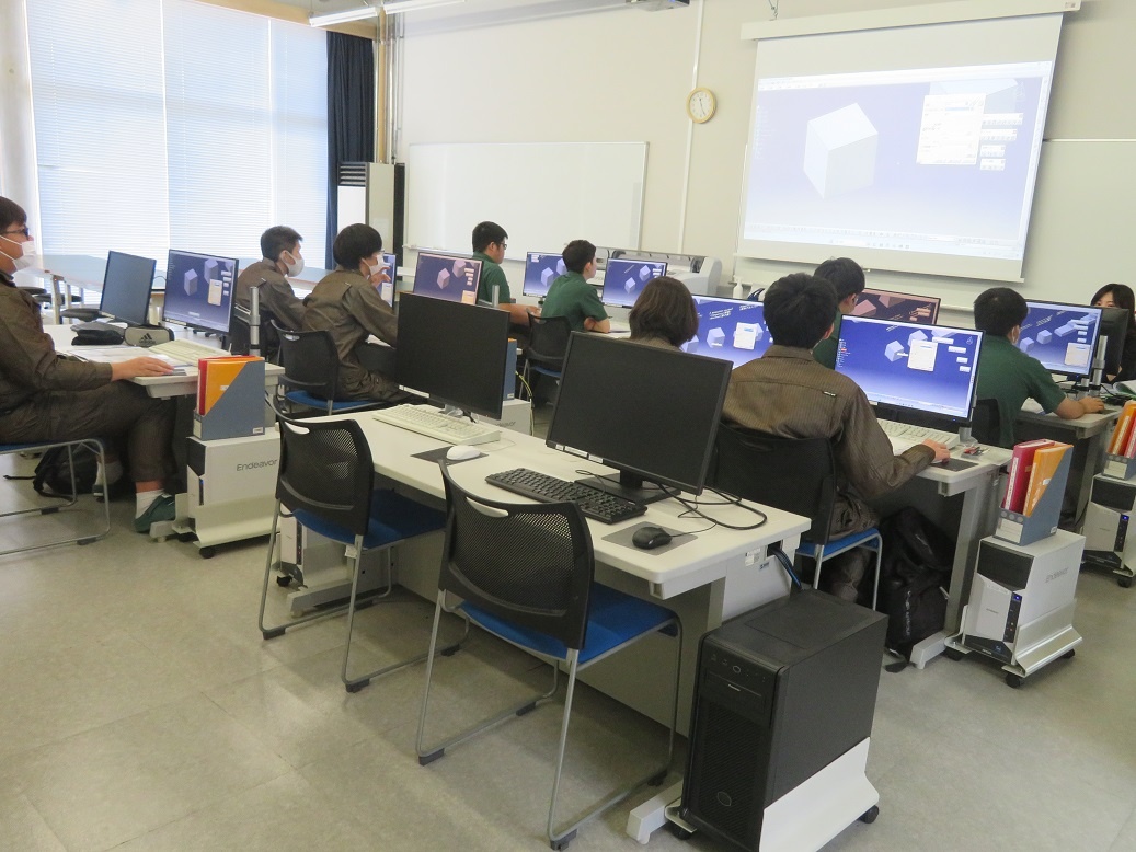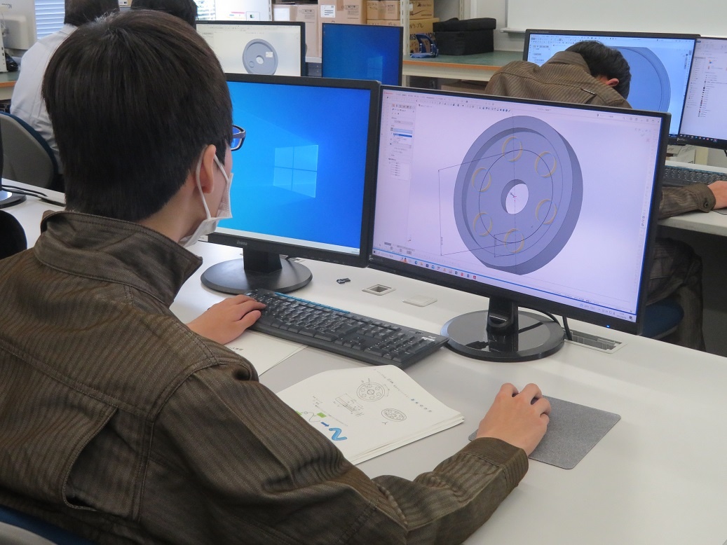 今日は1年生がコース実習でした。自動車・航空コースは「機械基礎実習(フライス、仕上げ、旋盤)」、電気・制御コース「CAD(ソリッドワークス)」、情報・ITコース「Pythonプログラム基礎」、電子・ロボットコースは「CAD(CT)」に取り組みました。
