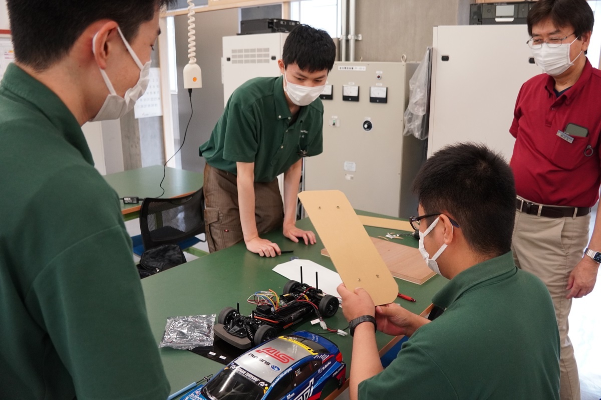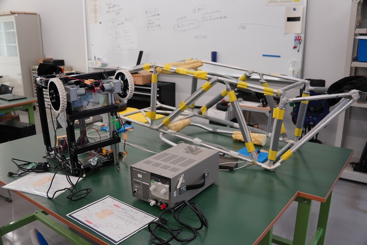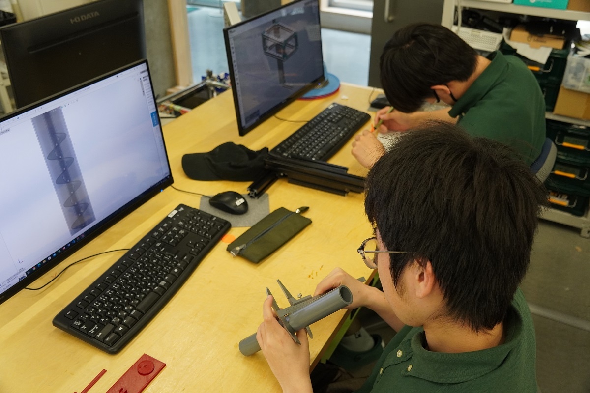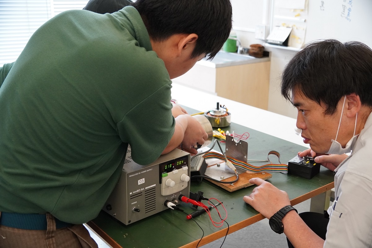 「先端小型ロボットの開発と製作」班は、設計したデータからアクリル板を切り出し、ロボットのパーツを作りました。「エコモビリティ技術・再生可能エネルギーの研究と実践Ⅱ」班は、自分で巻いたコイルで作ったモーターがうまく回るか実験しました。