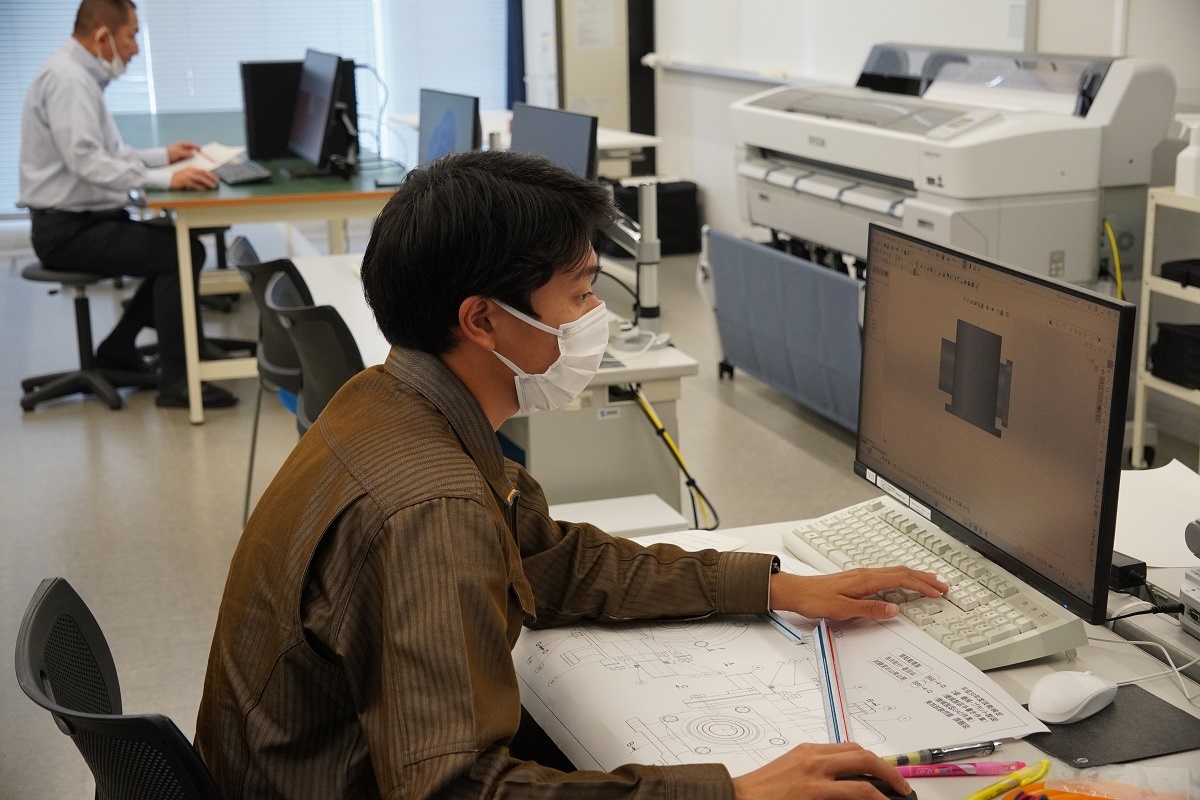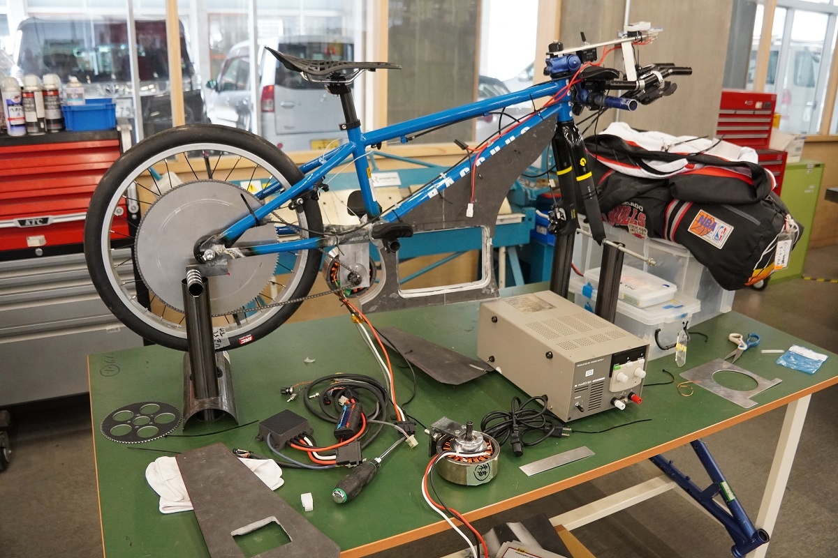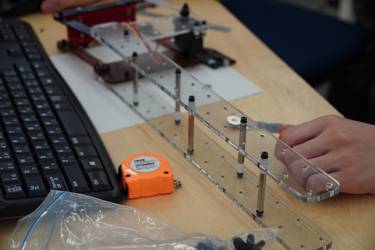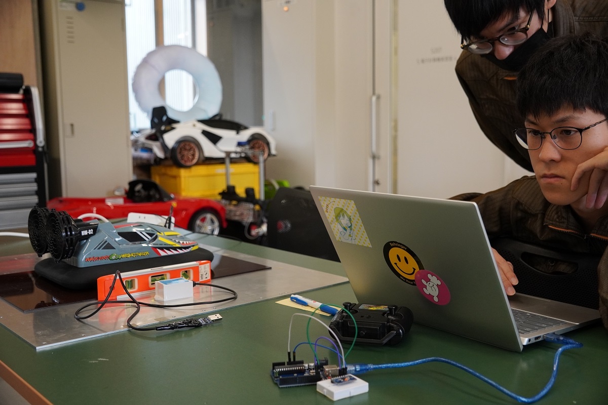 「先端小型ロボットの開発と製作」班は、設計したデータからアクリル板を切り出し、ロボットのパーツを作りました。「エコモビリティ技術・再生可能エネルギーの研究と実践Ⅱ」班は、自分で巻いたコイルで作ったモーターがうまく回るか実験しました。