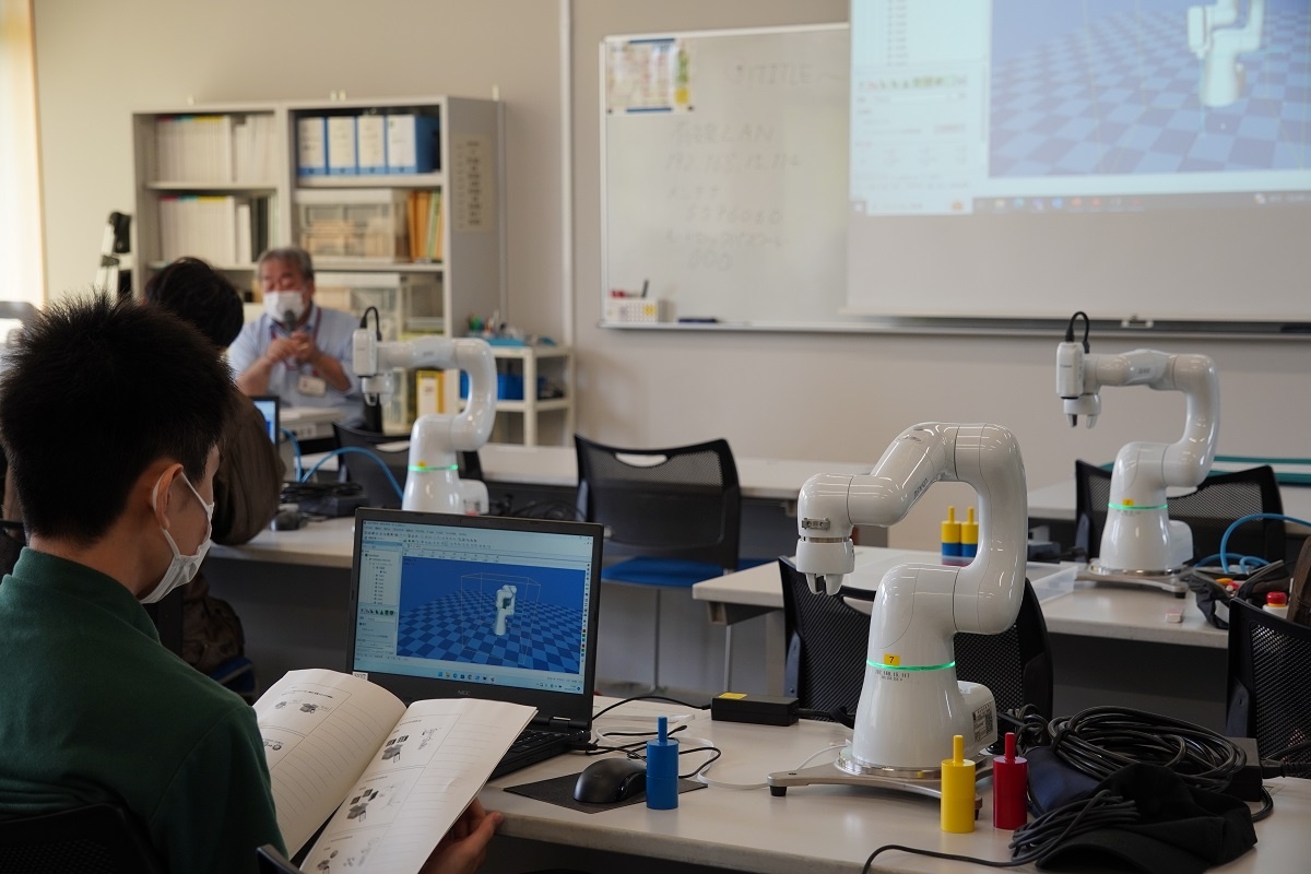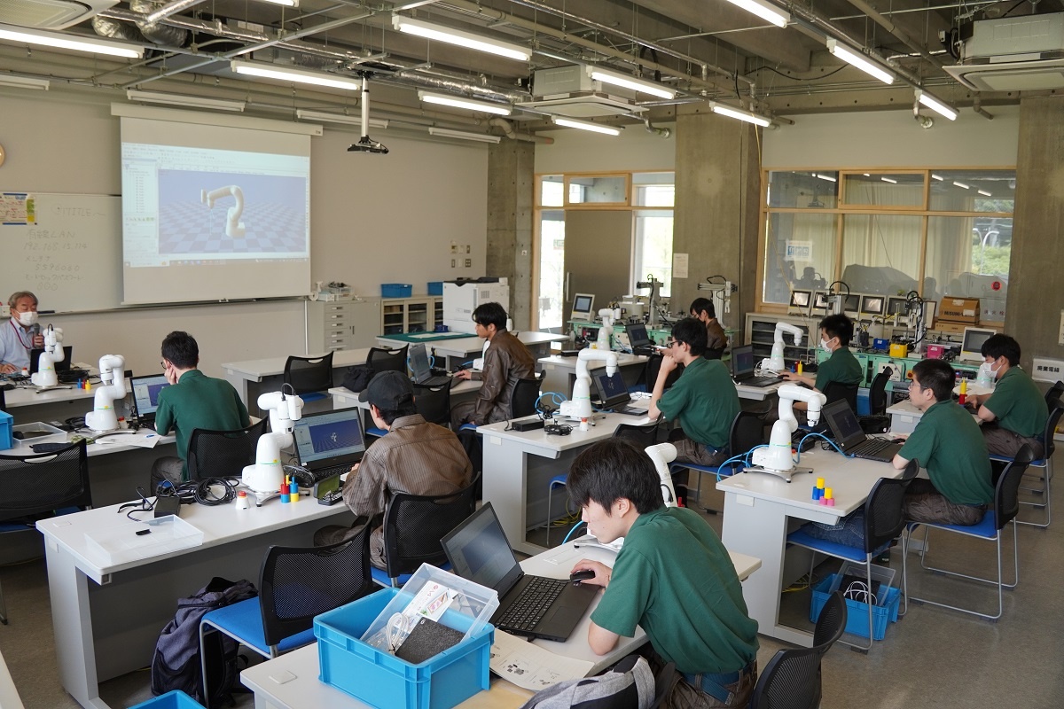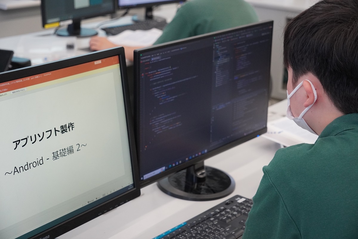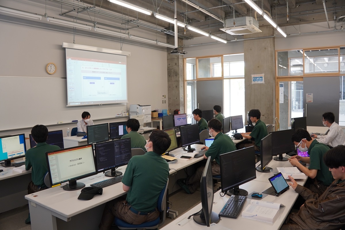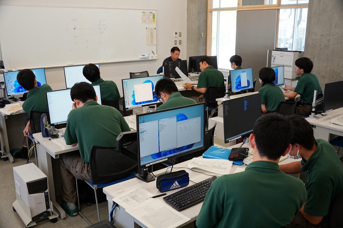 今日は2年生がコース実習でした。自動車・航空コースは「車両開発周辺技術」、電気・制御コースは「ロボット特別教育」、情報・ITコースは「NC加工機」、電子・ロボットコースは「アプリ開発(基礎)」に取り組みました。