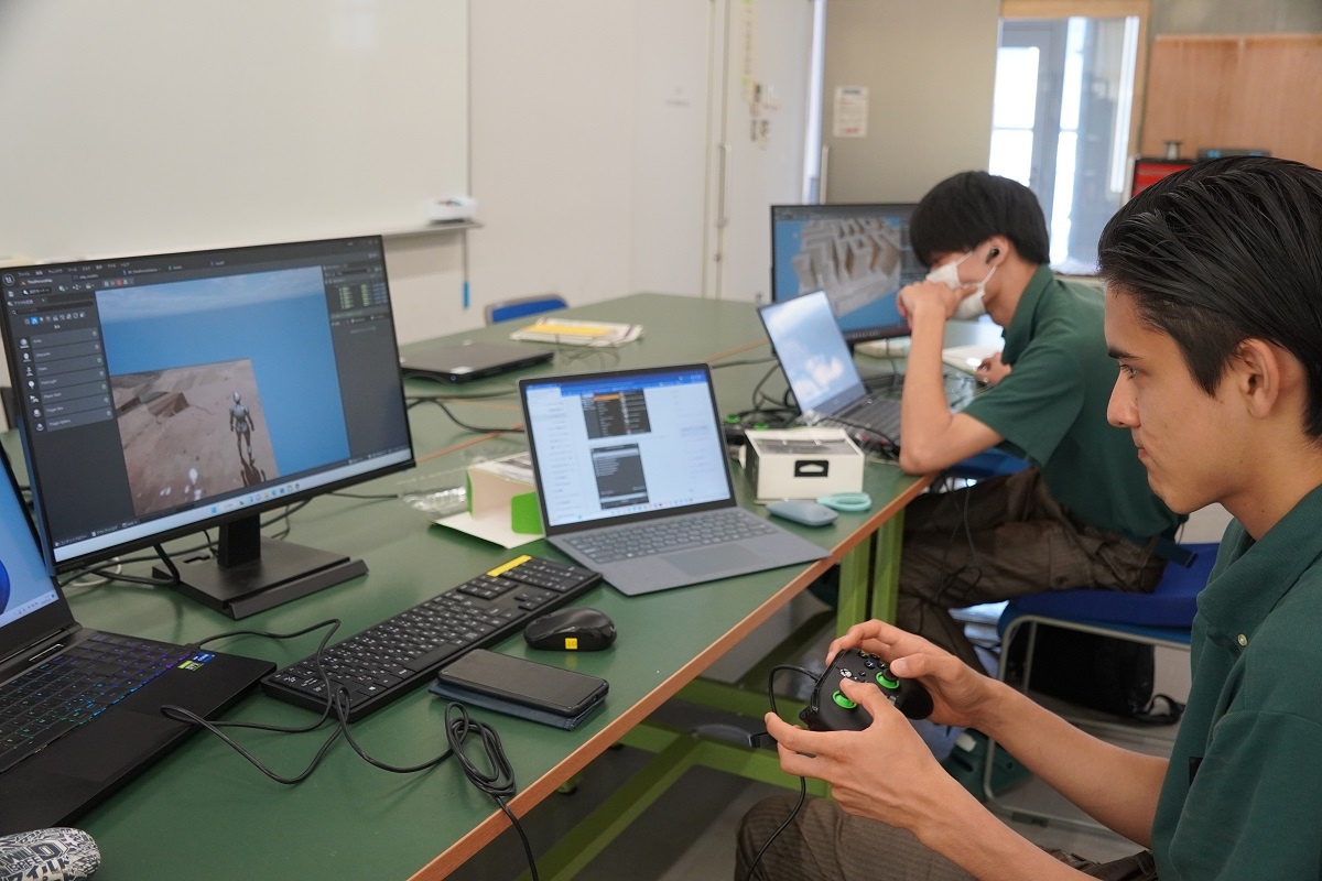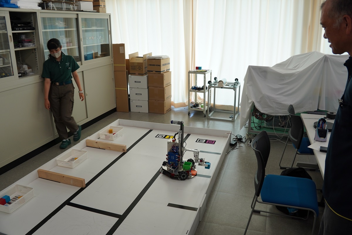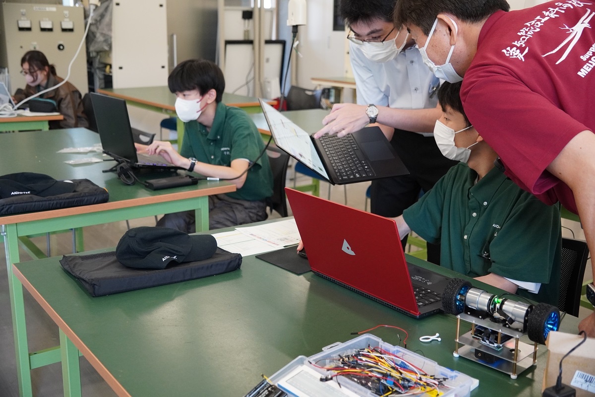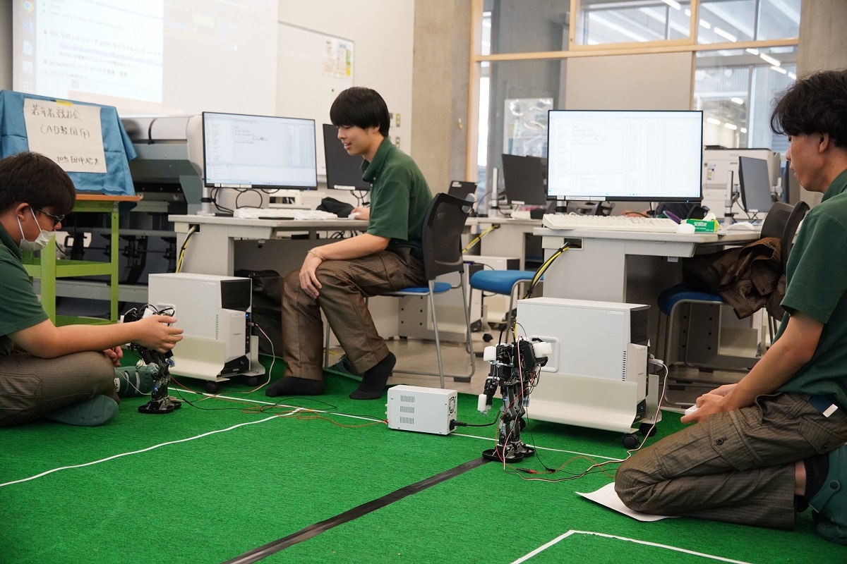 今日は1年生が総合実習でした。「RoboCup競技に向けての創造・開発力の習得」では、プログラムの調整を行い、ロボットが手をたたいたりするなどの様々な動きがスムーズにできるようになりました。