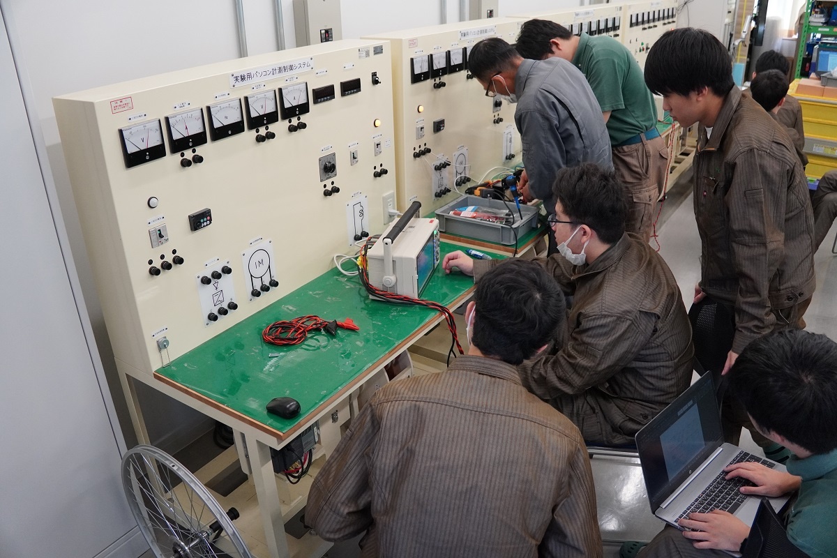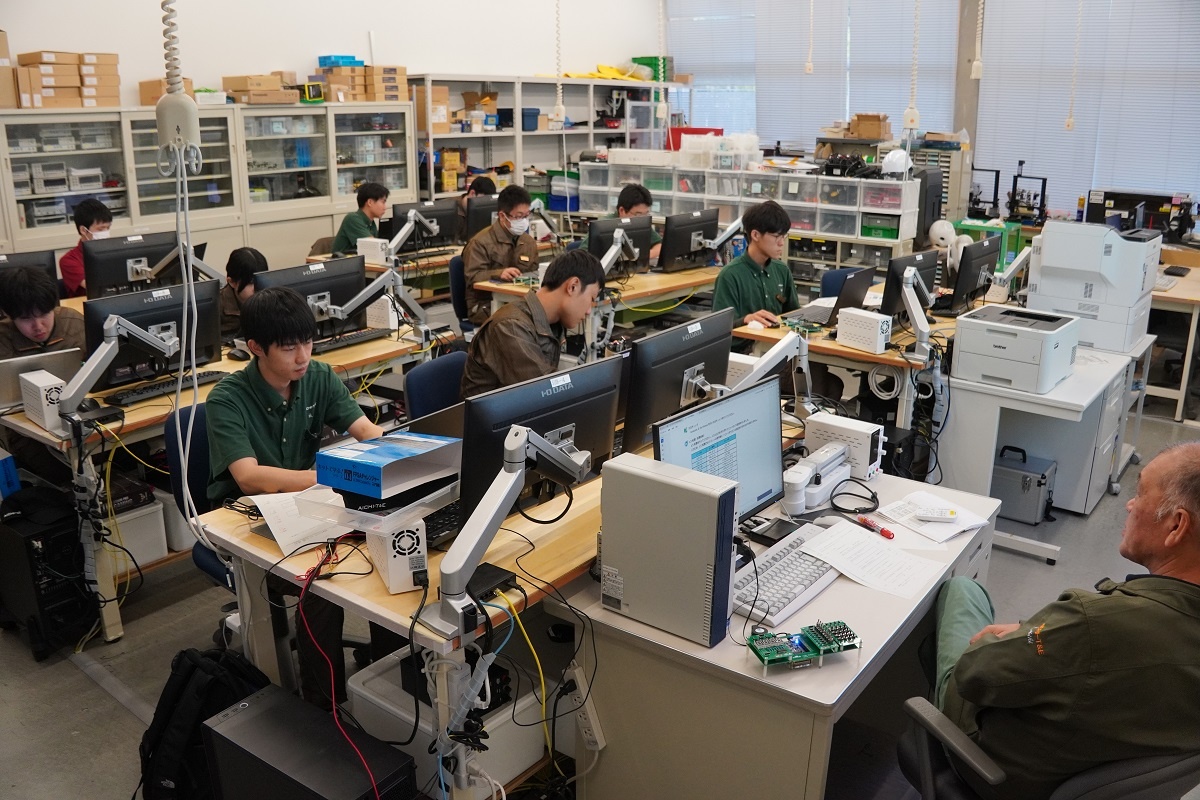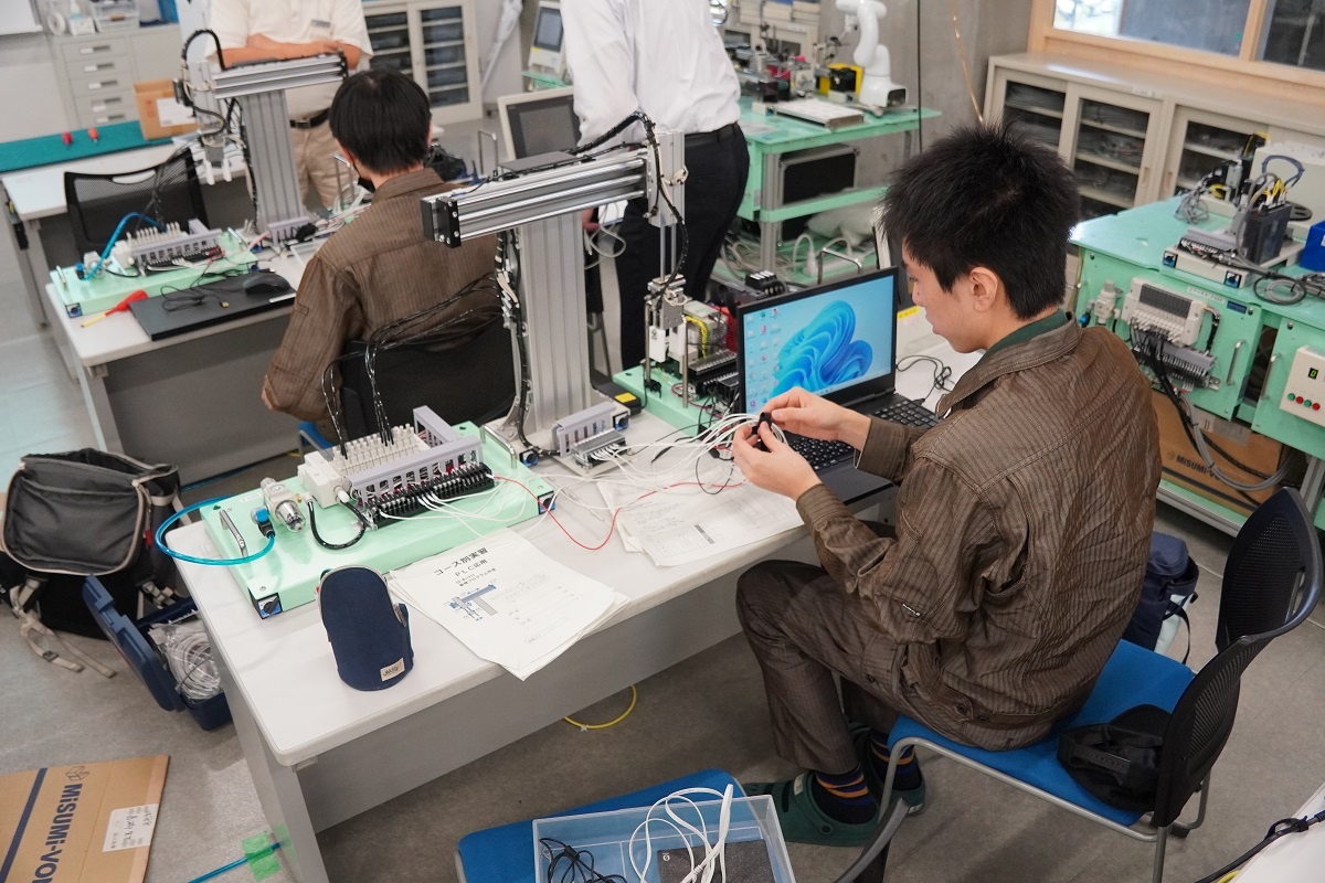 今日は2年生が授業日で、「コース実習(2年生)」でした。 自動車・航空コースは「CAE解析(EasyISTR)」、電気・制御コースは「PLC応用(センサ)」、情報・ITコースは「FPGA(回路シミュレーション)」、電子・ロボットコースは「電気機器(変圧器)」に取り組みました。