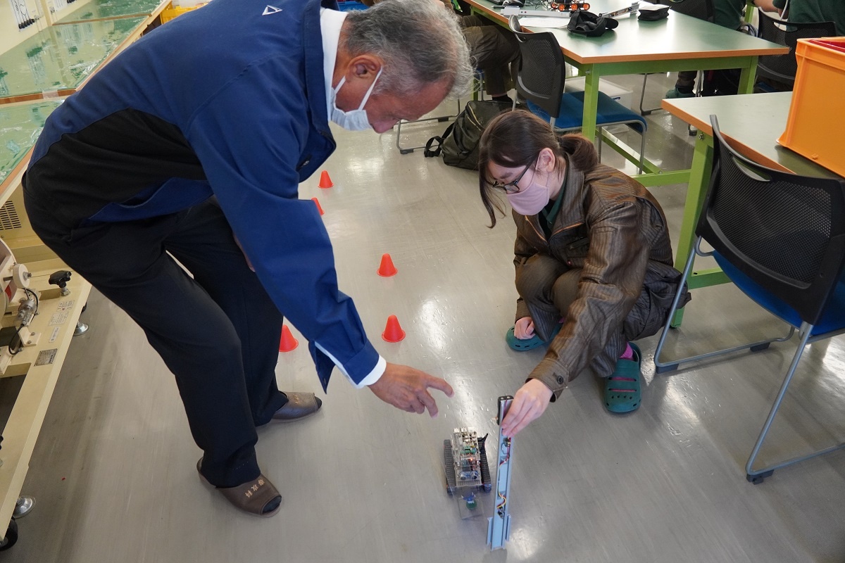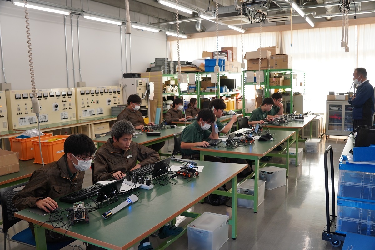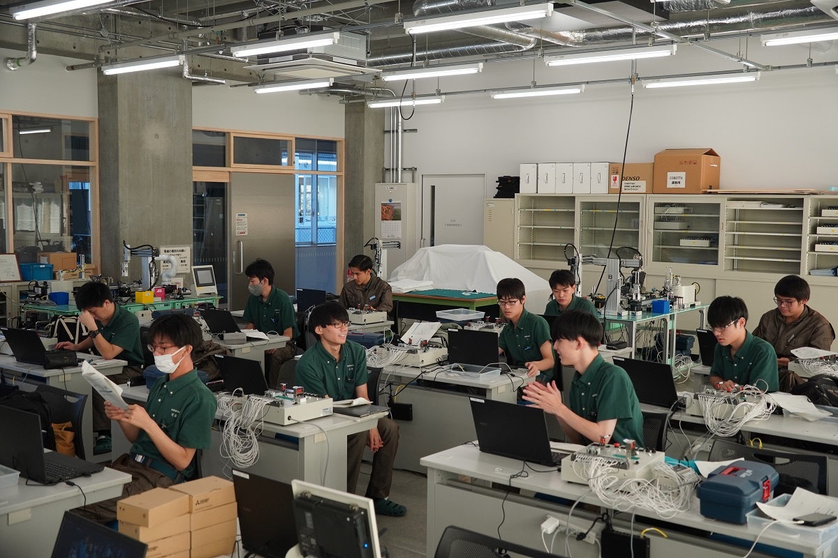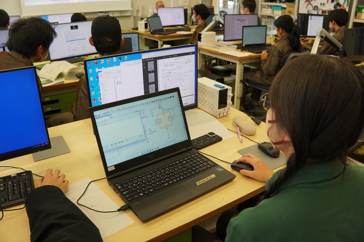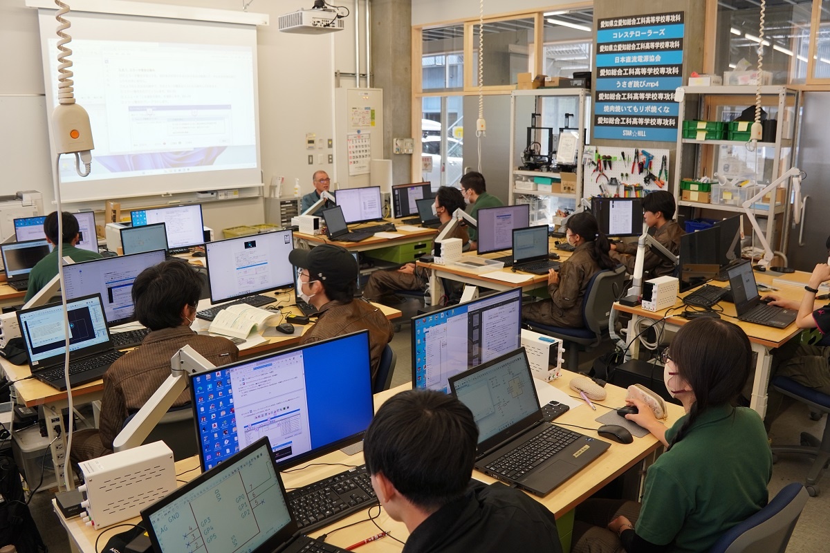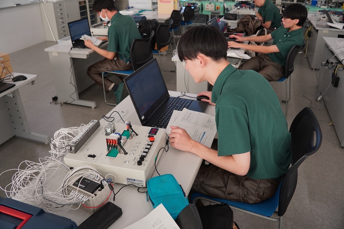今日はコース実習(1年生)でした。自動車・航空コースは「CAD(作図・2D出力)」、電気・制御コースは「シーケンス・PLC(PLCプログラミング)」、情報・ITコースは「電子回路設計・製作1(電子回路・基盤設計)」、電子・ロボットコースは「Pythonプログラム応用(超音波センサ活用)」にそれぞれ取り組みました。