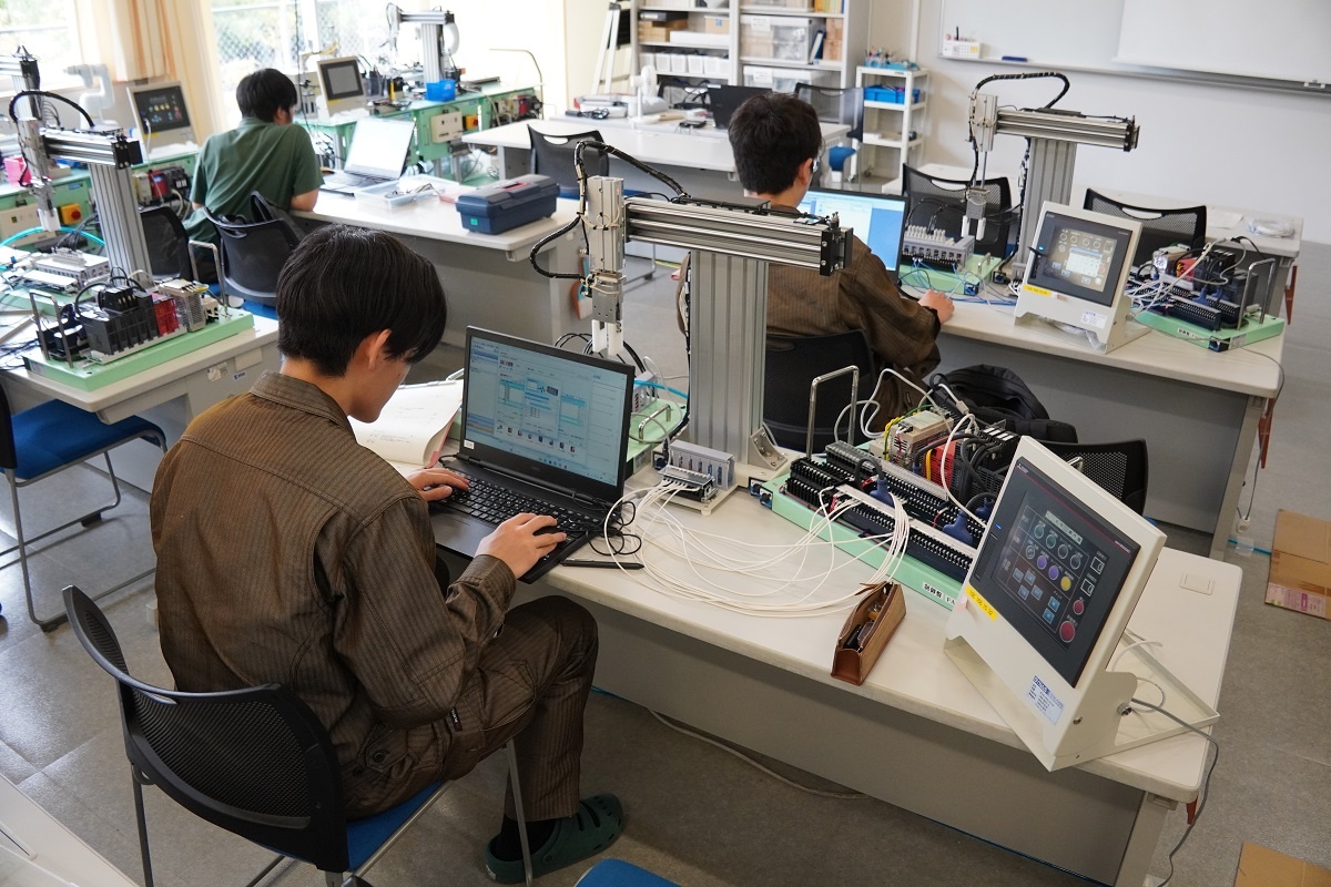 今日はコース実習(2年生)でした。 自動車・航空コースは「内燃機関先端技術(今後のパワートレイン)@パーソルR&D」、電気・制御コースは「車両開発周辺技術(特許調査)」、情報・ITコースは「パワーエレクトロニクス(ACサーボ基礎)@三菱電機」、電子・ロボットコースは「操作パネル設計(シーケンス回路設計)」に取り組みました。