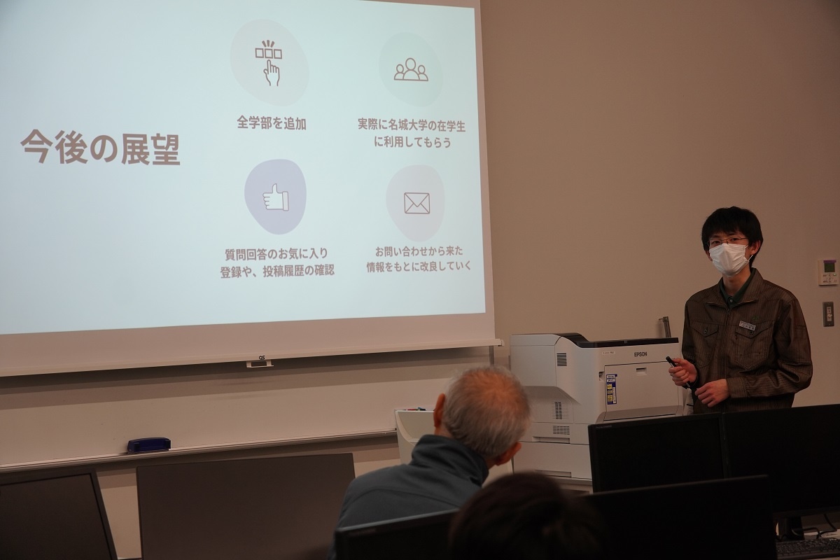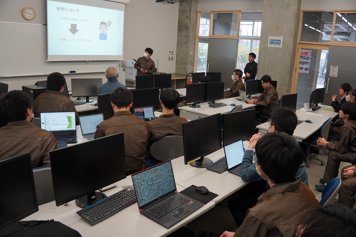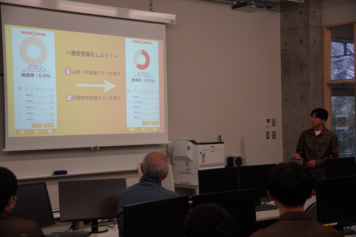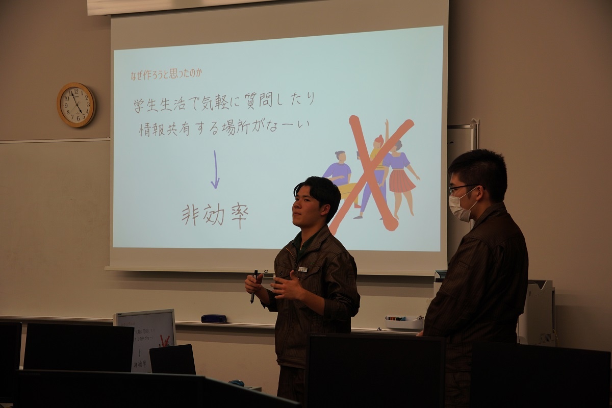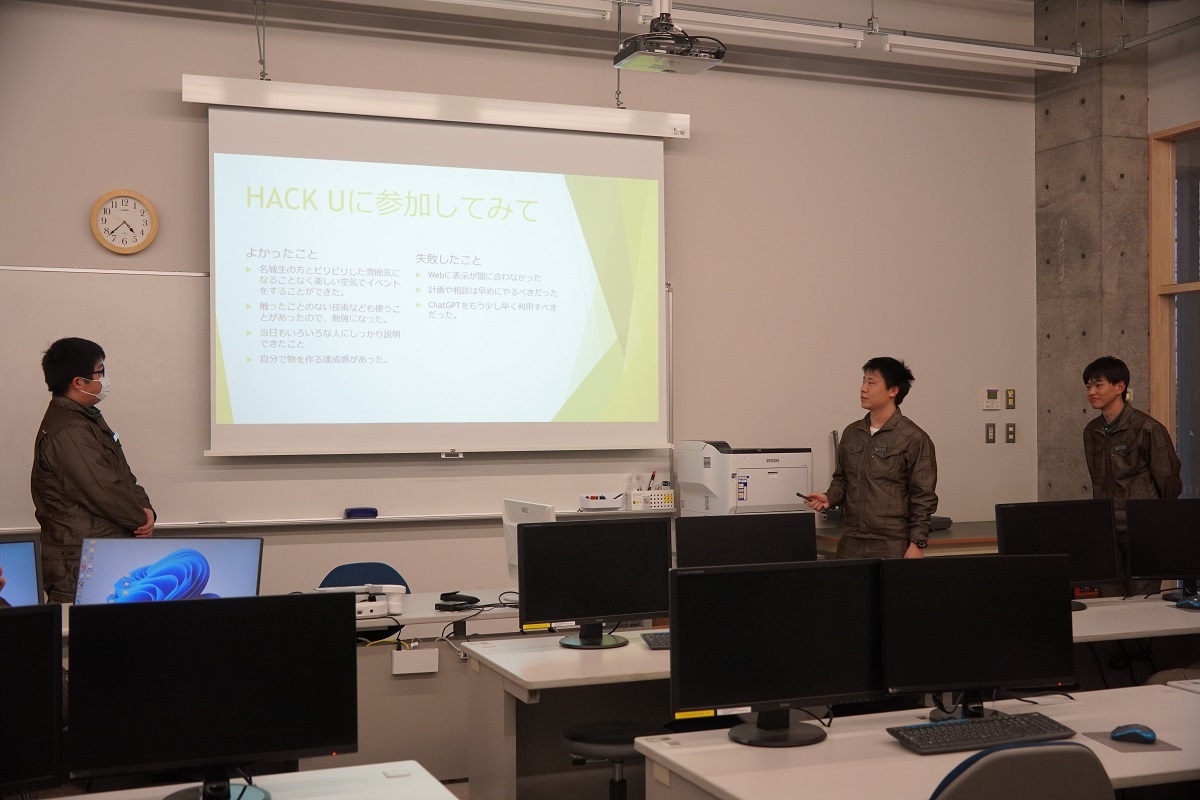 今日の4限は1年生、2年生合同で学習成果発表会の事前準備でした。リーダー会が主体となって会場設営やリハーサルなどに取り組みました。 また「HackU名城大学」の校内発表会(自由参加)が行われ、12月16日に名城大学で開催された内容について、参加者がプレゼンを行いました。