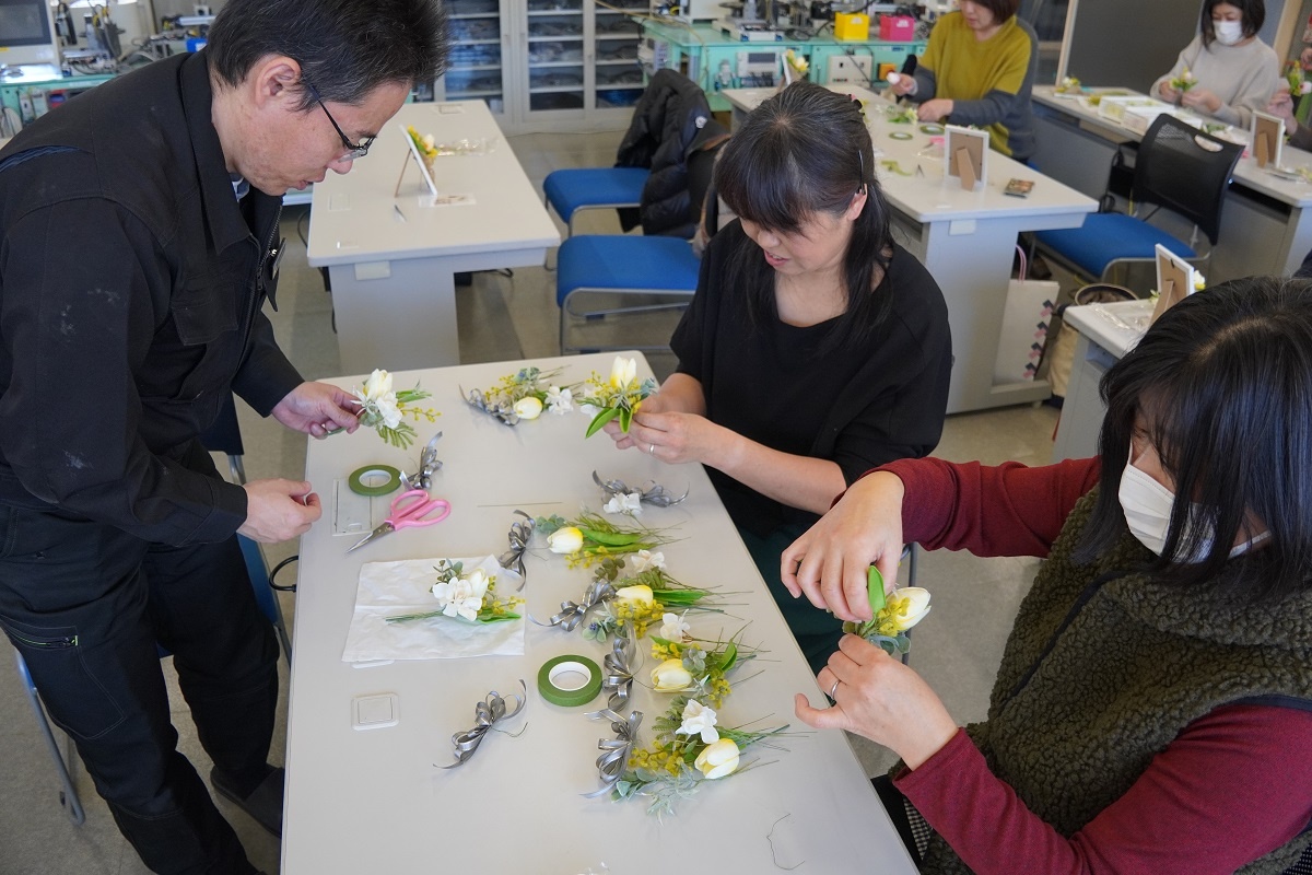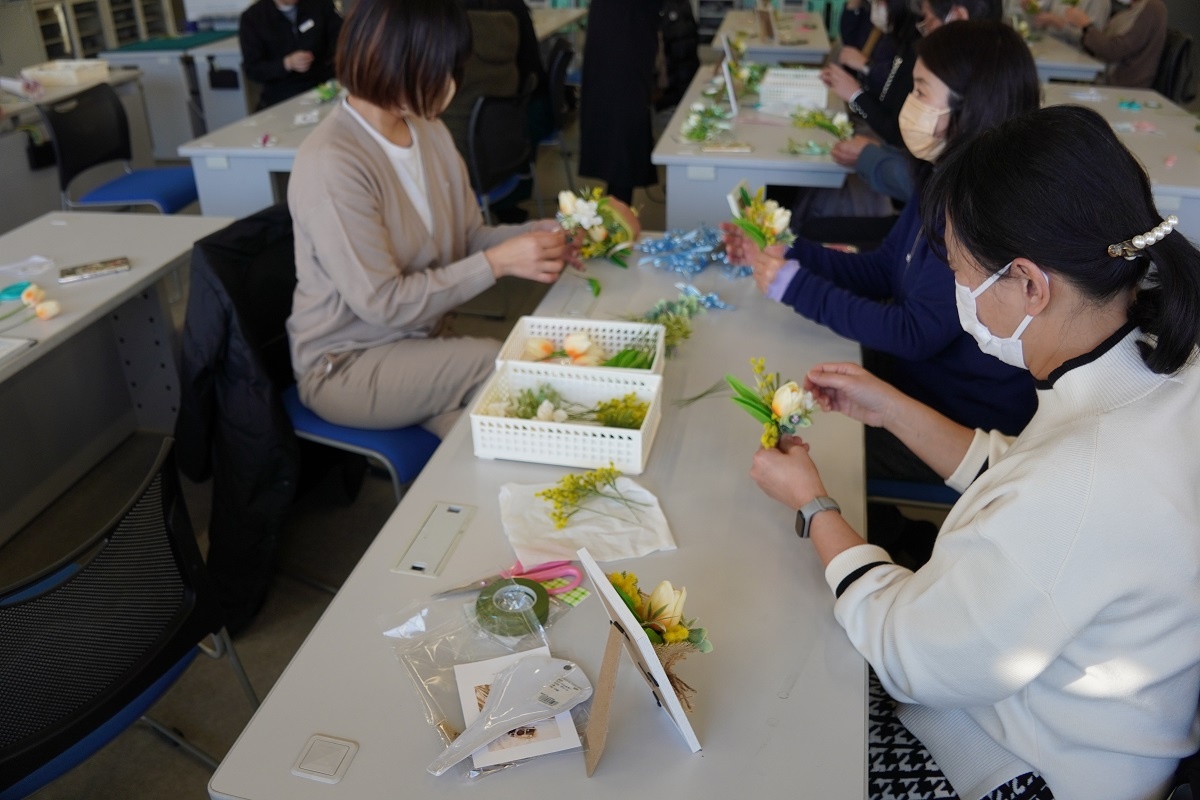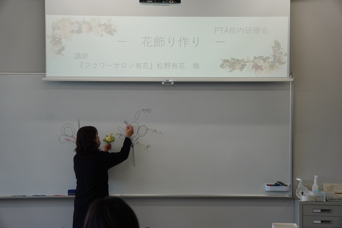 今日は午後から「第2回 PTA校内研修会 花飾り作り」が行われました。フラワーサロン有花 松野様を講師にお迎えし、アーティシャルフラワー(本物そっくりの造花)で花飾りを作りました。多くのご参加をいただき、素敵な作品が完成しました。