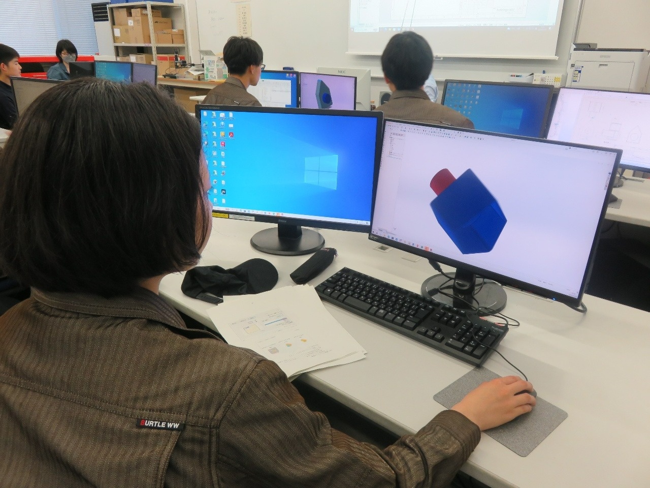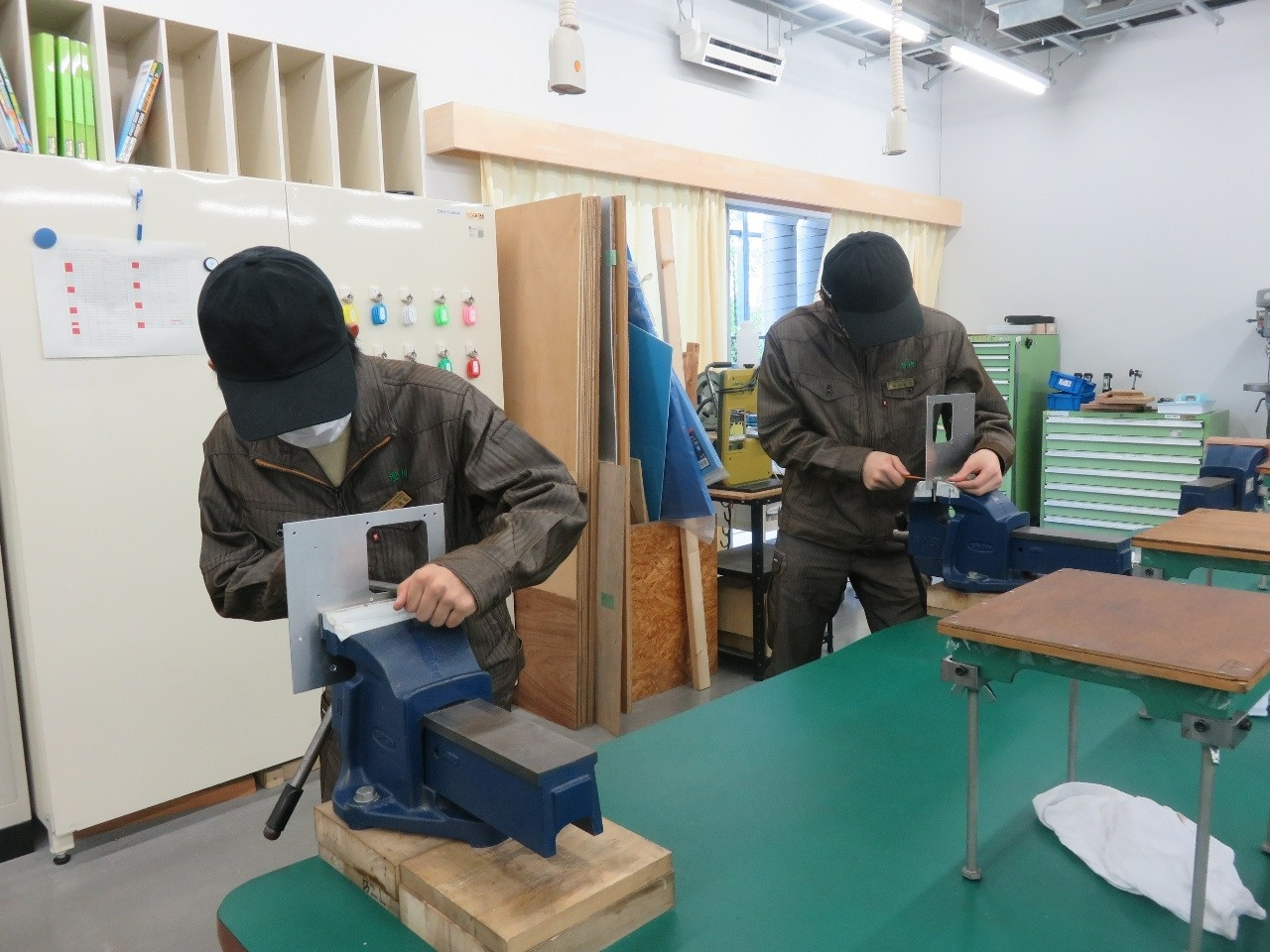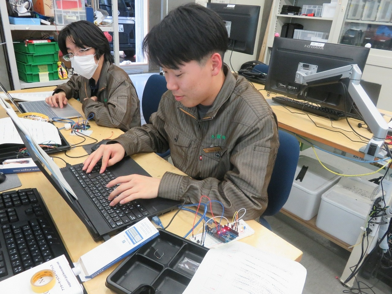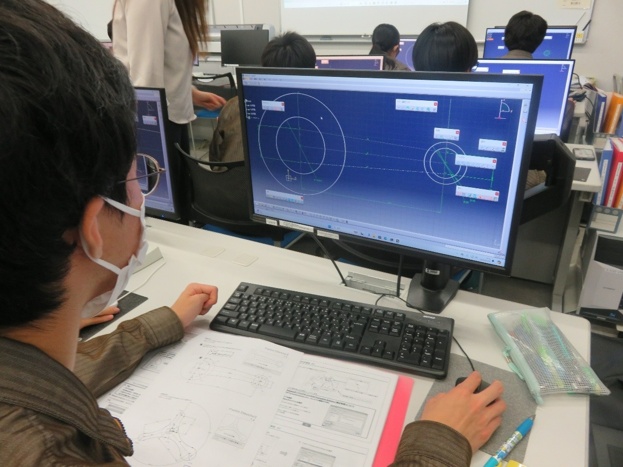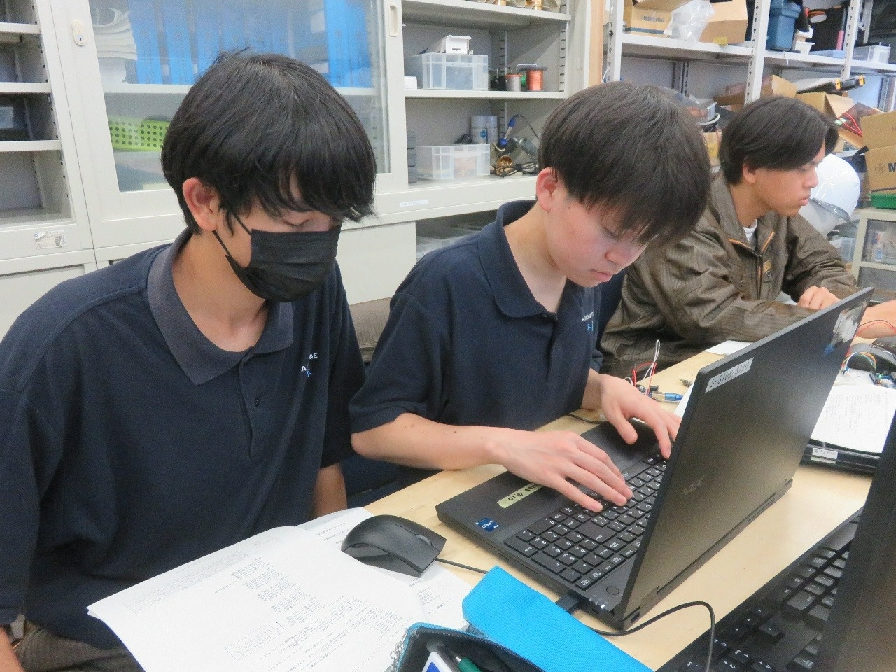 今日はコース実習(1年生)でした。 自動車・航空コースは「電気基礎実習」、電気・制御コースは「CAD(SW)」、情報・ITコースは「機械基礎実習1」、電子・ロボットコースは「CAD(CT)」に取り組みました。
