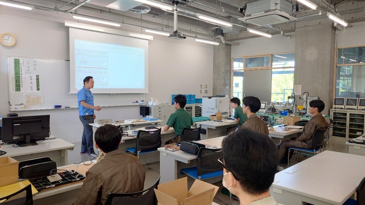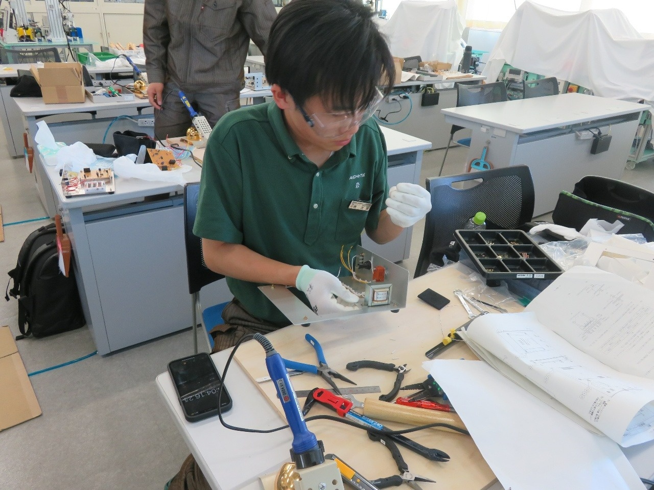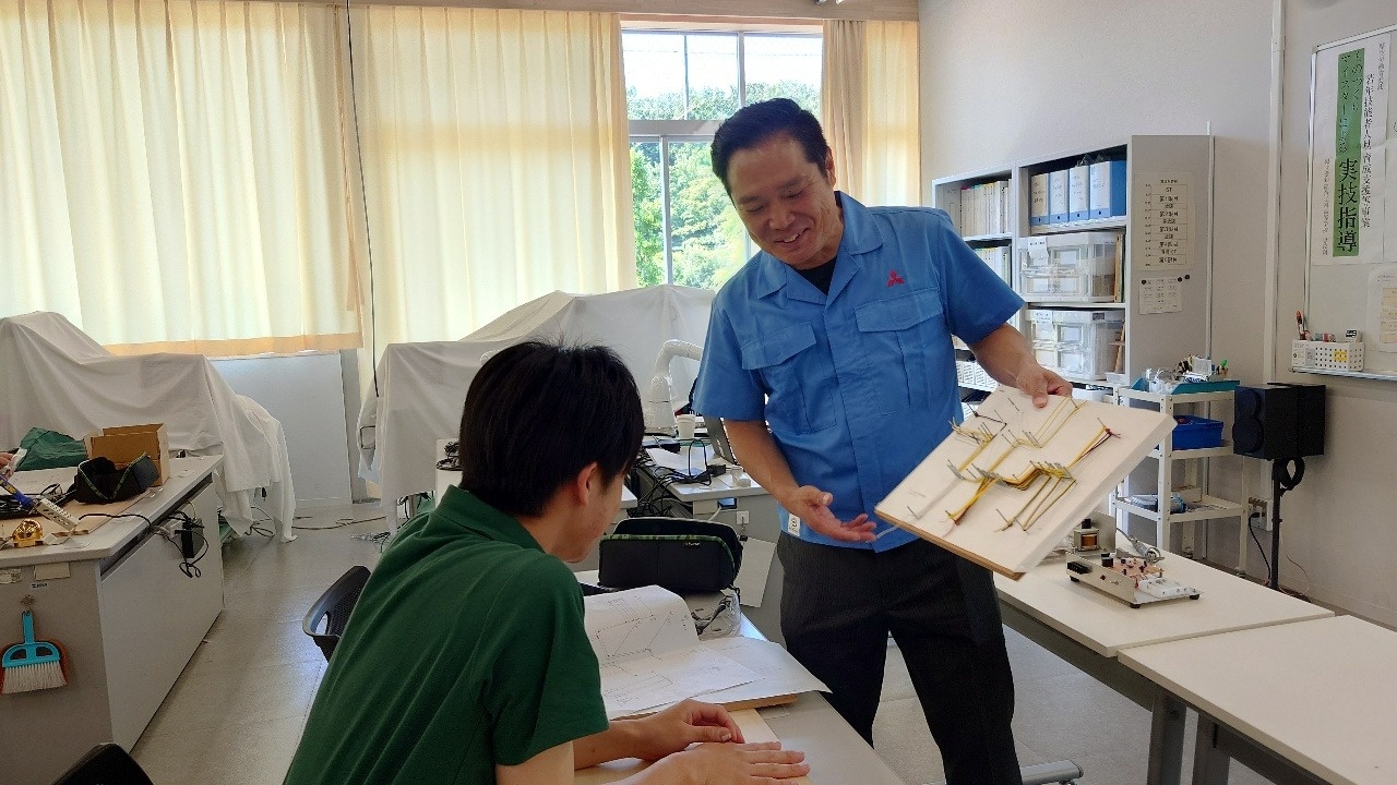 今日は技能検定の電子機器組立て2級の合格のため、愛知職業能力開発協会のものづくりマイスター派遣制度を活用した実技指導の最終回でした。これまで土曜日の午前中に4回、三菱重工業の松本様にお越しいただき、希望した生徒や職員に指導を頂きました。