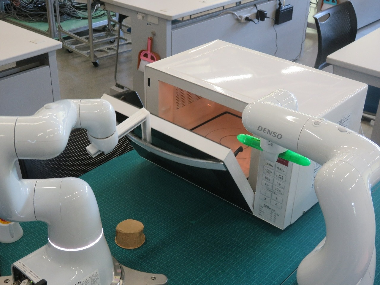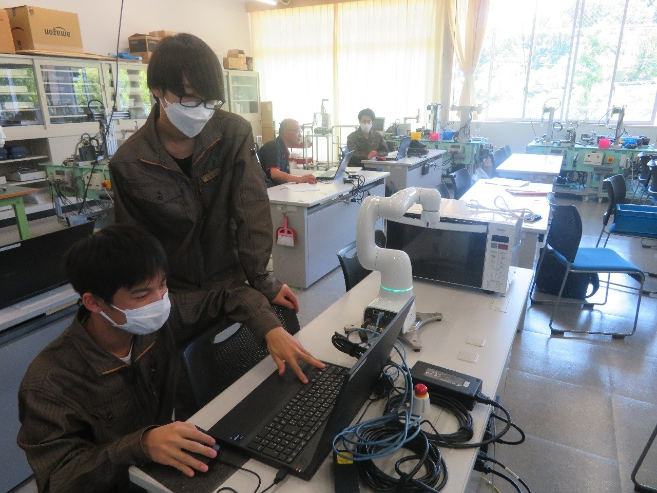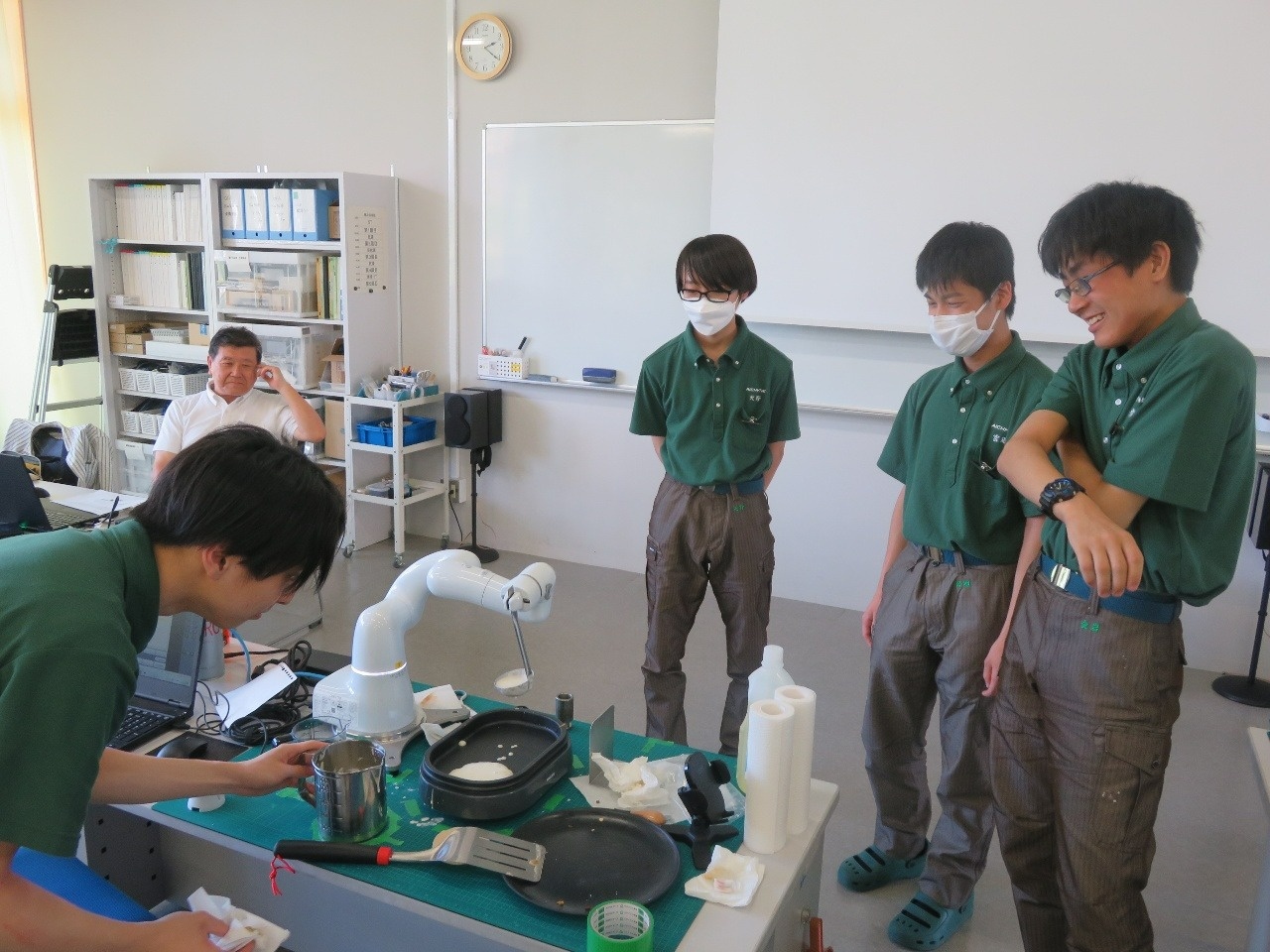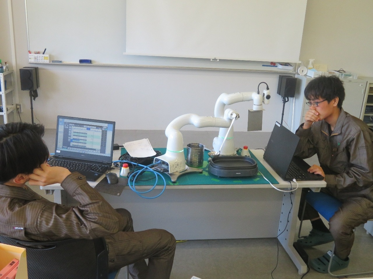 今日は1年生が総合実習でした。『人協働ロボット活用システムの開発と実践』班では、デンソーウェーブが開発した産業用人協働ロボットの「COBOTTA」を使ってシステム開発に取り組んでいます。COBOTTAにパンケーキを焼く動作をさせる班と、カップケーキを焼く動作をさせる班に別れ、期待通りの動作ができるまで繰り返しプログラムの微調節を重ねています。