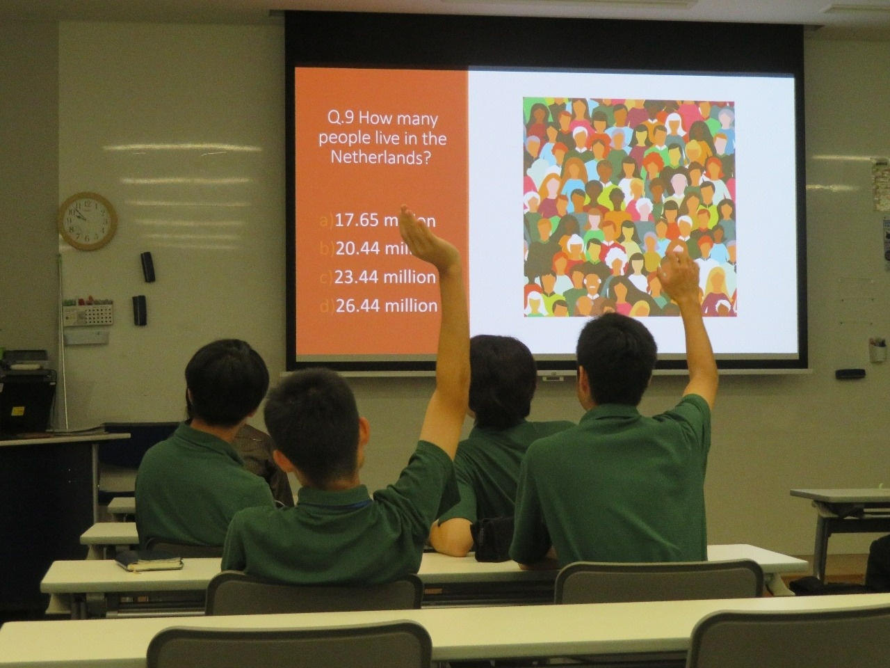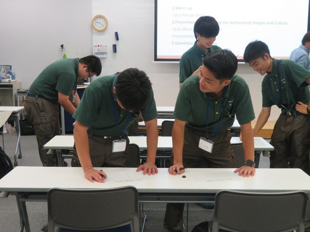 今日はグローバルキャンプ一日目でした。「日常英会話の基礎を学ぼう」「学習内容の成果を英語で発表しよう」という内容で、本科の生徒も一緒になって今日から三日間おこないます。今日は英語での自己紹介やオランダに関するクイズなどを生徒同士協力しておこなう様子が見られました。