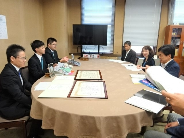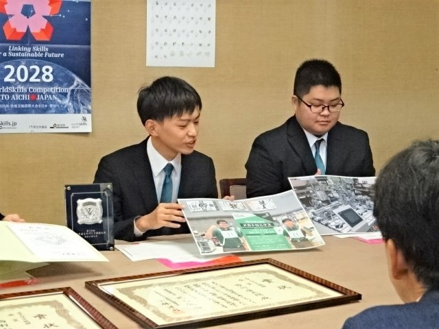 今日は、「電気系・高度ものづくり技能の追求と実践(メカトロニクス)」班の二人が愛知県庁へ表敬訪問に伺いました。労働局長の大嵜様らに、若年者ものづくり競技大会で金賞を受賞したことを報告し、大会で緊張したことや、大会に向けて練習を頑張ったことを話しました。終始なごやかな雰囲気で懇談し、お祝いの言葉をいただきました。2028年の技能五輪国際大会の愛知開催が決まった矢先の訪問ということで、出場することになった技能五輪全国大会を少しでも盛り上げていけるように、ますます練習に励もうと気持ちが引き締まりました。