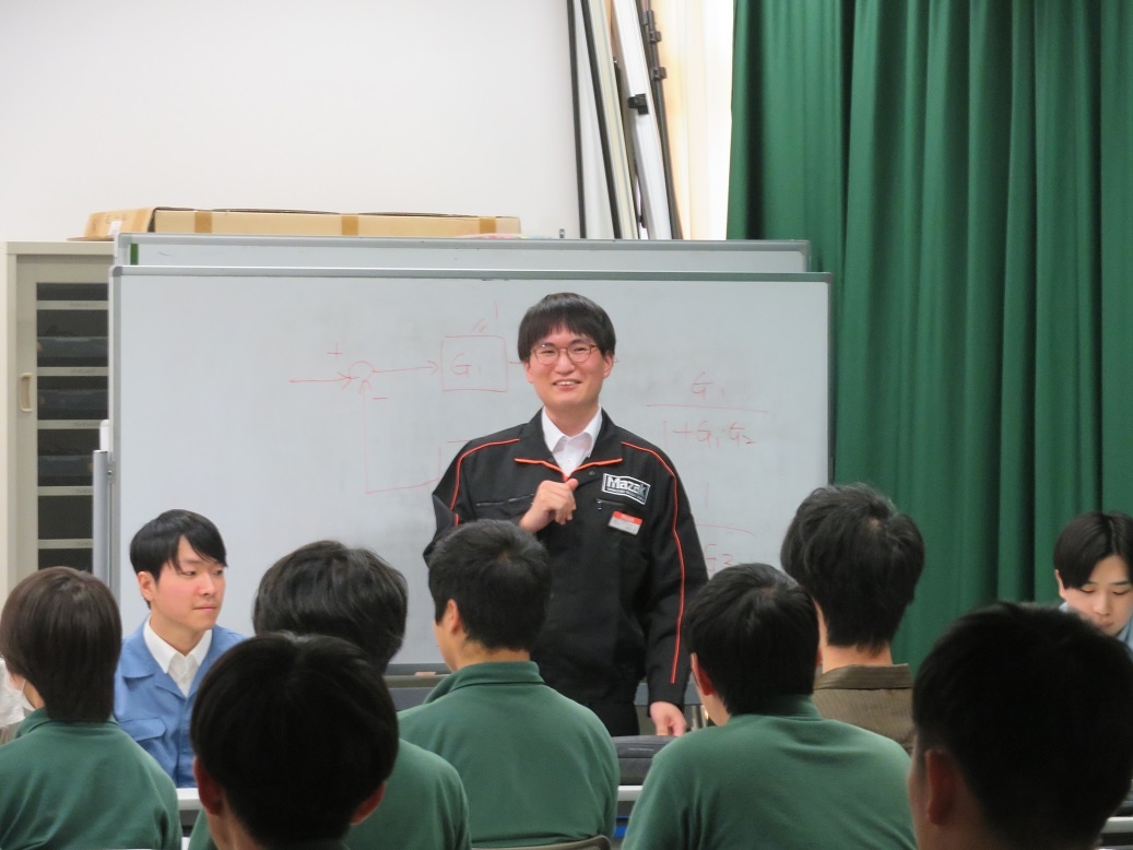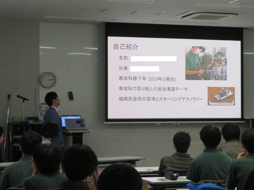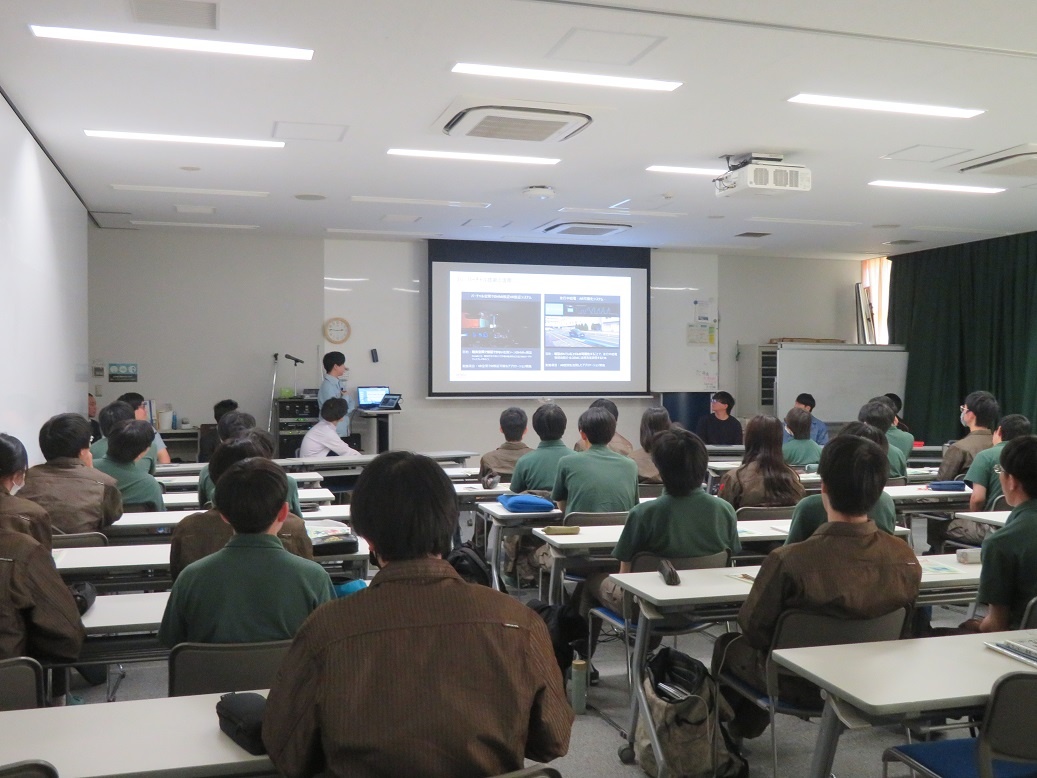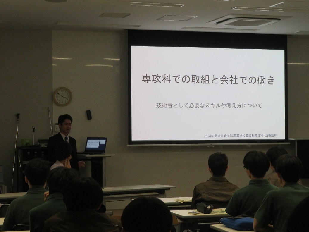 1年生4限「総合実習」では『進路セミナー2024』が行われ、専攻科修了生7名が「専攻科での取組と会社での働き」というテーマで講演をしてくれました。 ディスカッションも行われ、進路を考えたり、2年間の専攻科生活を送ったりするうえでの経験談など、実際の先輩の交流という貴重な経験をすることができました。