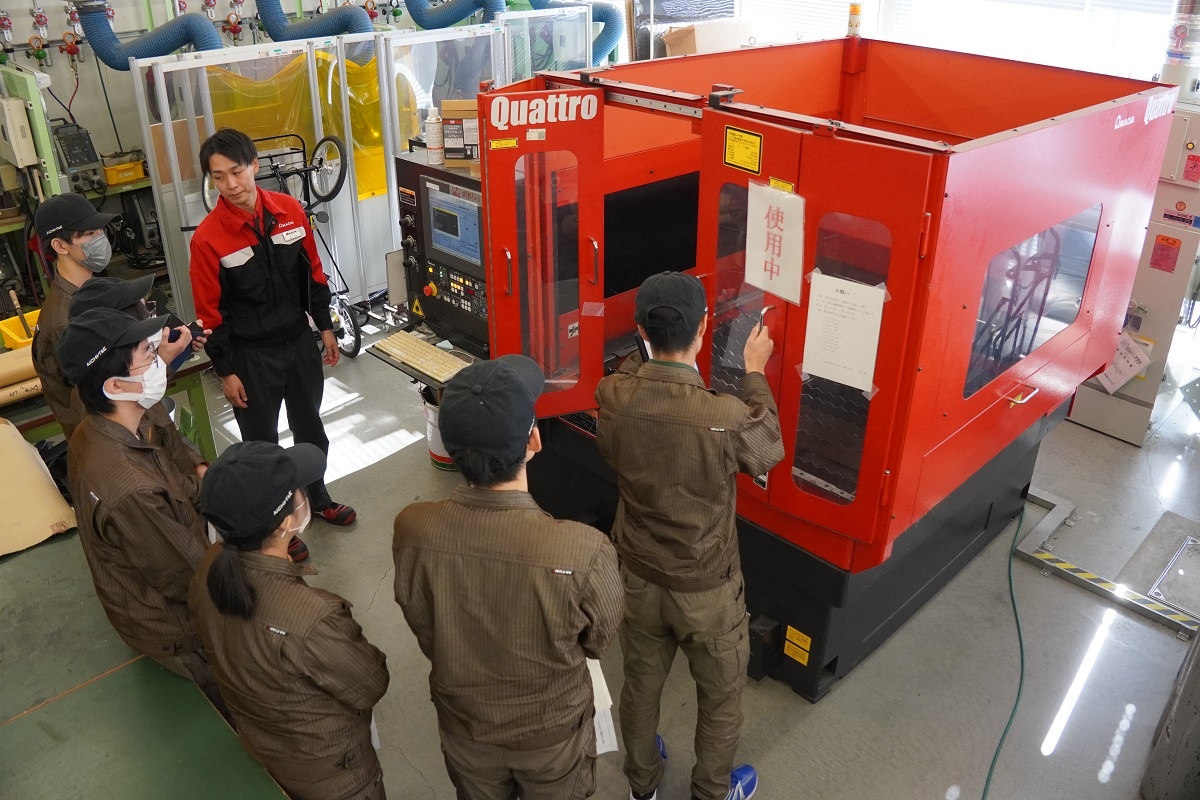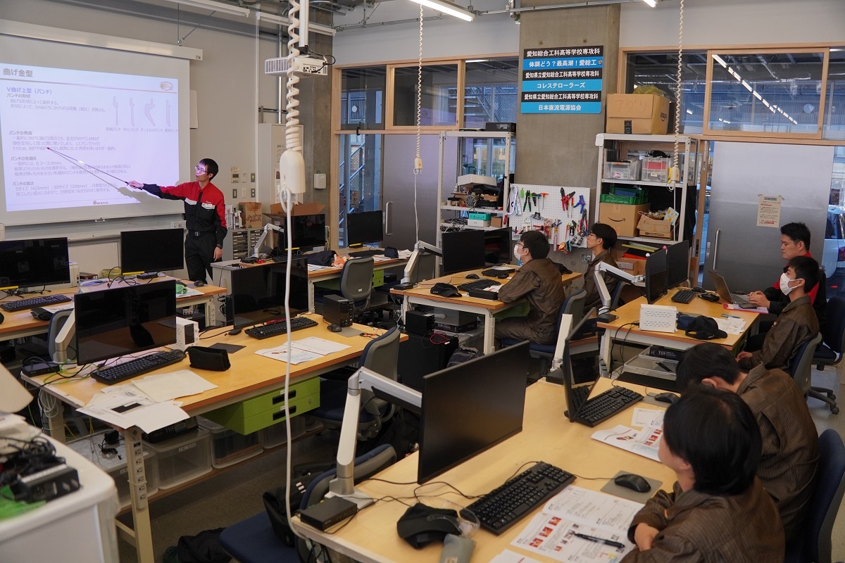 今日は1年生がコース実習でした。自動車・航空コースは「空気圧制御@SMC」、電気・制御コースは「製品開発設計」、情報・ITコースは「車両開発周辺技術」、電子・ロボットコースは「レーザー加工・プレス板金」に取り組みました。