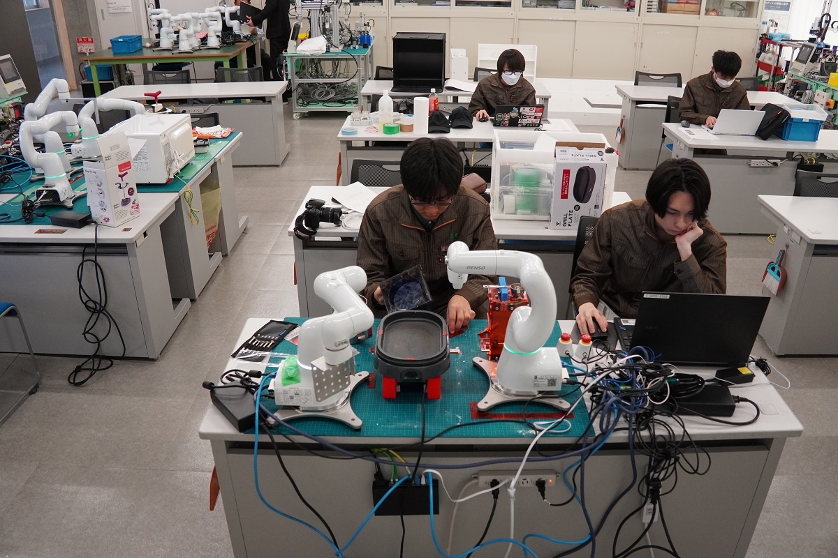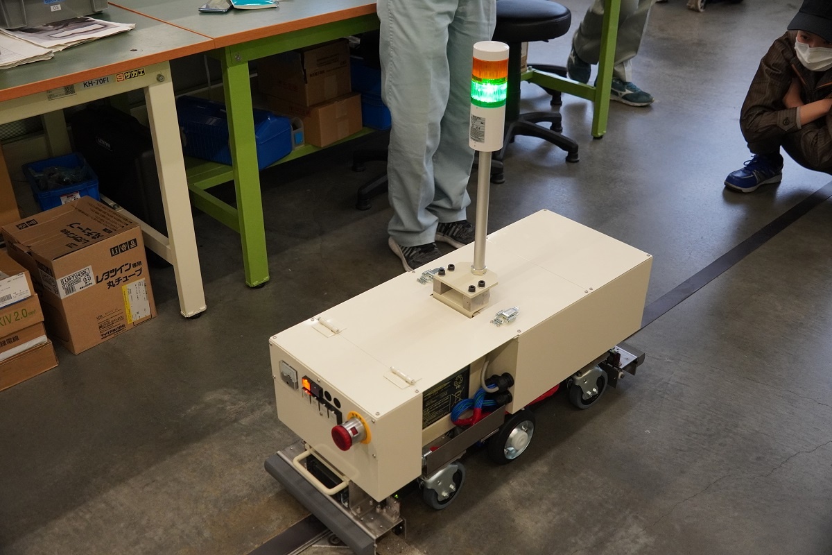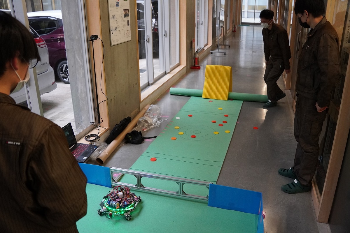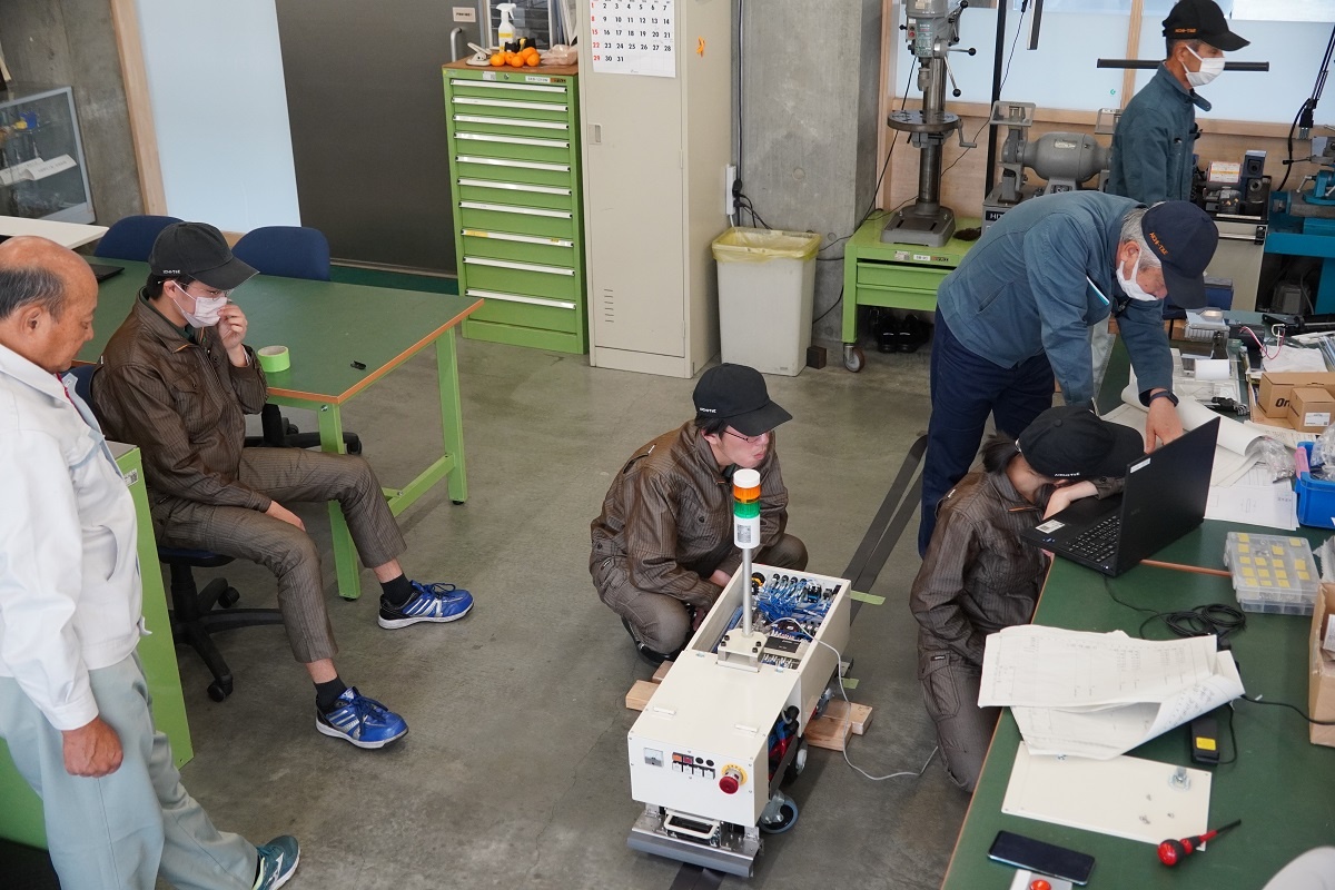 今日は1年生が総合実習でした。「マシンデバイスの共同開発」班は、ついに、AGVがラインに沿って動きました。また、「先端小型ロボットの開発と製作」班は、週末、岡山県で開催される「第29回つやまロボットコンテスト」に向けて最終調整に取り組みました。