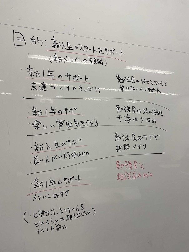 ピア・サポーターは年内最後のミーティングを開いて、1年の活動を振り返りました。今年は新規に「名城大学での新入生支援イベント」「『キャリアプランニング』での講師」「専攻科1年生向け就活企画」を行いました。特に名城大学の新入生に向けた活動については、歴代の先輩方が築いてきた名城大学との連携基盤があって、この成果に繋げることができました。振り返りでは、「ピア・サポート活動では、組織のなかで自分がどのような役割が果たせるかを考えて実践した。全体を俯瞰して足りない部分の作業を行うことで、トラブルが発生した際の迅速な解決に努めた。この経験から自分の役割を自覚することに繋がり、総合実習でもトラブルシューティングを遂行できていると思う。」、「学年や学校の壁を越えて活動できたピア・サポート。この経験はこれから総合実習の大会で後輩と協力する場面や学校外の人と初対面で関わる機会にも実を結ぶだろう。引き続きコミュニケーション能力を活用して頑張りたい。」という思いが共有されるなど、来年のピア・サポート活動に向けての抱負が述べられました。