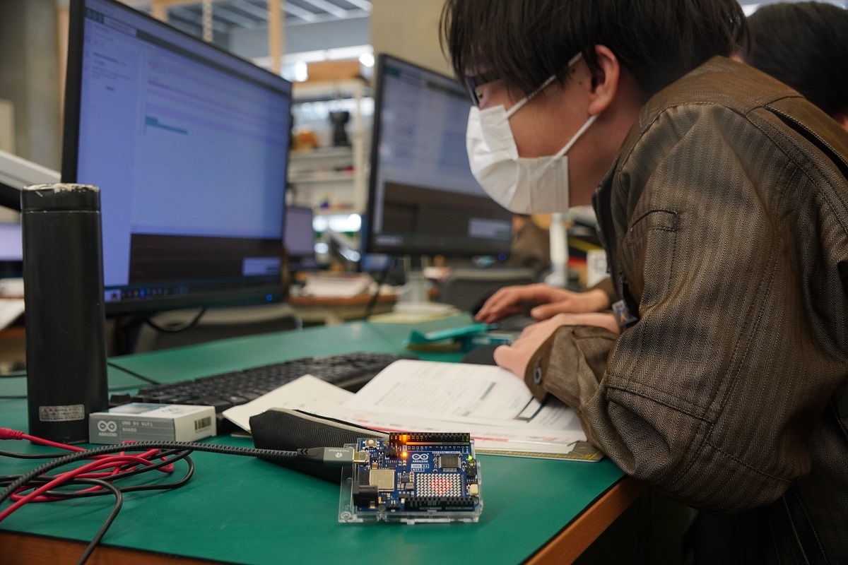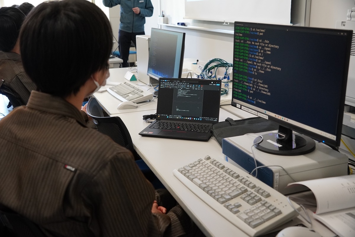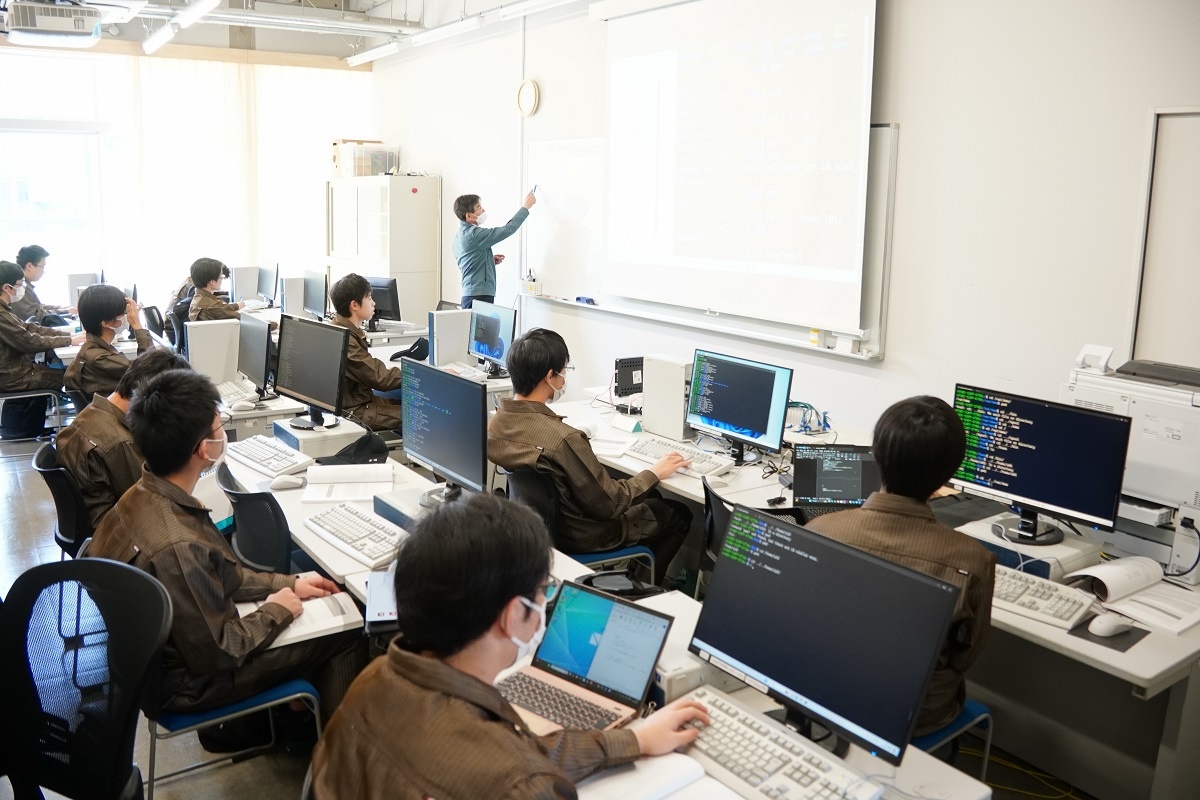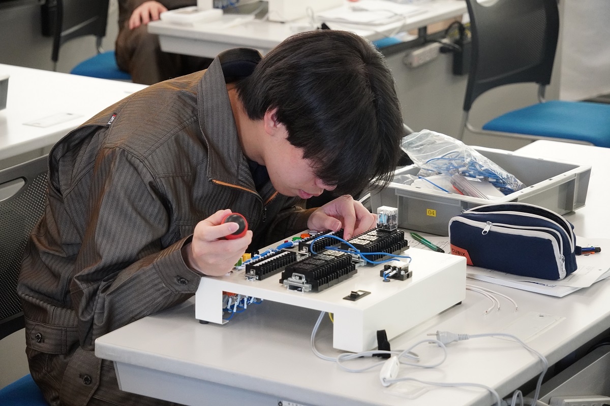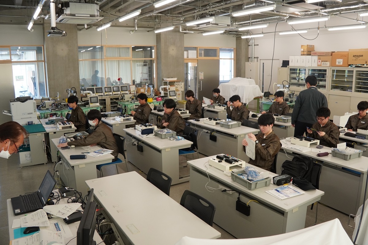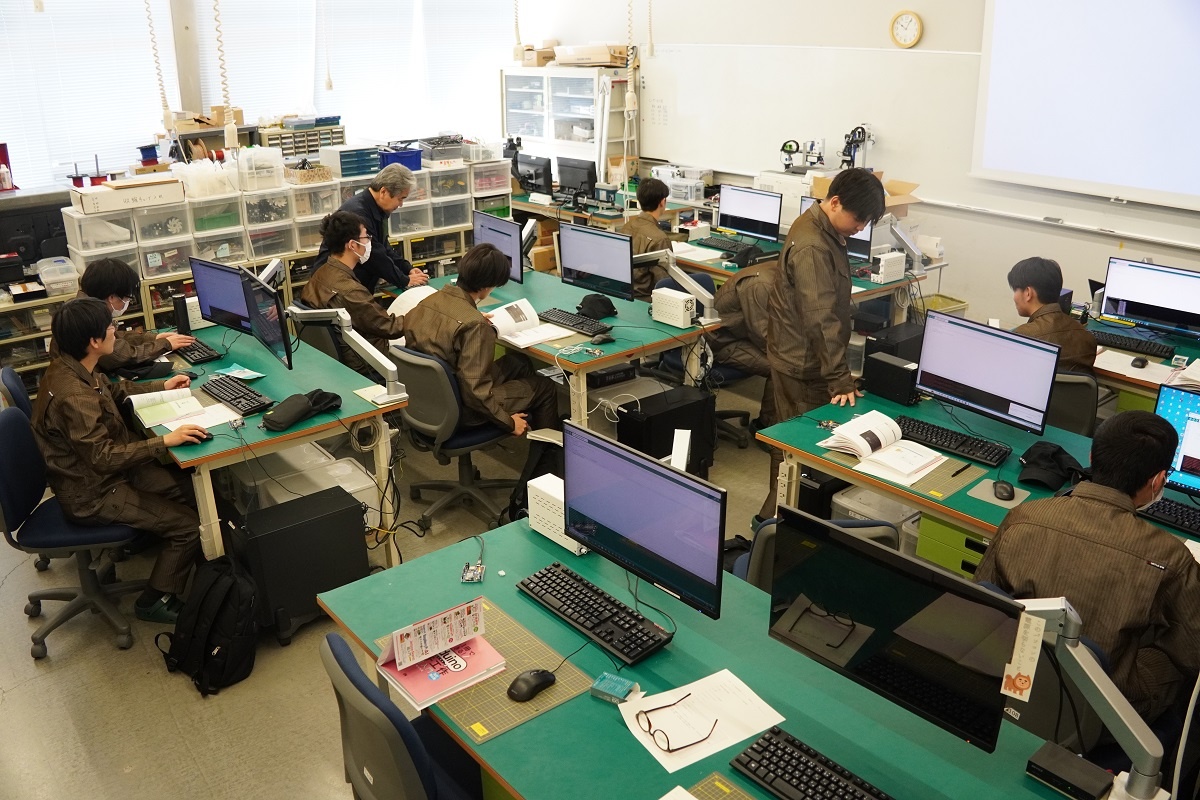 今日は授業日で、1年生はコース実習に取り組みました。自動車・航空コースは「機械技術実習1」、電気・制御コース、情報・ITコースは「電気基礎実習」、電子・ロボットコースは「シーケンス・PLC」に取り組みました。