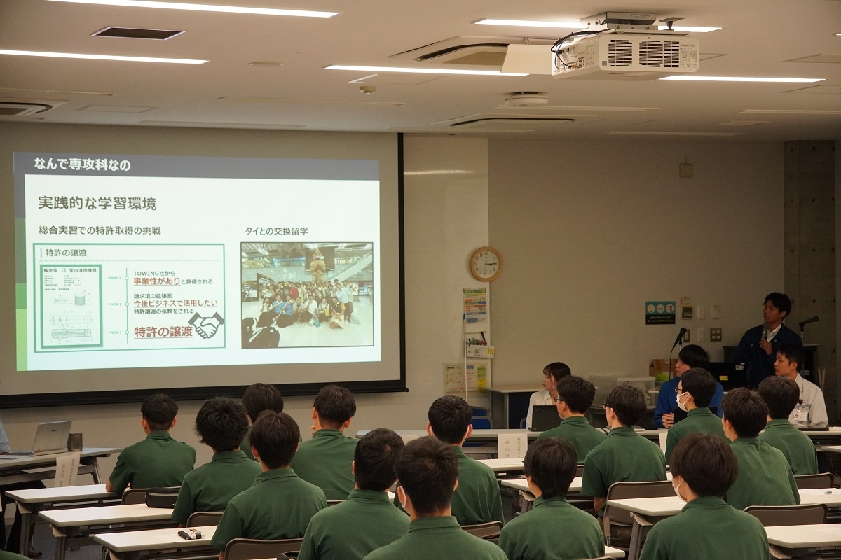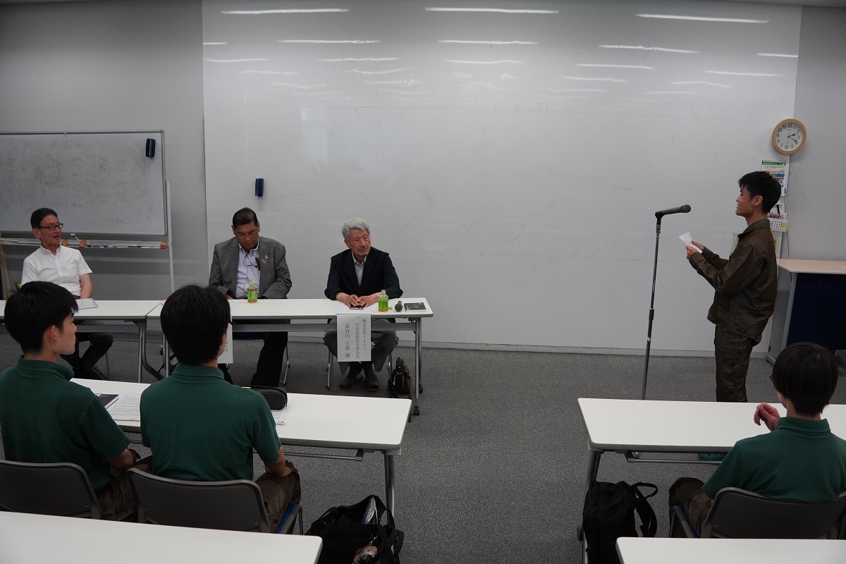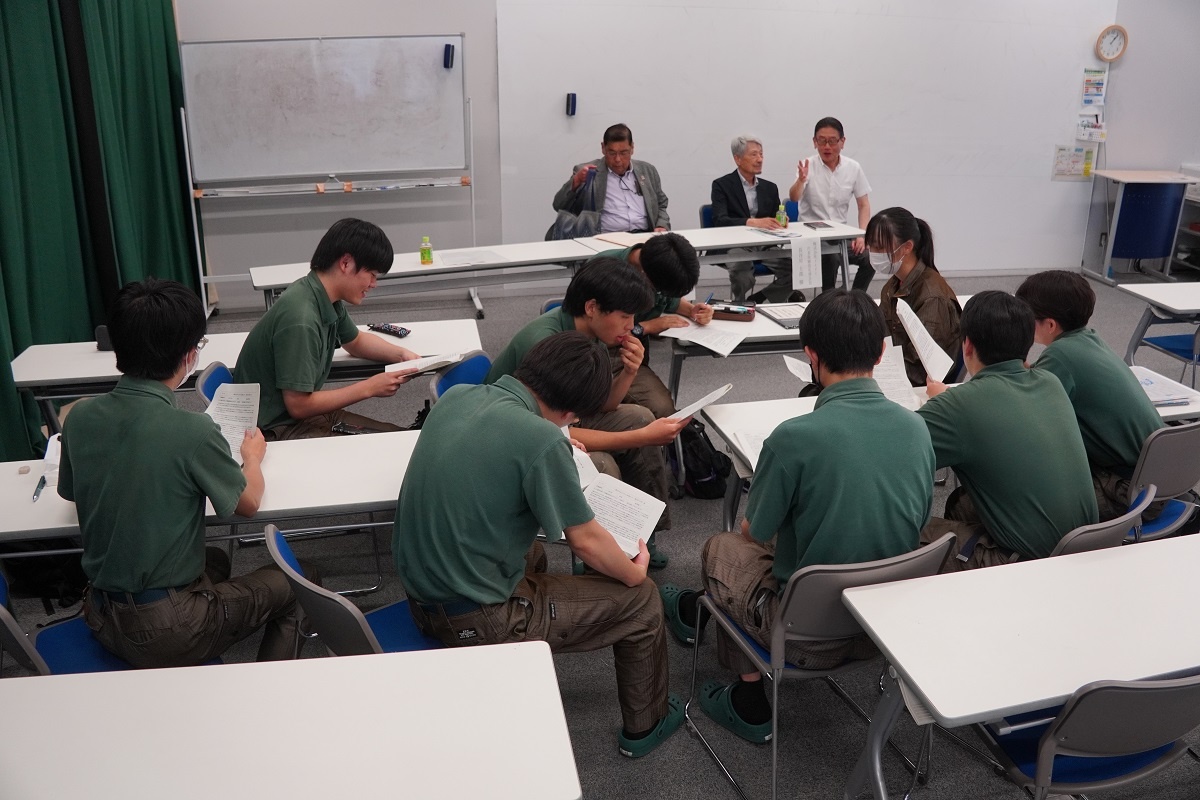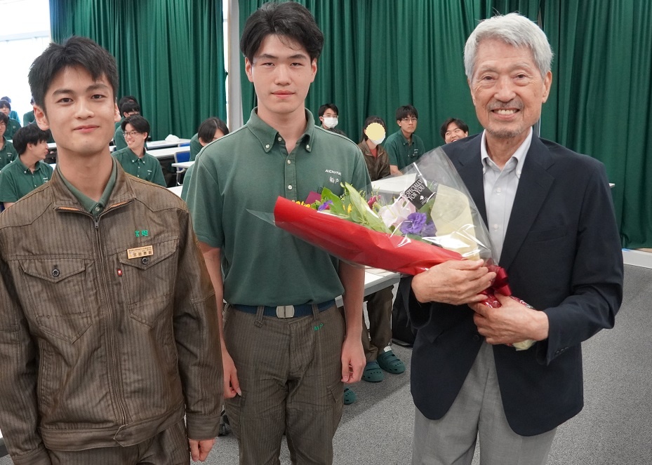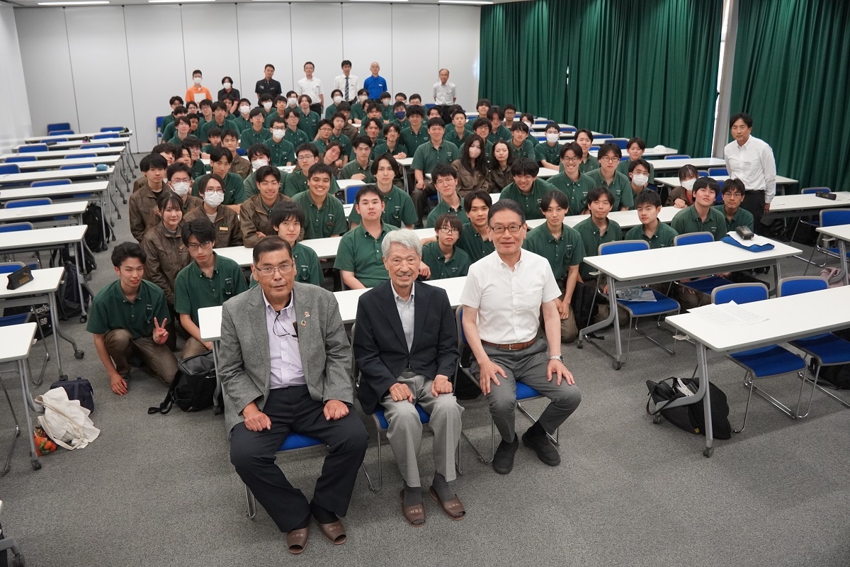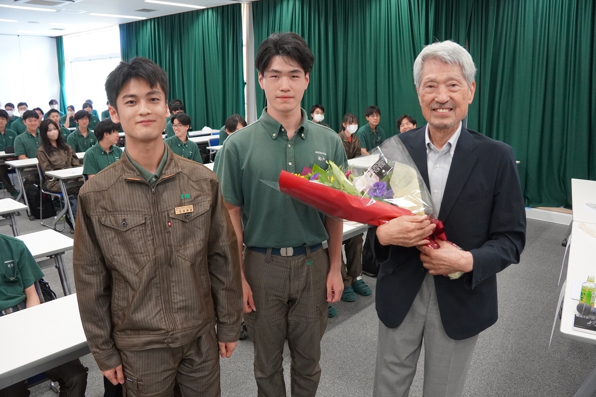 今日3限は1年生・2年生合同の「総合演習」でした。株式会社メイドー代表取締役名誉会長 長谷川様、学校法人名城大学専務理事 小原様をお迎えし、全生徒に寄贈いただいた本「黒子のモノづくり」を読んで協議・発表を行い、お礼を伝えました。 また4限は1年生を対象に「修了生と語る会」が行われました。8名の修了生を迎え、専攻科での経験や仕事の話を聞くことができ、有意義な時間となりました。