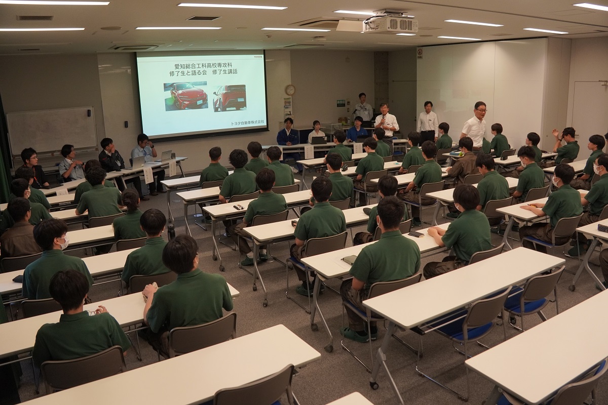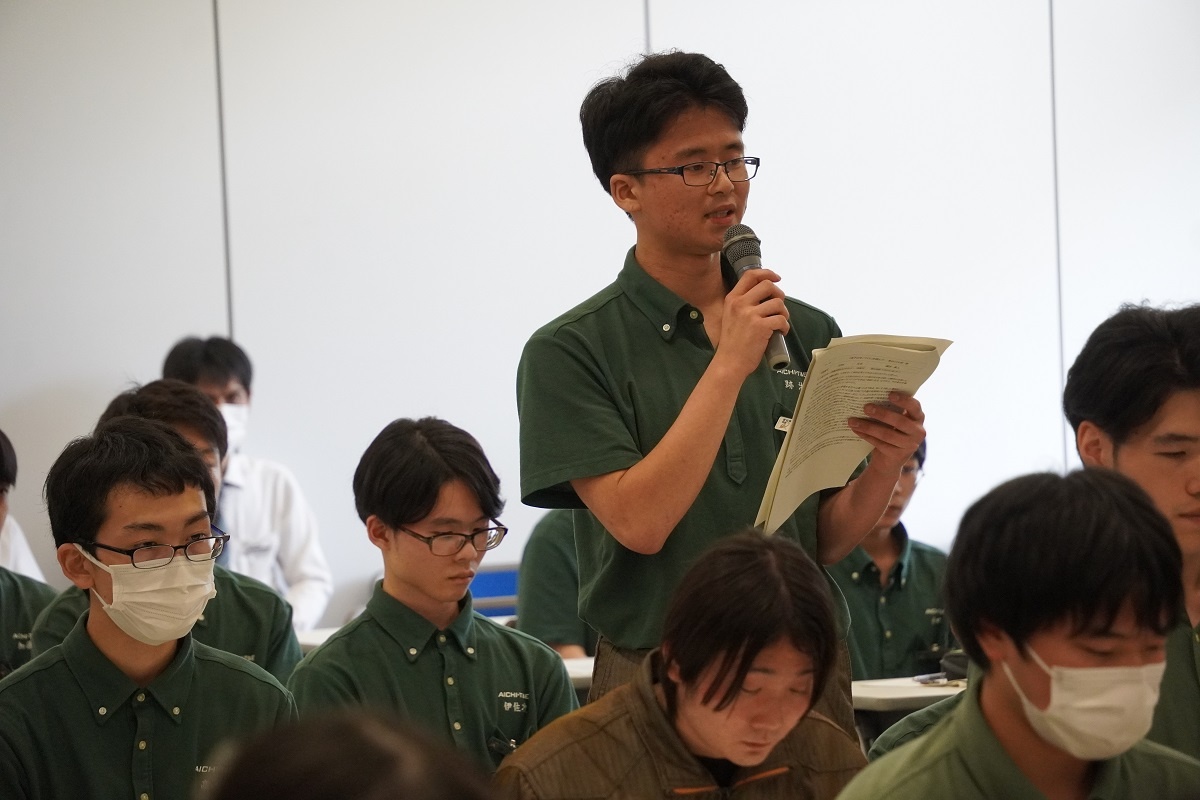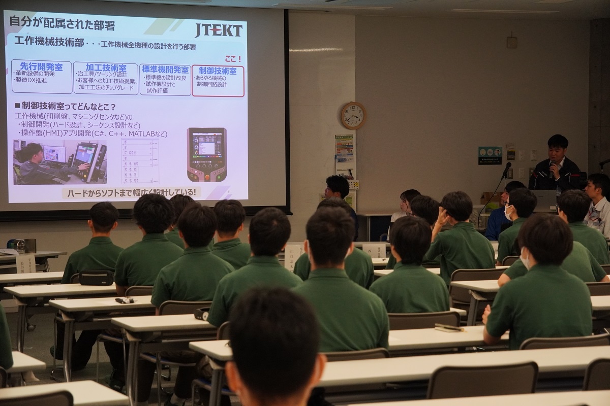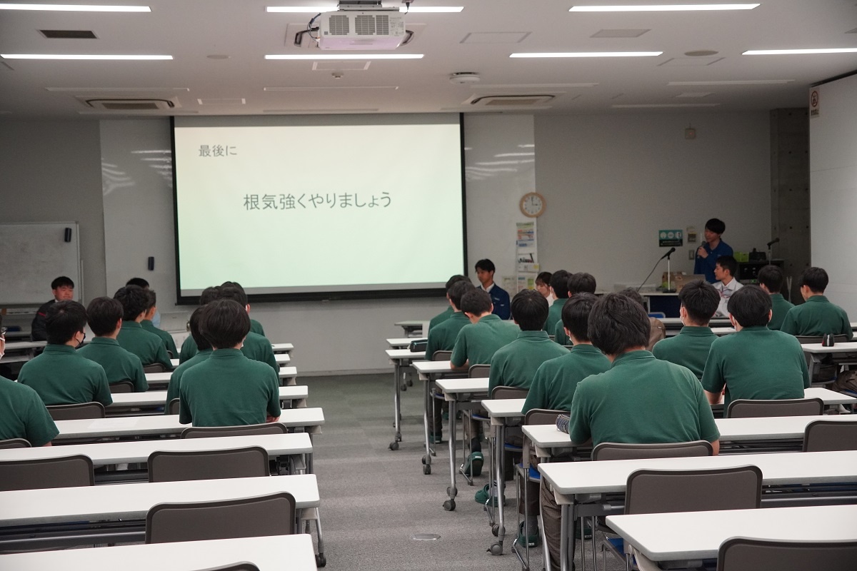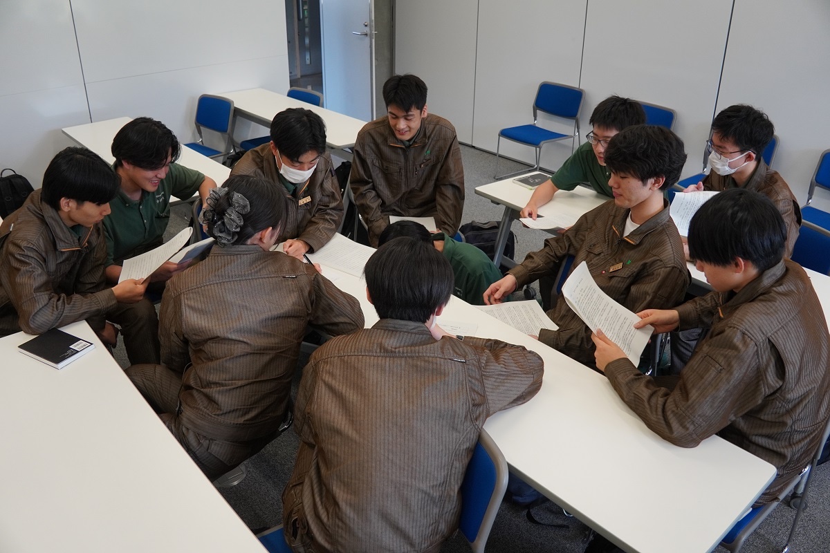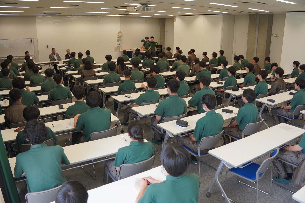 今日3限は1年生・2年生合同の「総合演習」でした。株式会社メイドー代表取締役名誉会長 長谷川様、学校法人名城大学専務理事 小原様をお迎えし、全生徒に寄贈いただいた本「黒子のモノづくり」を読んで協議・発表を行い、お礼を伝えました。 また4限は1年生を対象に「修了生と語る会」が行われました。8名の修了生を迎え、専攻科での経験や仕事の話を聞くことができ、有意義な時間となりました。