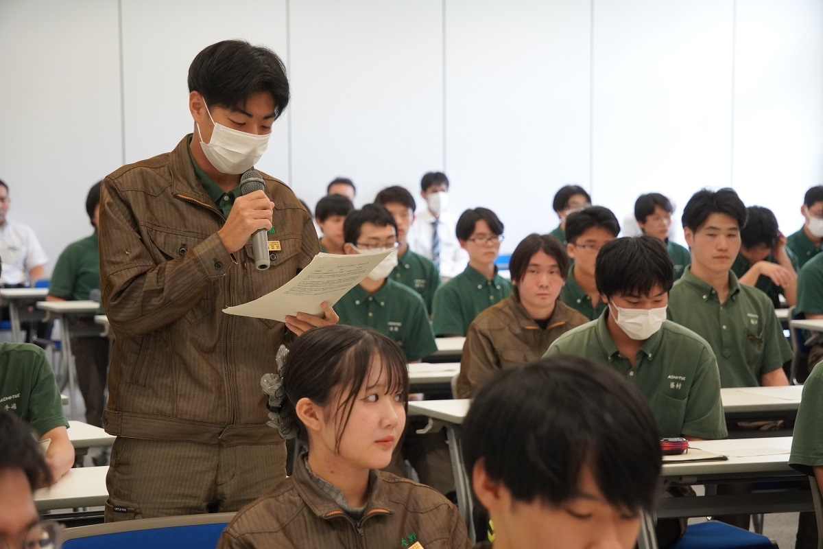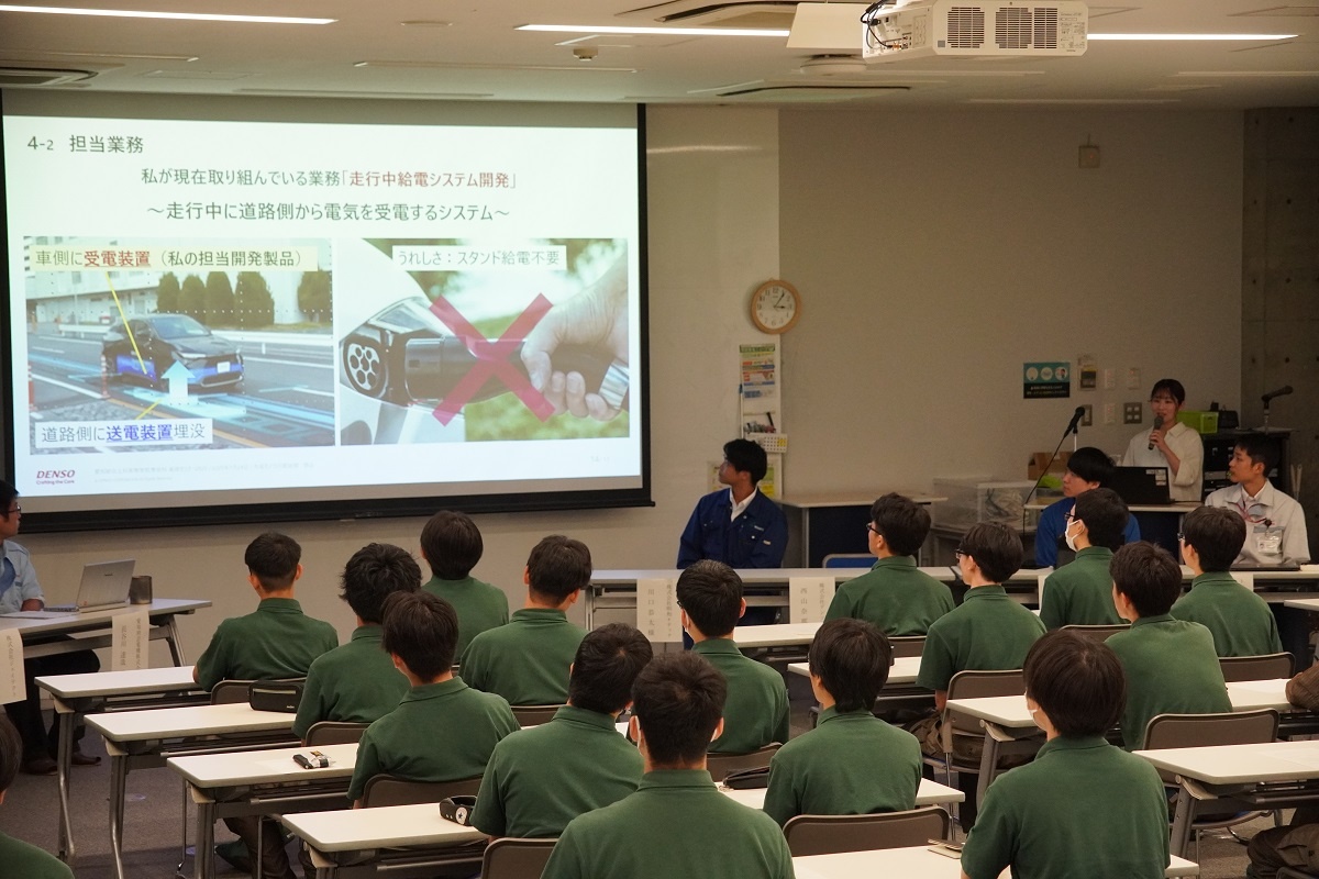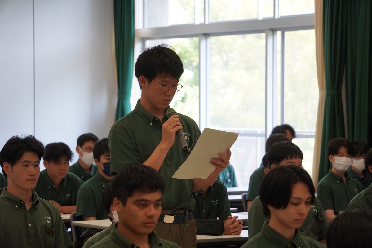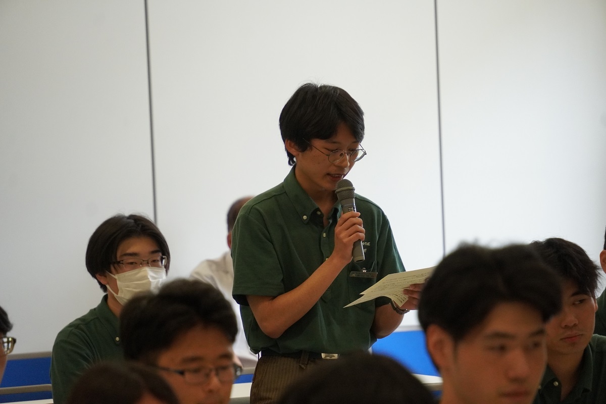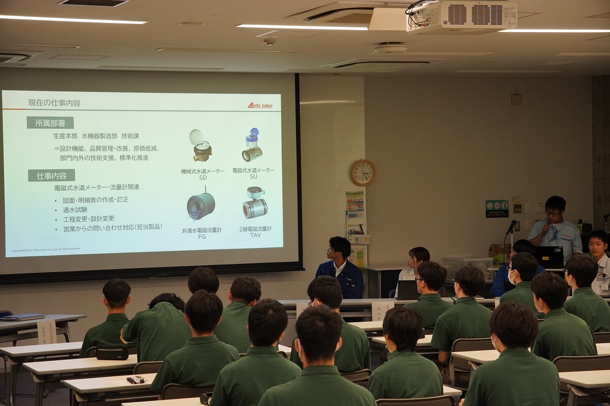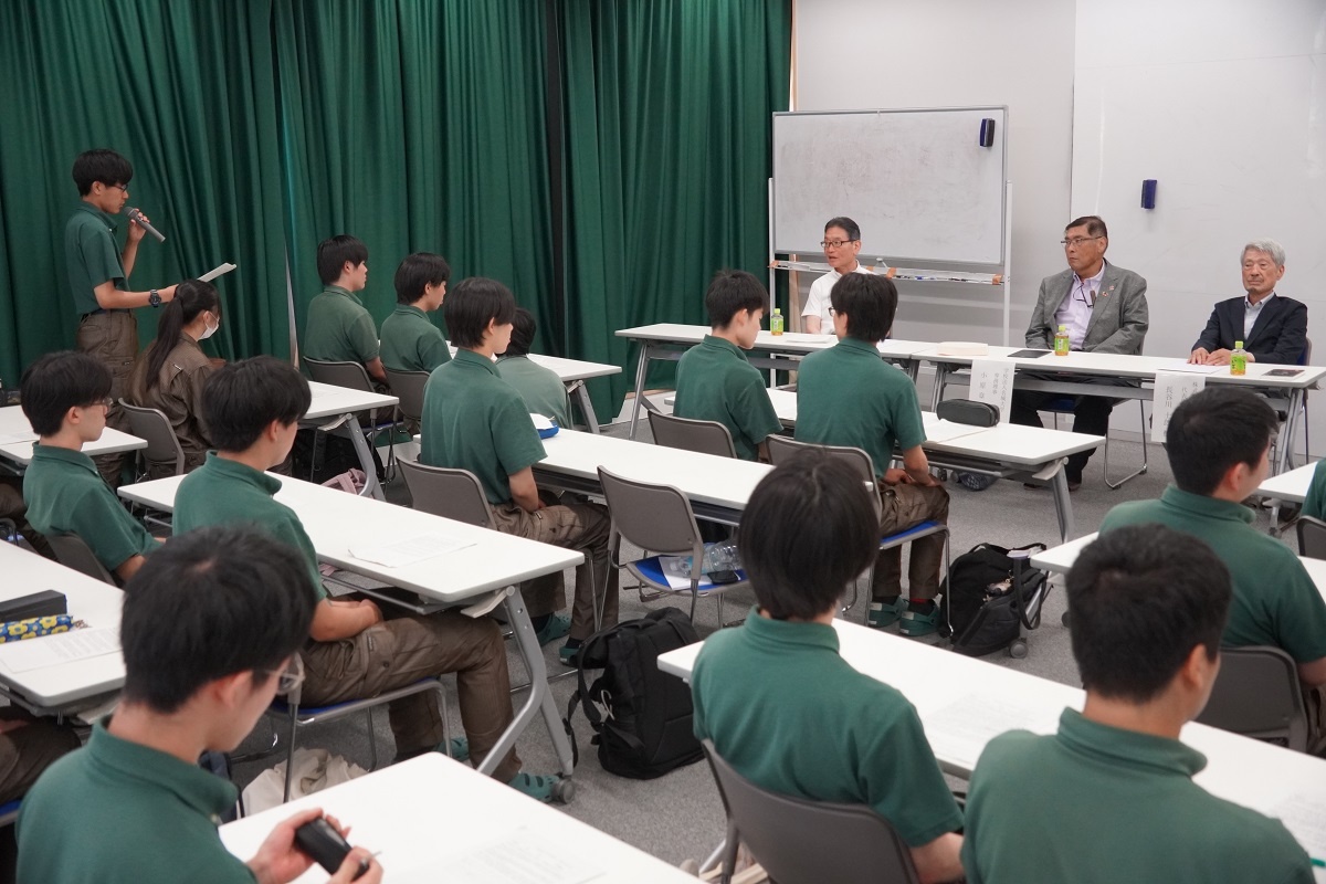 今日3限は1年生・2年生合同の「総合演習」でした。株式会社メイドー代表取締役名誉会長 長谷川様、学校法人名城大学専務理事 小原様をお迎えし、全生徒に寄贈いただいた本「黒子のモノづくり」を読んで協議・発表を行い、お礼を伝えました。 また4限は1年生を対象に「修了生と語る会」が行われました。8名の修了生を迎え、専攻科での経験や仕事の話を聞くことができ、有意義な時間となりました。