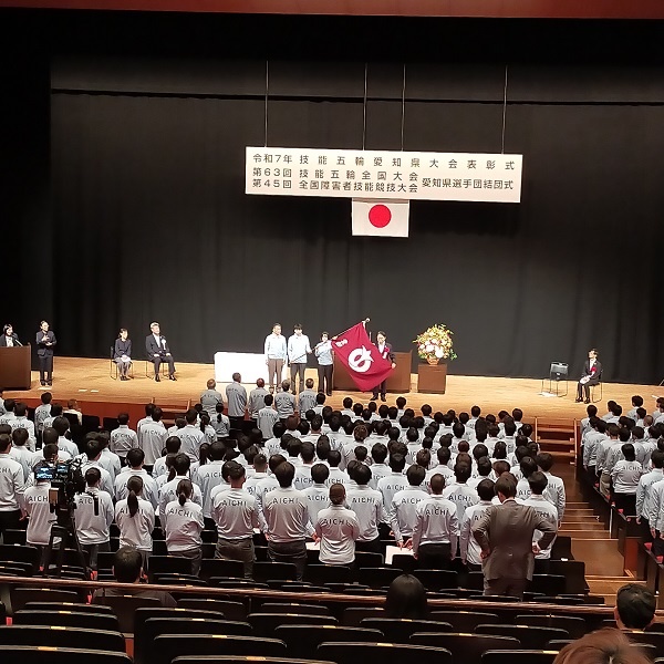 今日は刈谷市総合文化センターにて技能五輪全国大会 愛知県選手団結団式が開催されました。10月17日から開催される第63回技能五輪全国大会・第45回全国障害者技能競技大会に出場する愛知県選手234名が集まり、専攻科からは4職種6名が参加しました。 また専攻科では若年者ものづくり競技大会での優秀な結果と、技能五輪全国大会出場を祝う横断幕を設置しました。