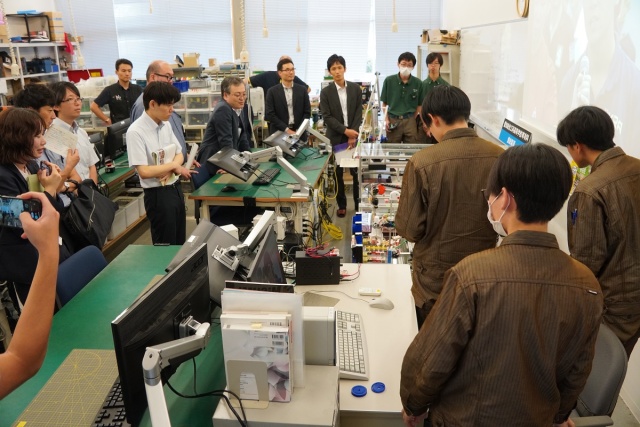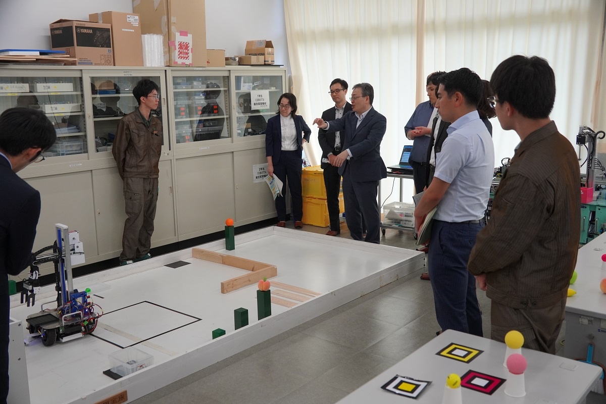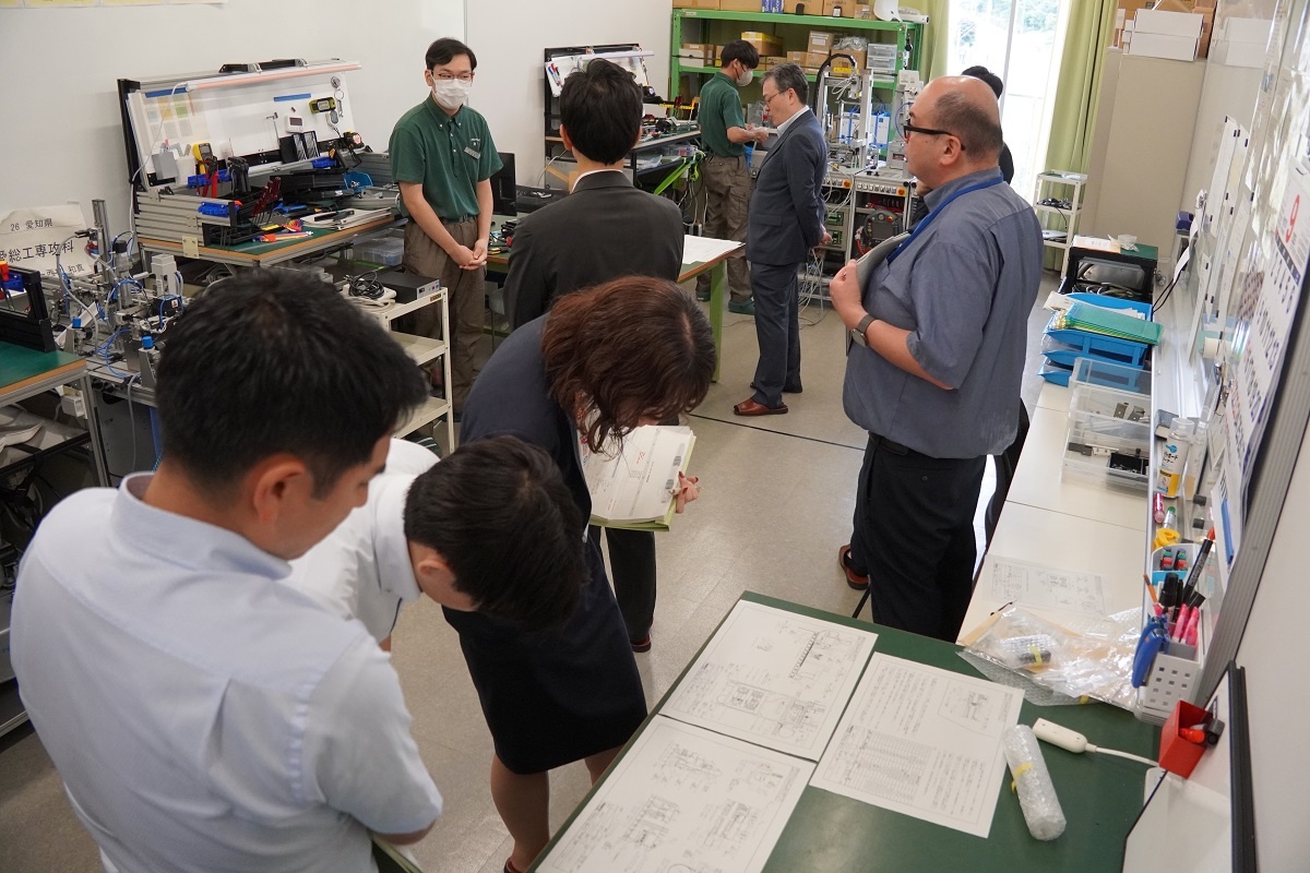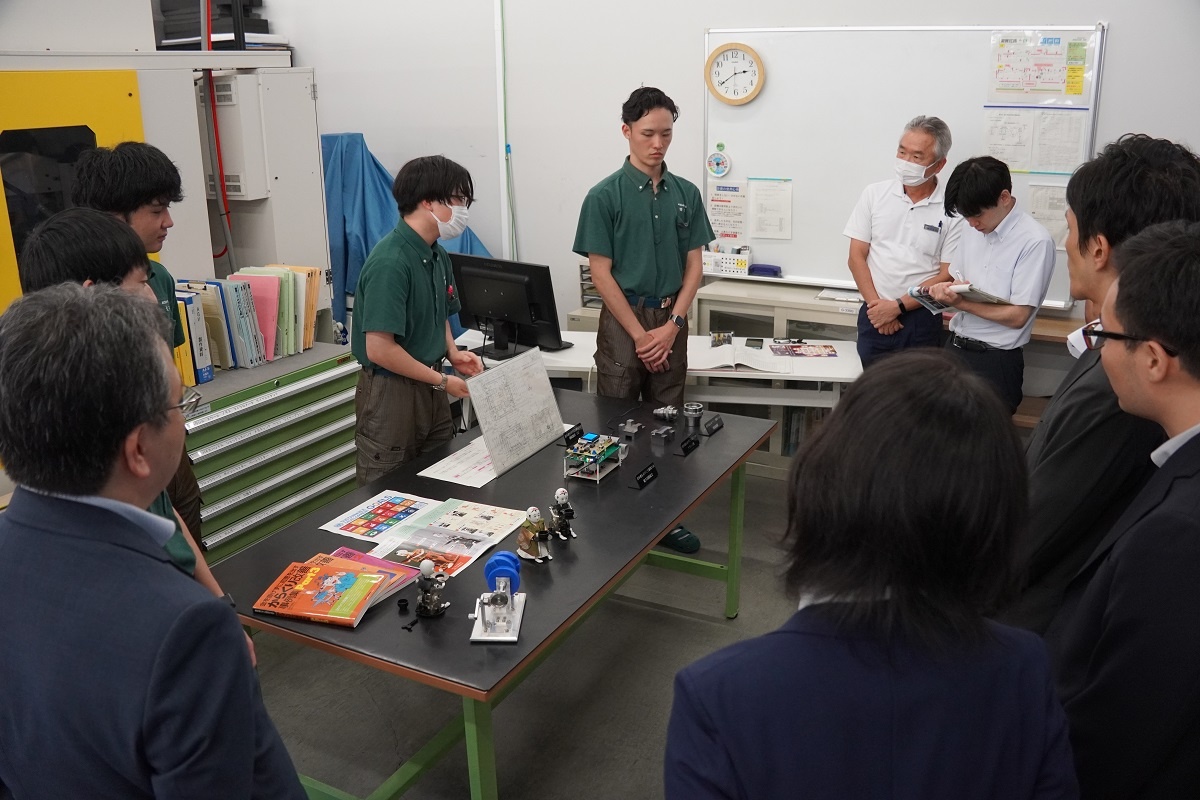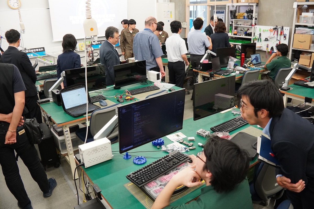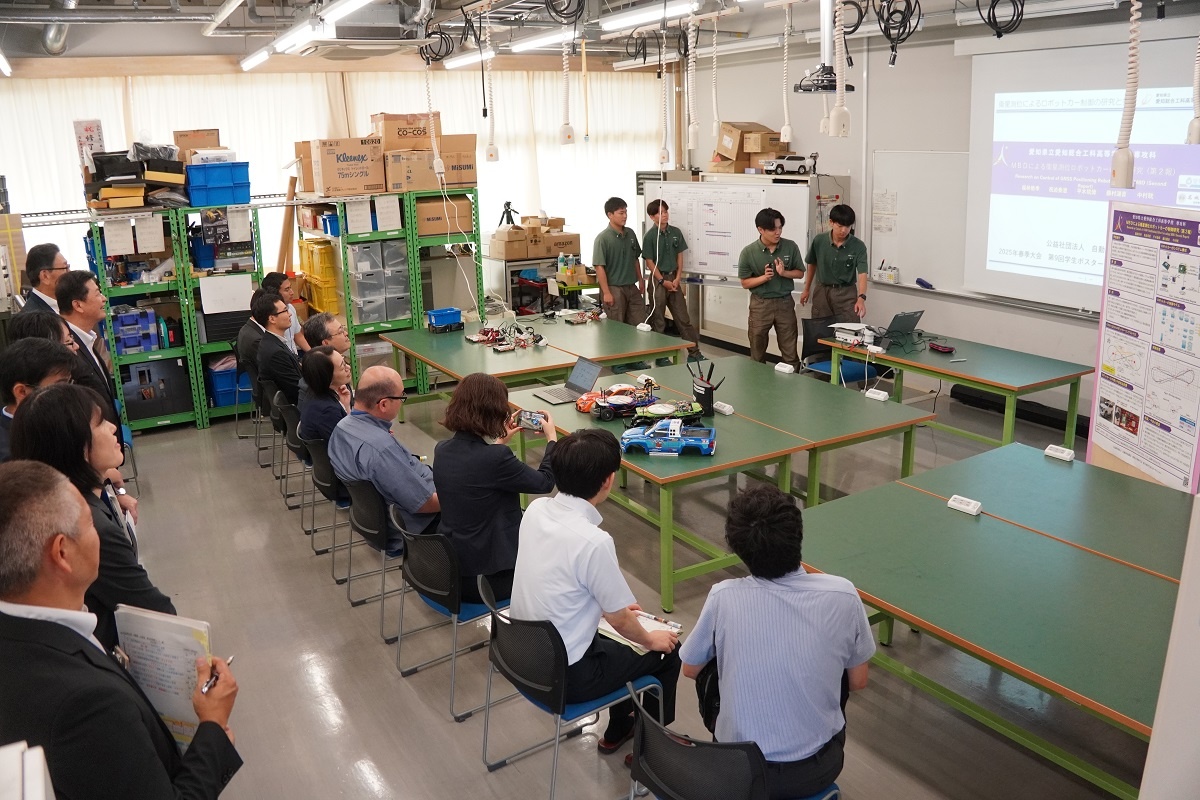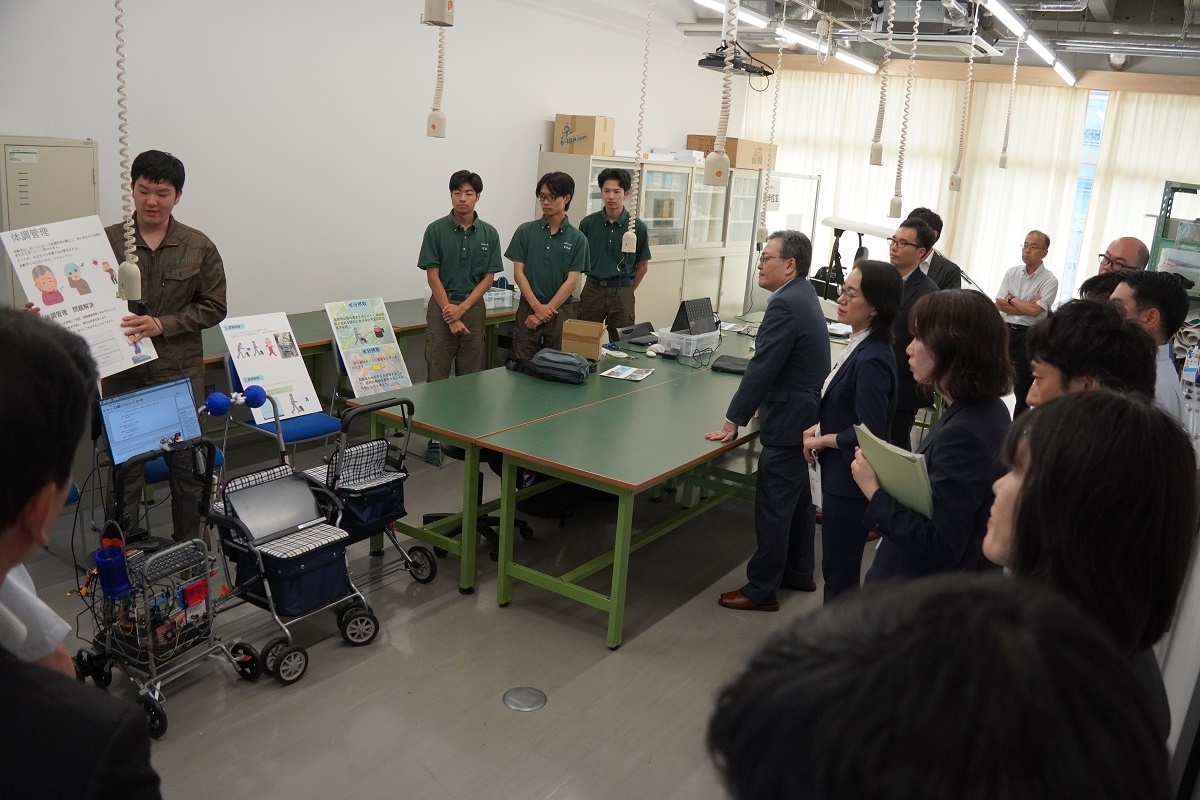 専攻科は午後から内閣府、文部科学省の視察がありました。「航空機製作に向けての基礎研究と実践」「エコモビリティ技術の研究と実践」「先端小型ロボットの開発と製作」「ドローン操縦国家資格取得研究およびAIを使ったアグリテクノロジーの研究」「機械技術の研究とからくり寄稿を使った生産設備の製作」「衛星測位によるロボットカー制御の研究と実践」「フレイル予防ソリューションの企画&開発」「電気系・高度ものづくり技能の追求と実践」班が、日頃の取組について緊張しながらもしっかり説明する様子が見られました。