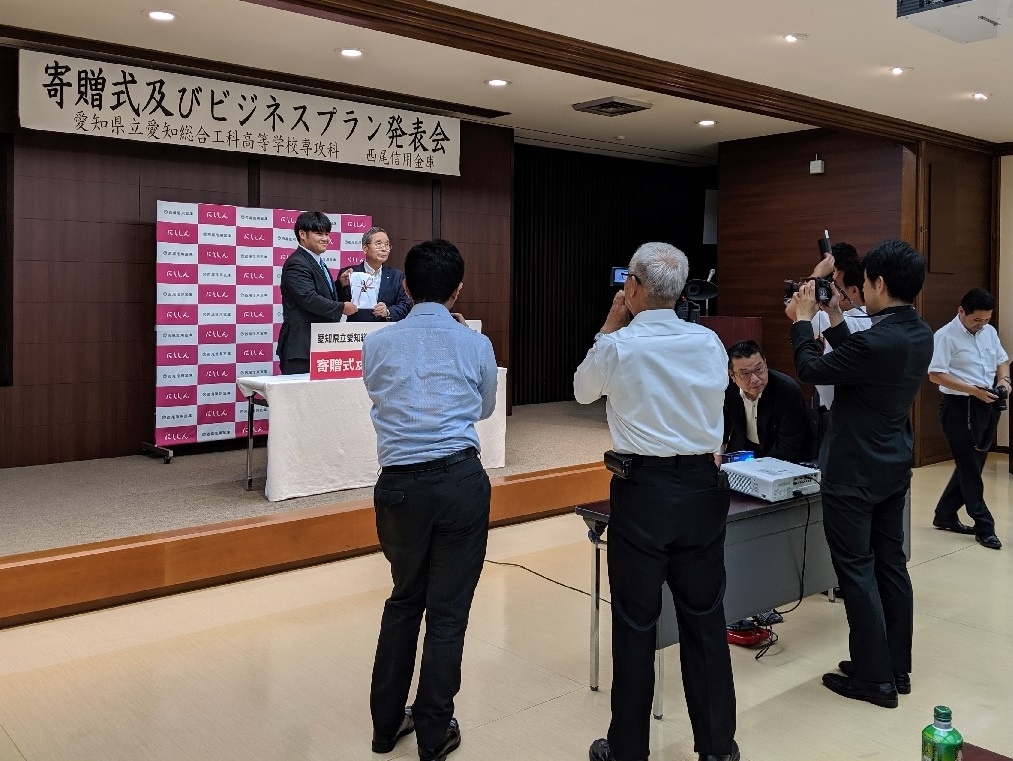 1年次に履修した「経営マネジメント」の知識を活用し、東京モーターショー2019に出展する車両でのビジネス展開を考え、西尾信用金庫にて発表しました。発表会では4人の生徒が役員の方々を前に、車両開発の経緯や特徴、ビジネスプランを説明しました。緊張した様子でしたが、頑張っていました。