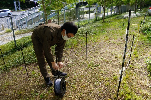今日は総合実習(1年生)でした。「ドローン操縦国家資格取得研究およびAIを使ったアグリテクノロジーの研究」班は、校内に電気柵を設置し実験に取り組んでいます。