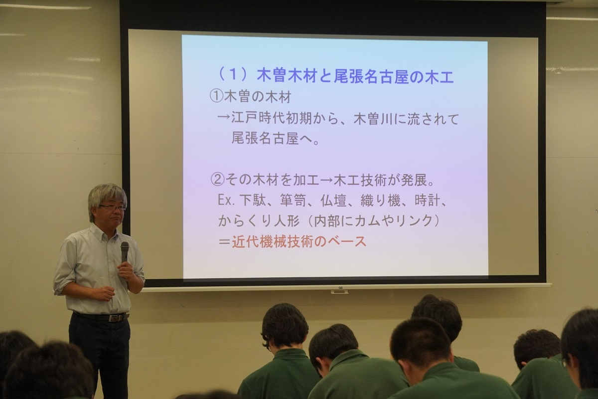 今日の3限は総合演習でした。1年生は名城大学 経済学部 渋井 康弘 教授による「日本のモノづくりを支える技術と技能」についての講演でした。愛知のモノづくりと木曽川についてのお話を聞くことができました。