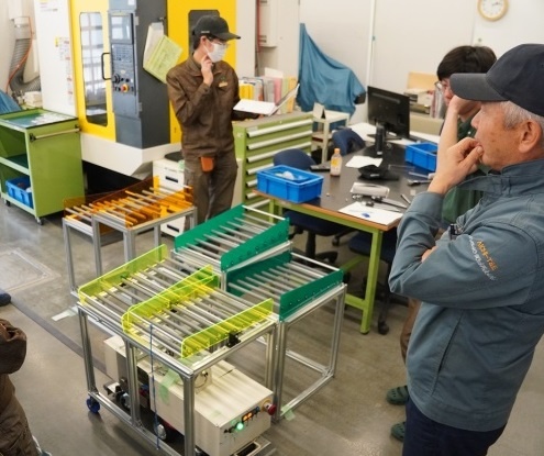 今日は総合実習(2年生)でした。「機械技術の研究とからくり機構を使った生産設備の製作Ⅱ」班は、1年生で取り組んだAGVとからくり機構を使って、実際に生産工場で使われている仕組み作りに取り組んでいます。