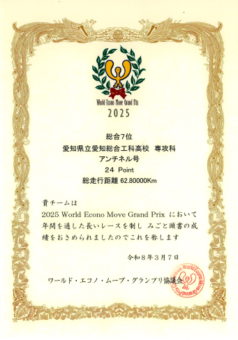 2026電気自動車・燃料電池車・ソーラーカー製作講習会で2025World Econo Move Grand Prix(WEM)の表彰式がありました。WEMに登録されている大会が1年間で5つあり、各大会で上位に入賞するとポイントを獲得できます。「エコモビリティ技術の研究と実践」班は、総合7位(24point)と10位(20point)で表彰されました。