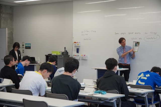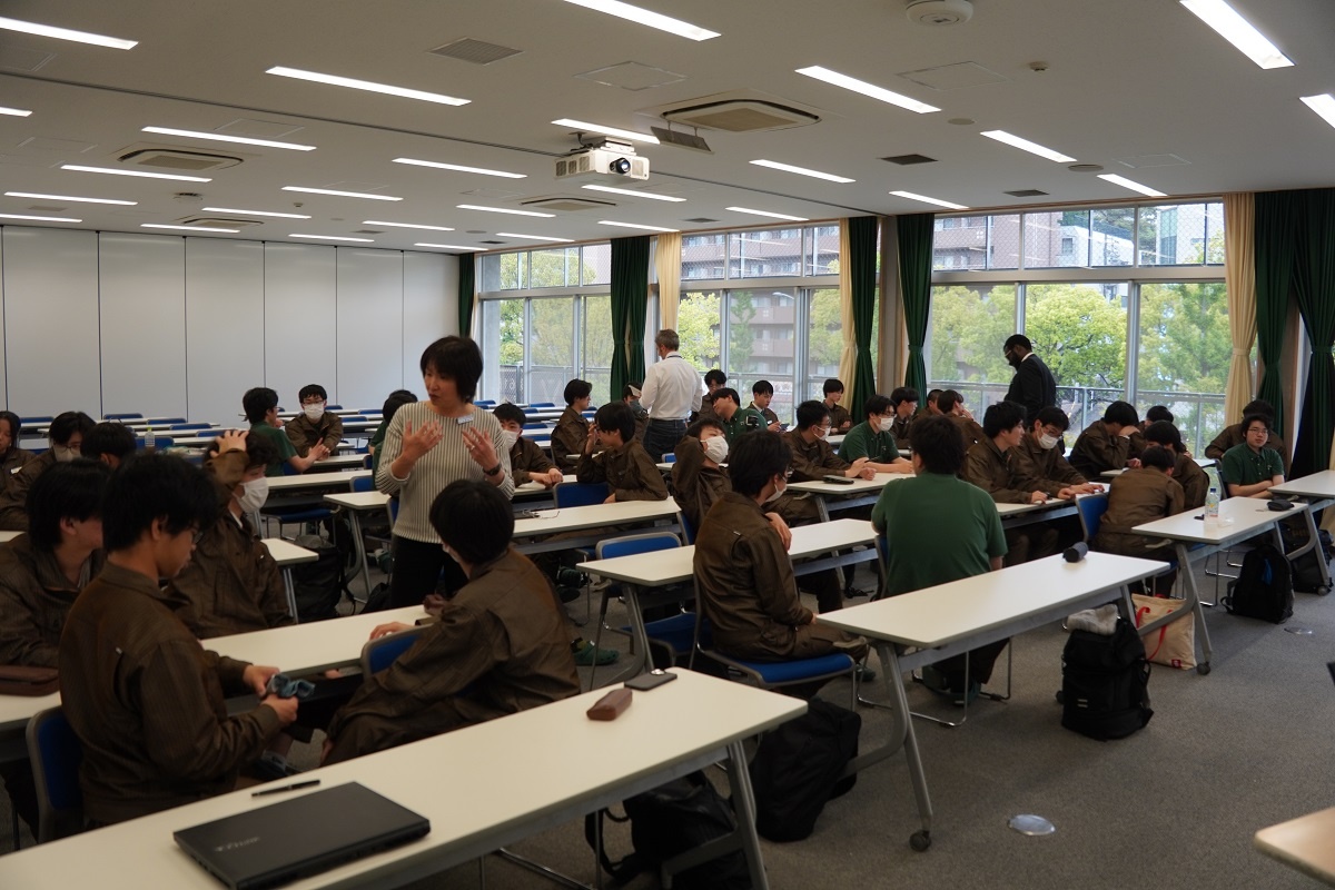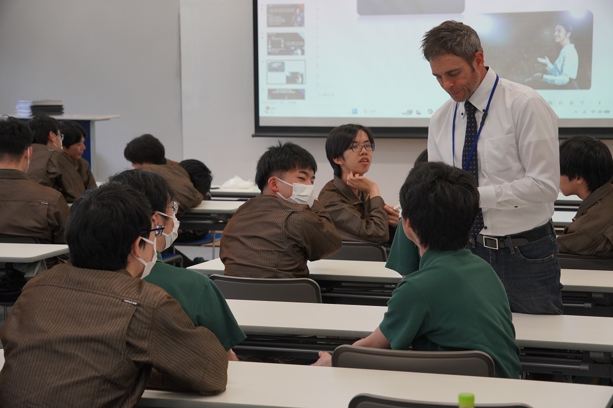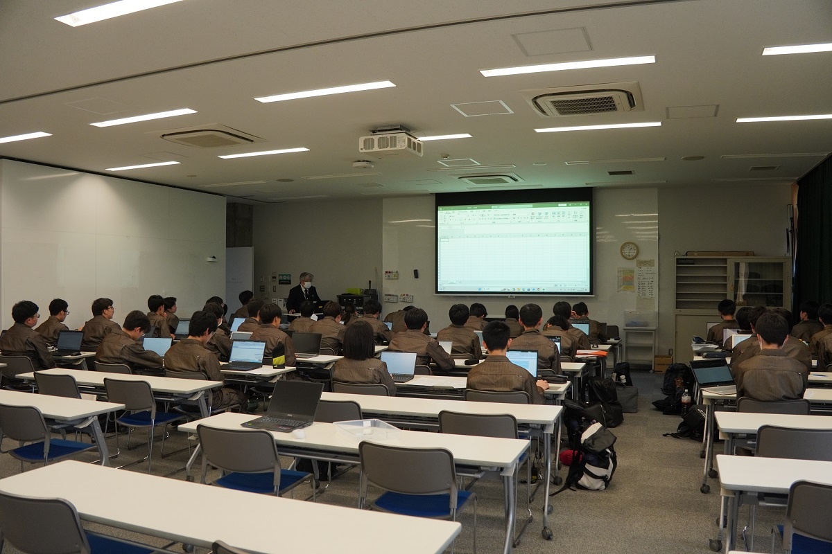 専攻科での英語の授業は20名ずつ、2クラスに分かれます。ネイティブの先生を含む2人の先生が担当し、英語教育にも力を入れています。 また3限「総合演習」では、1年生はExcel、2年生は英語プレゼンテーションに取り組みました。