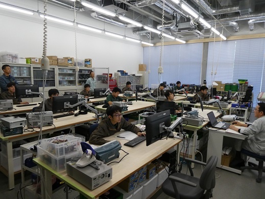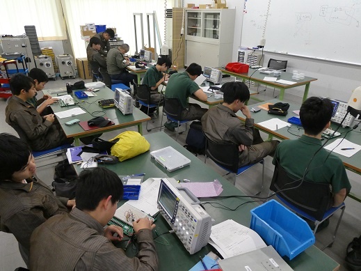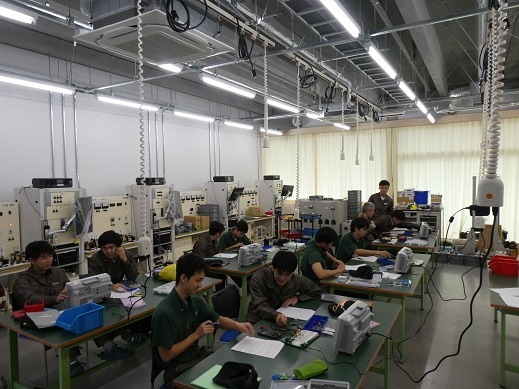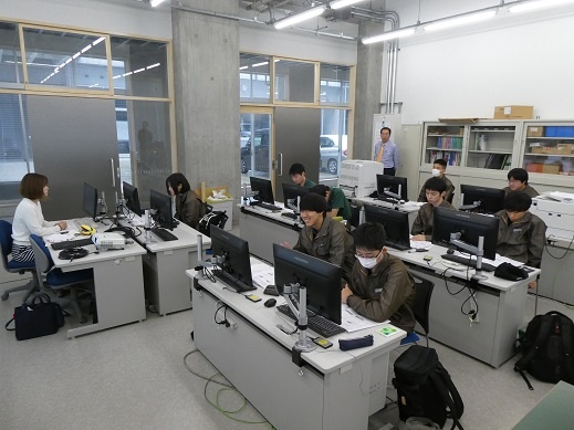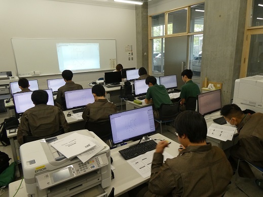 今日は1年生がコース別実習でした。今日から3週間、それぞれ新しい内容に取り組みます。生産システムコースでは「3DCAD(使用方法、作図)」、情報システムコースでは「回路シュミレータ(LTSPICE)」、自動車航空産業コースでは「マシニングセンタ(0設定、R加工)」、エネルギー産業コースでは「三相交流(三相交流電源)」について学んでいます。様々な企業から講師の先生がみえ指導してくださっています。