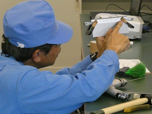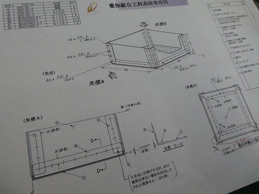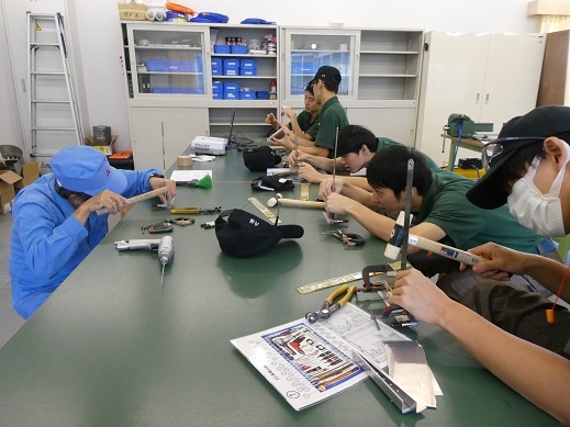今日は1年生が総合実習でした。その中でも「航空機製造技術の研究と実践」では、三菱重工業株式会社の佐藤武史先生が講師として技術を教えてくださっています。前期に学んだ穴明け、皿取り、リベット(鋲)打ちの技術を使って、小物入れ作りが始まりました。航空機と同じ素材でできる小物入れ、完成が楽しみです。