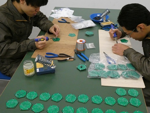 明日、11月23日(土)9:30~17:00、専攻科初の試みである小学校1年生から6年生を対象としたワークショップを開催します。今日は2年生がその準備に取り組んでいました。基板からオリジナルで作製し、はんだ付けなどの細かい作業もすべて手作業の、手作りオーナメント作りです。※こちらはすでに事前予約を締め切っており、29名の参加を予定しています。