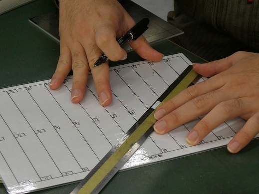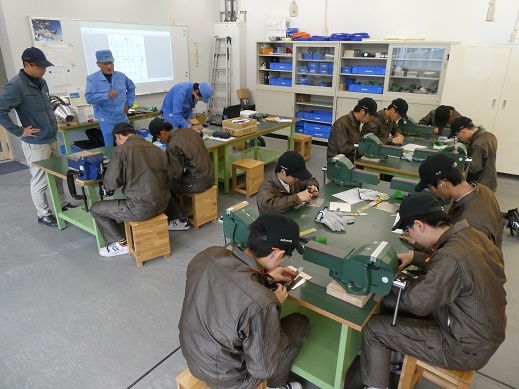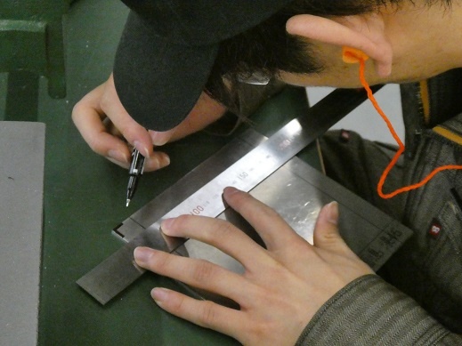 1年生自動車・航空産業コースでは、今日から「航空機製造Ⅰ」が始まりました。全6日(90分×4コマを6日間)で完結するこの実習では、三菱重工業株式会社から2名の先生に来ていただき、基本的な航空機製造技術の習得を目指します。今日は航空機産業で使用する工具の使い方を学んでから、実際に材料となるアルミのバリ取りや穴あけなどを行いました。航空機産業ならではの、やすりや等分割りスケールなど、生徒たちは初めて扱う工具などに興味津々で作業に取り組んでいました。