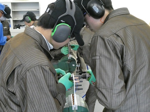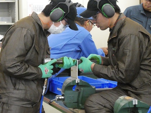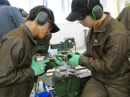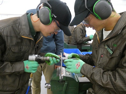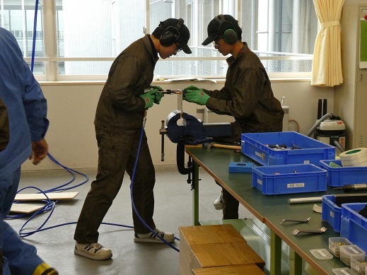 1年生コース別実習 自動車・航空産業コースでは、航空機製造の基本であるリベット打ち作業を行いました。リベットは、打つ人と、当て金を支える人の二人の共同作業になります。「ハイッ」「ハイッ」と声をかけ合いながら、リベット打ち作業を修得しました。リベットを外す「切替し」という作業も行いました。