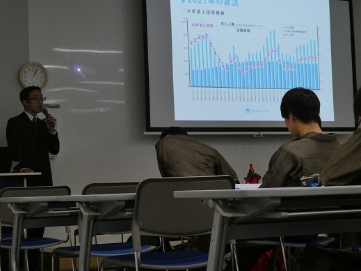 今日は後期定期考査最終日。1年生は午後から1月31日(金)に実施する「T&Eサポーターズ企業(68社)による業界研究セミナー」の事前ガイダンスとして、株式会社インテルプレスによるセミナーが行われました。就活の心構えなど、真剣に話しを聞く姿がみられました。