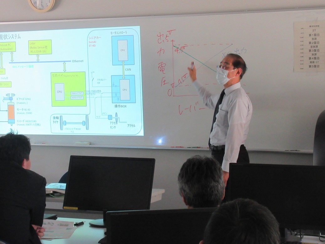 県立工業高校の担当教員代表14名を対象に、専攻科にて事前研修会が実施されました。専攻科での先進的な取組である自動運転技術の習得を、IT工学科としての最終目標とする方向で検討を進めています。本校の非常勤講師として総合実習「自動運転支援プレビューセンサの開発と実践」を担当している勝野歳康先生から、総合実習活動の状況をふまえた教育実践例を紹介しました。このように専攻科は先進的な教育実践の成果を、県内の工学教育に還元していく役割も担っています。
