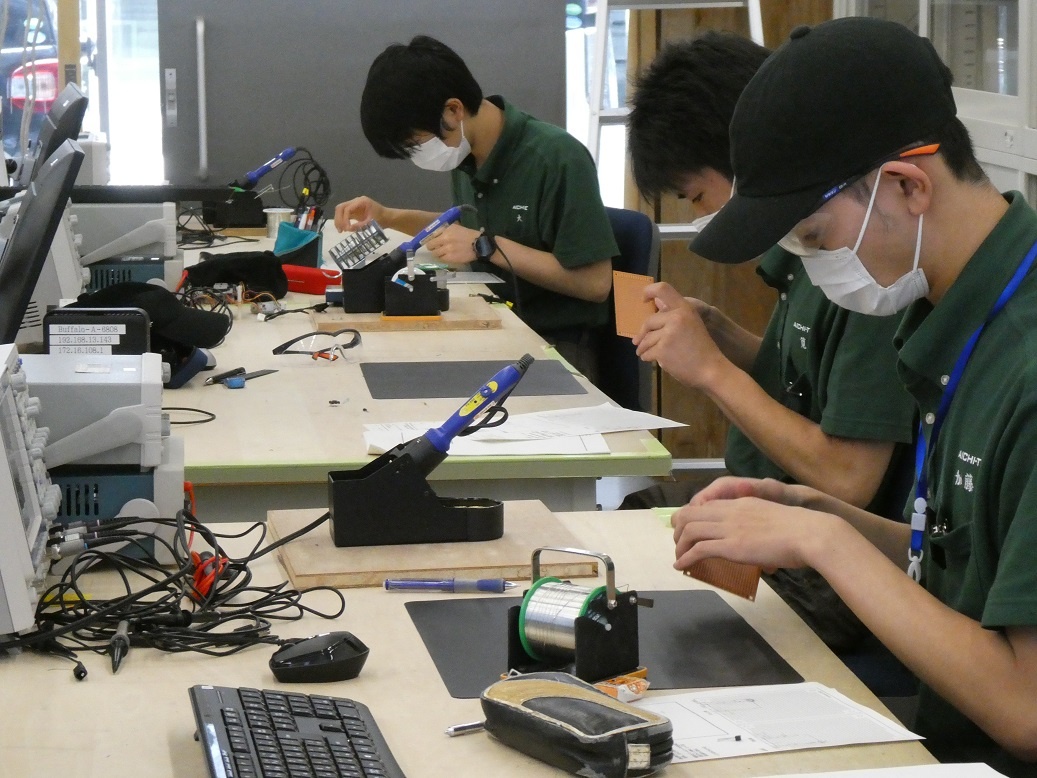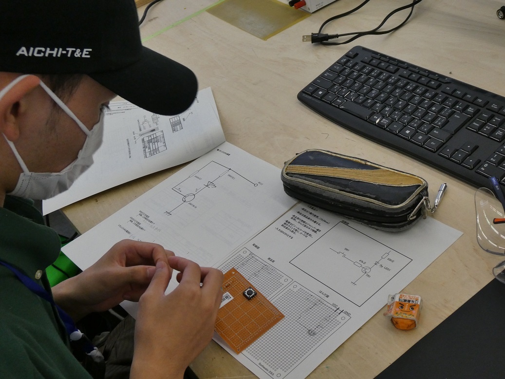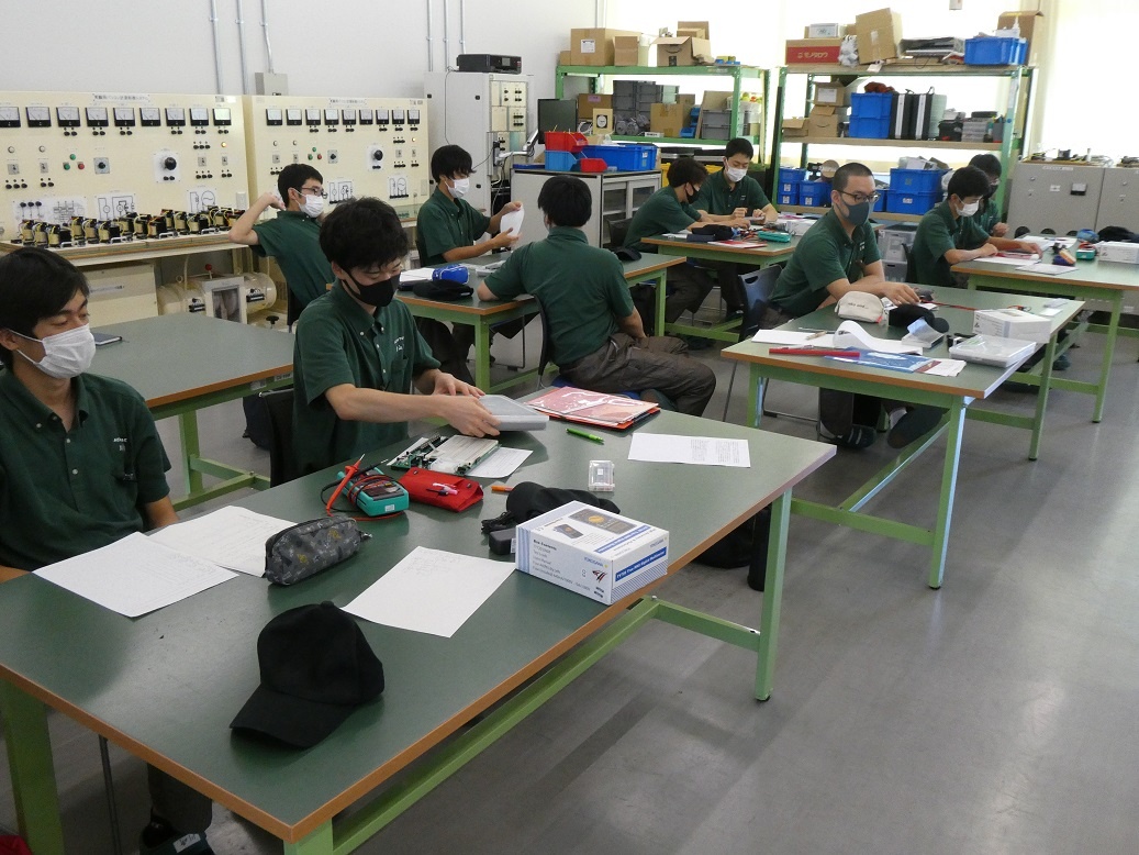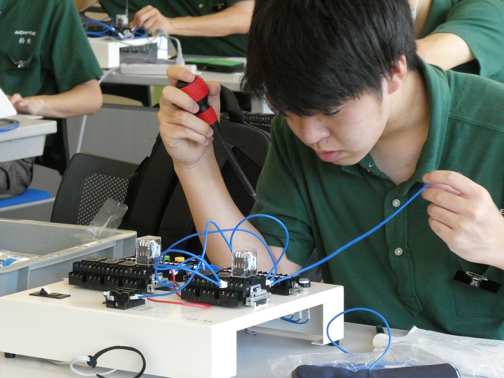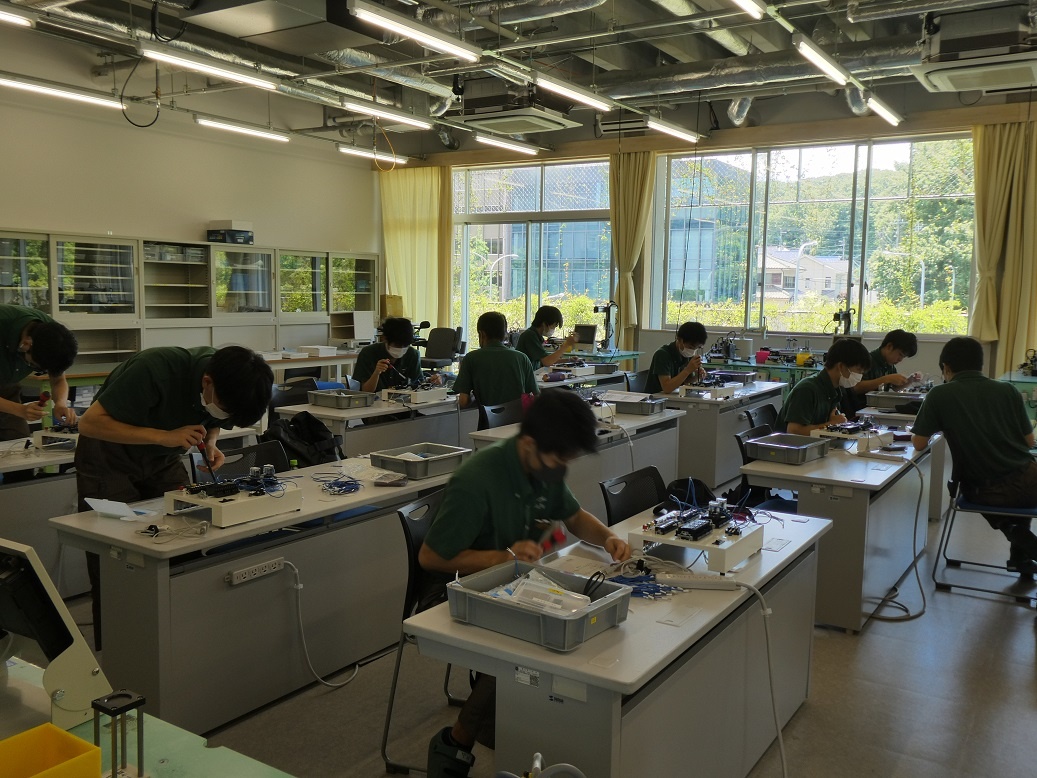 今日は1年生がコース実習でした。 コース実習は3回の授業で内容がローテーションするため、今日は各コース新しいことに取り組みました。生産システムコースではシーケンス制御について、情報システムコースでは電子機器組立について、自動車・航空産業コースでは旋盤/溶接について、エネルギー産業コースでは空気圧制御について学びました。 1年生は全員皆勤が続いています。この調子でこれからも頑張ってほしいなと思います。