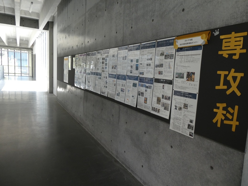 専攻科には2箇所の掲示板があります。場所はコネクトモールの2階です。掲示板には、昨年度の成果発表会で先輩たちが発表したポスターや、教員紹介、カリキュラム紹介が掲示されています。また、このHPと同じ「専攻科の日常」を掲示し、本科のみなさんにも、専攻科生がどのような活動をしているのか興味をもってもらえるようにしています。