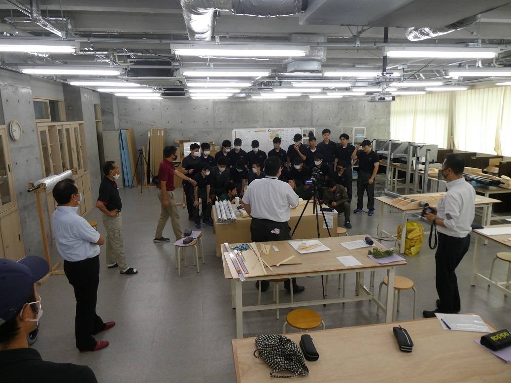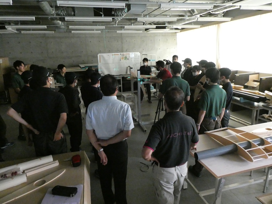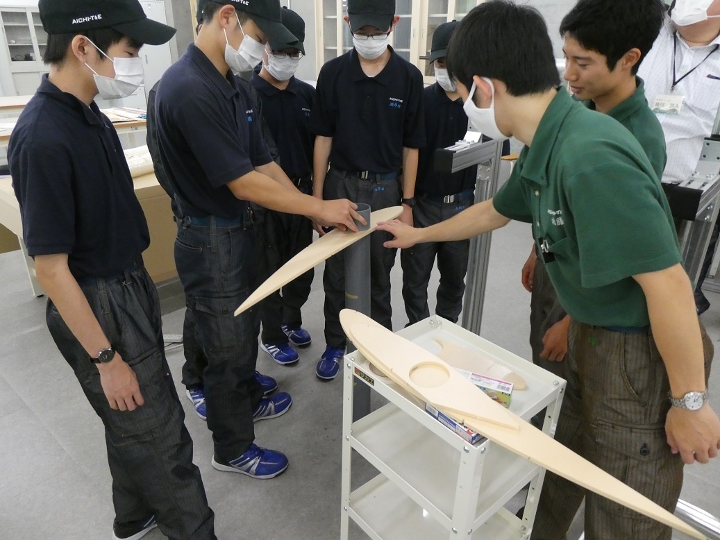 2年生総合実習の「航空機の製作に向けての基礎研究と実践(鳥人間コンテストを目指して)」のチームは、11月に愛知こどもの国(西尾市)で行われる試験飛行に向けて航空機の製作をしています。今日は、試験飛行に向けてのPR用の撮影が行われました。 この活動は、本科機械系学科の課題研究の生徒18名と連携して行っており、専攻科のメンバーが、本科の生徒たちに作業内容を説明しながら一緒に「コノウエ300K」づくりに取り組んでいました。