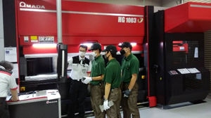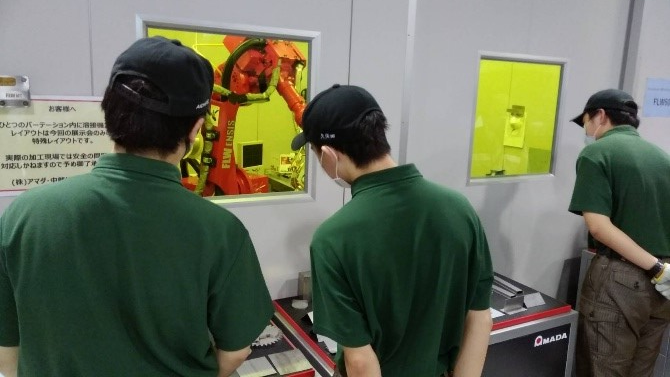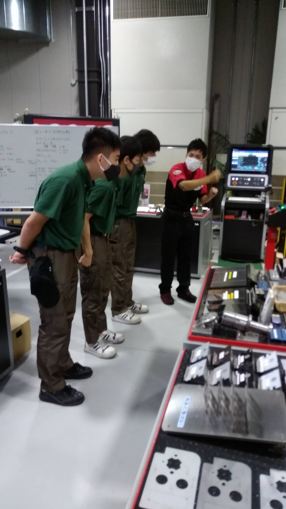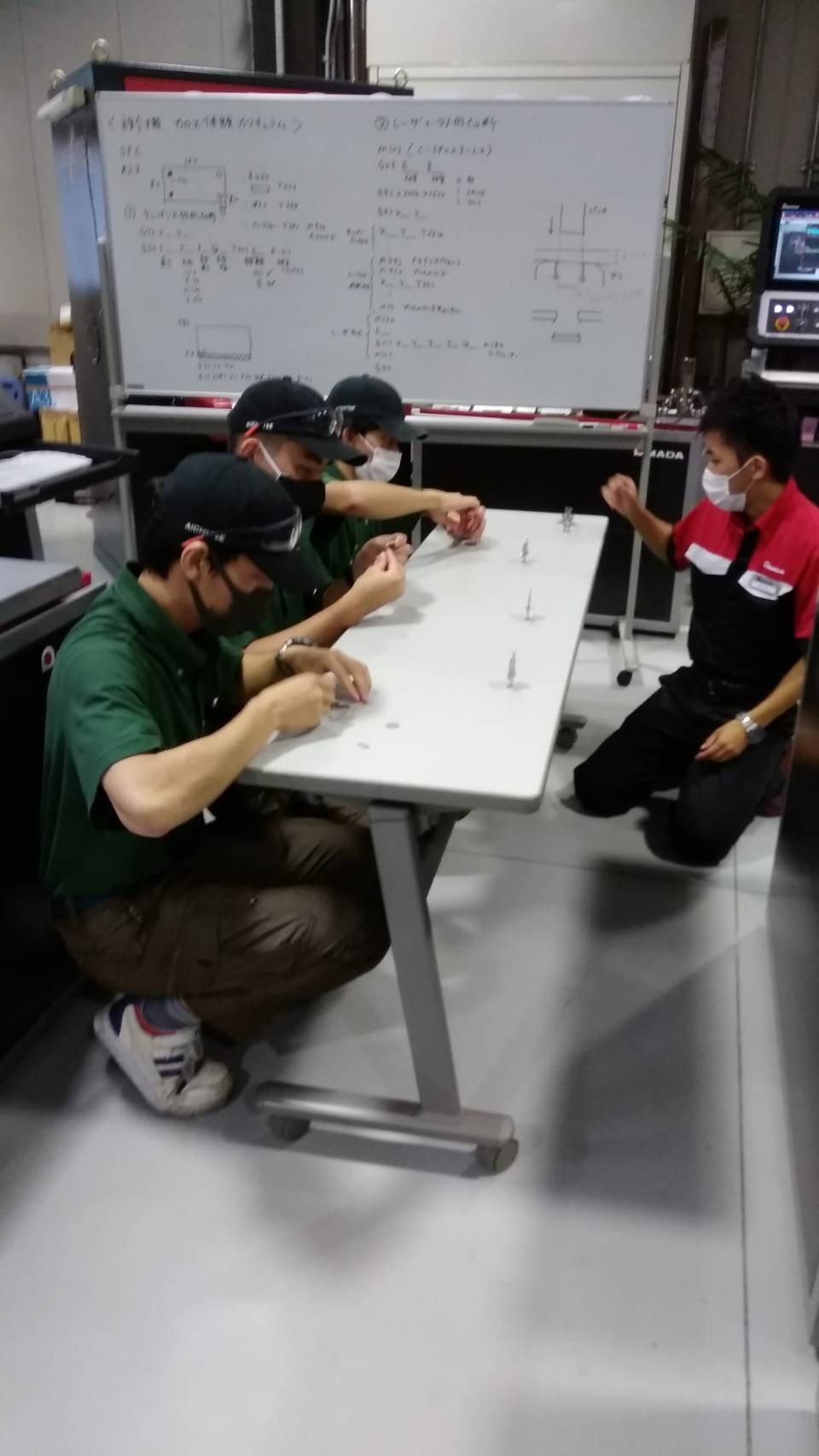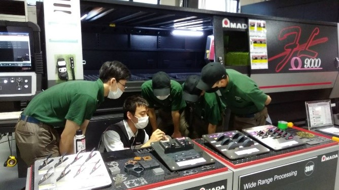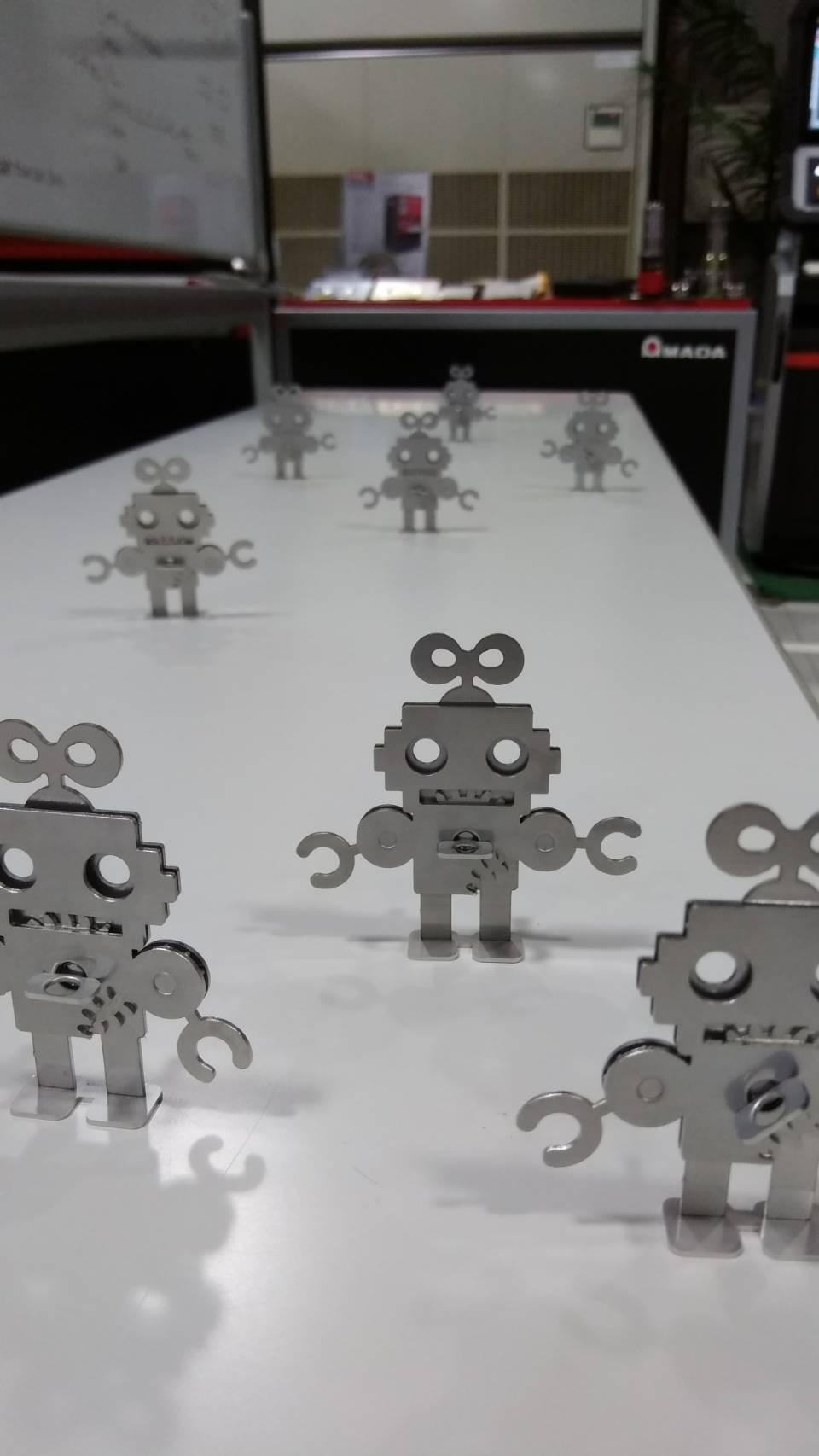今日は2年生コース実習でした。自動車・航空産業コースでは、株式会社アマダの中部サテライトセンター(一宮市)で、ベンダー、レーザー加工、レーザー溶接機、複合機(レーザー溶接とプレス加工の複合機)の操作説明を受け、それらの機械を使って、ペンケースや携帯ホルダー、ロボットのオブジェなどを製作しました。