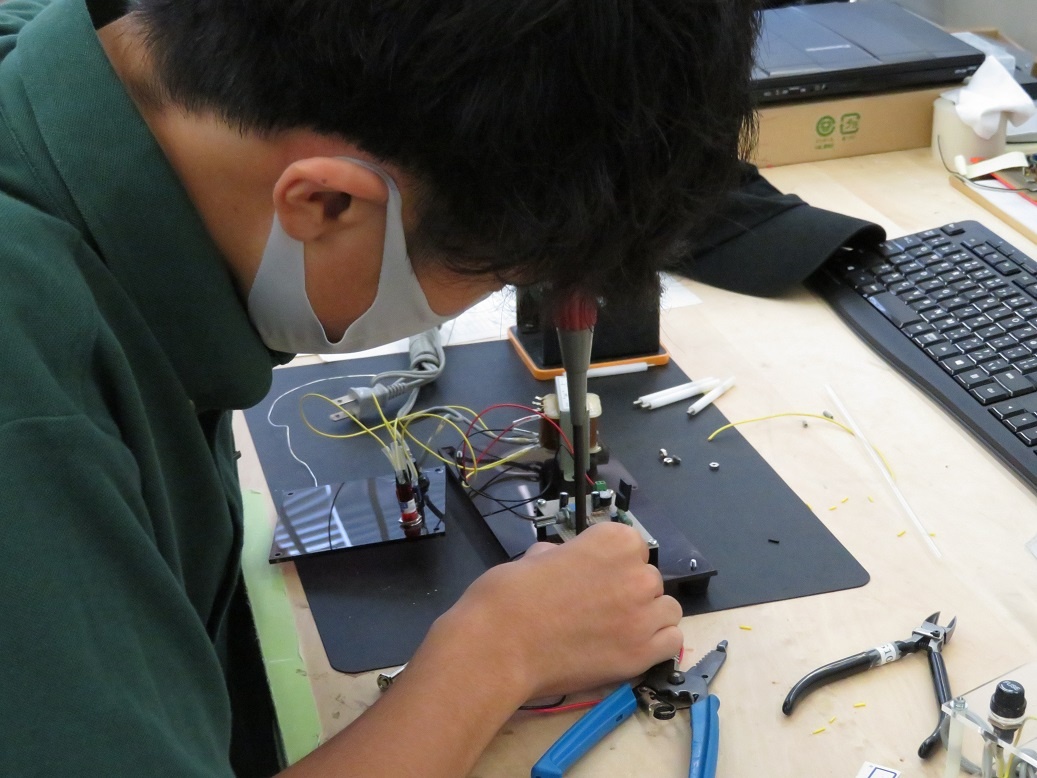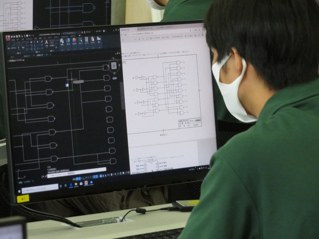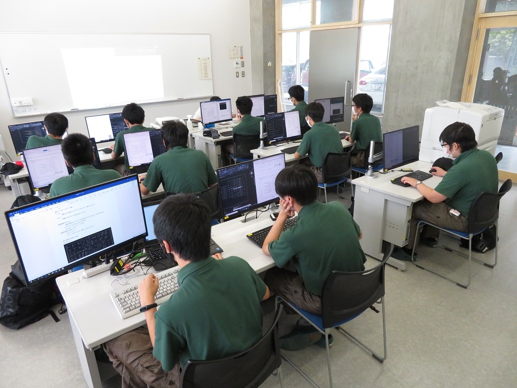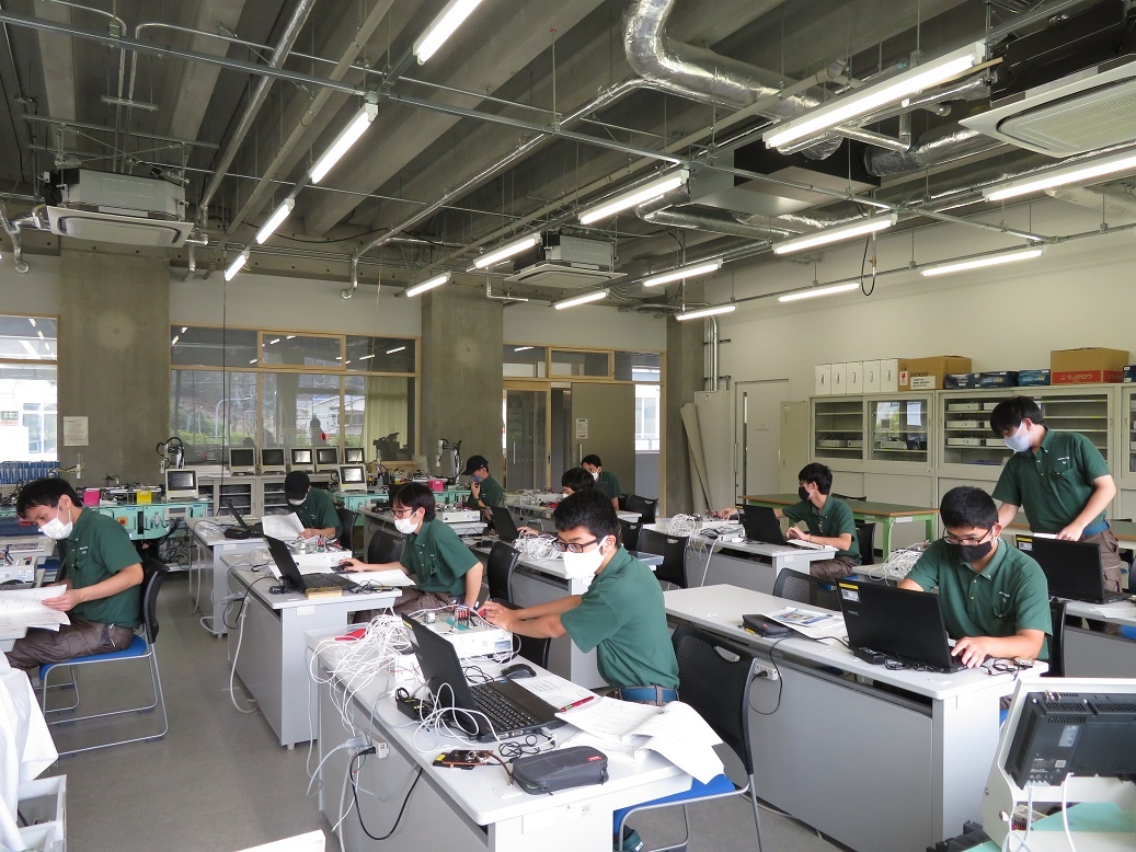 今日は1年生がコース実習でした。生産システムコース「フライス/手仕上げ」、情報システムコース「電気製図」、自動車・航空産業コース「シーケンス・PLC」、エネルギー産業コース「電源回路」と、それぞれ15回目(年間30回のちょうど半分です)の実習に取り組みました。 また、4回目となるIT工学科立ち上げに伴う技術指導会が終日開催されました。午後には自動運転支援プレビューセンサーが、教室内を移動する様子が見られましたので動画で紹介します。