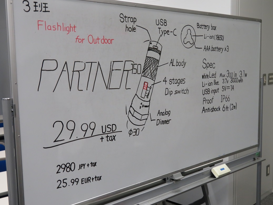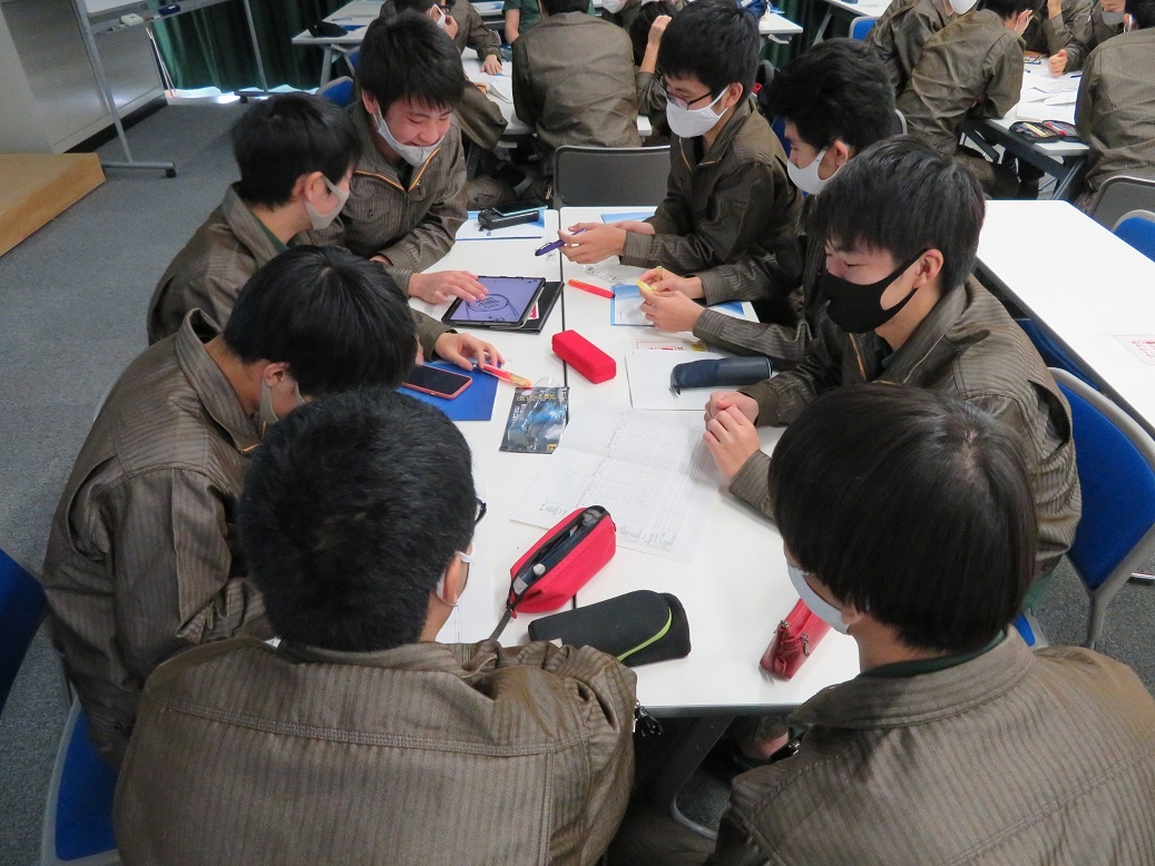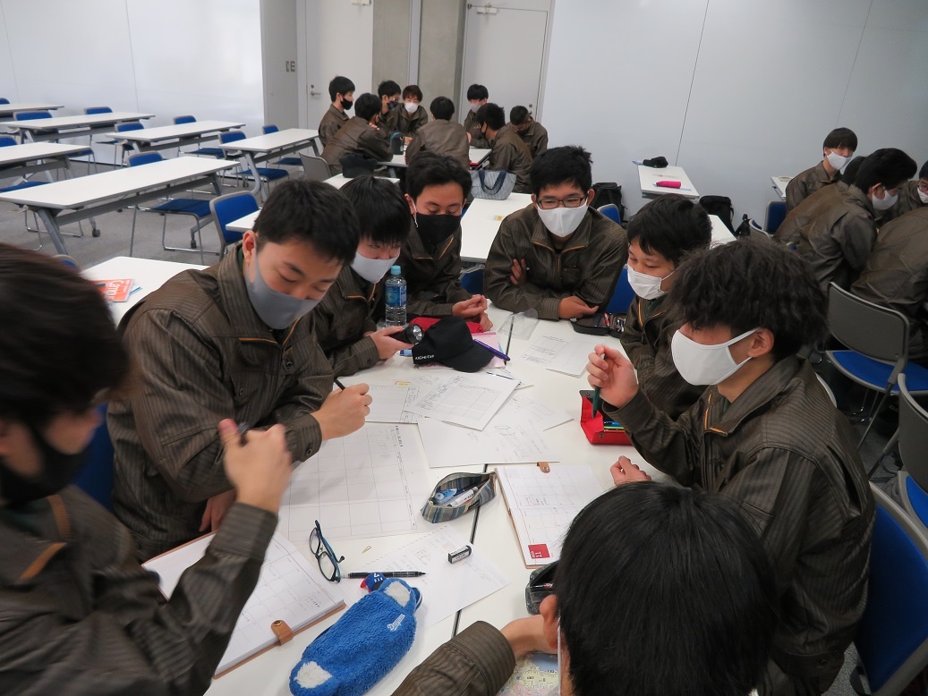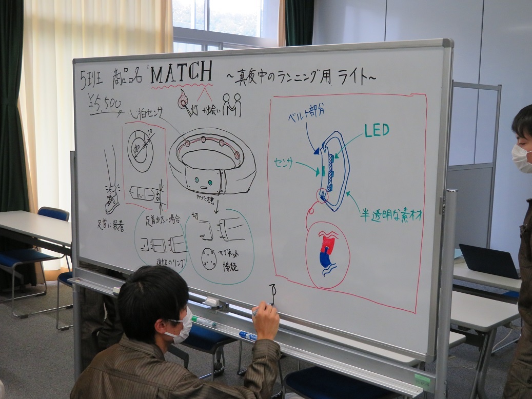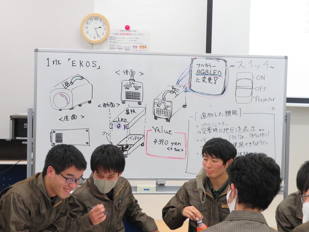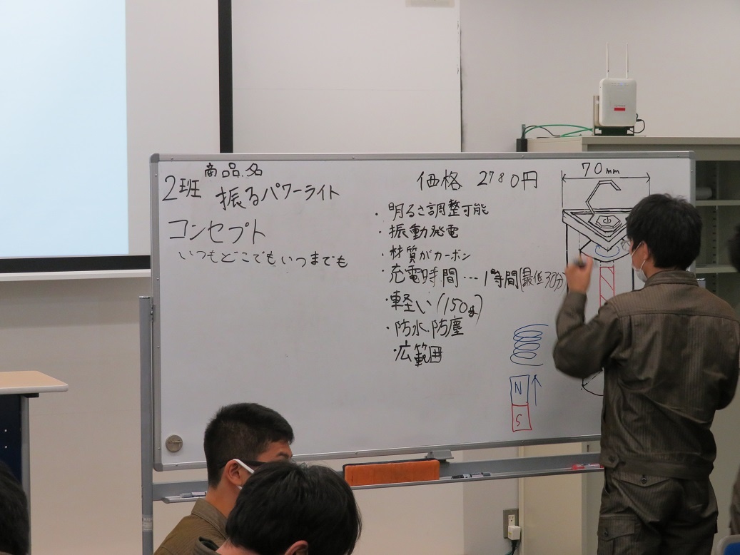 今日の1年生総合実習は「製品開発設計」の2回目が行われました。5グループに分かれ、製品の名称・概要・コンセプト・ターゲット・価格・アピールポイント・設計上想定される不具合と対策などについて意見を出し合いました。まとめとして、各班で開発した製品をホワイトボードに書き込み、それを全員に向かってプレゼンテーションを行いました。