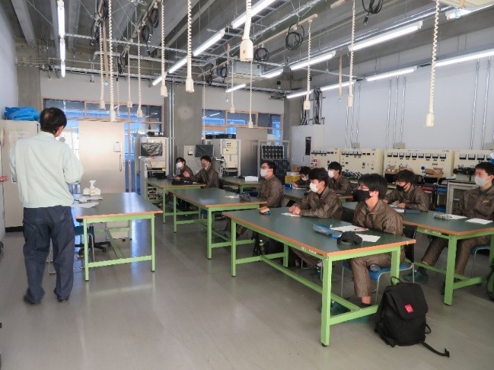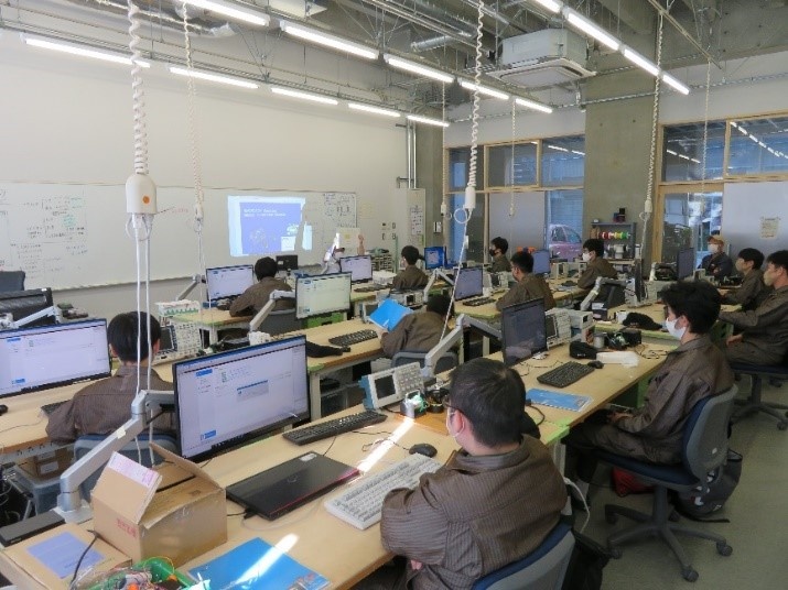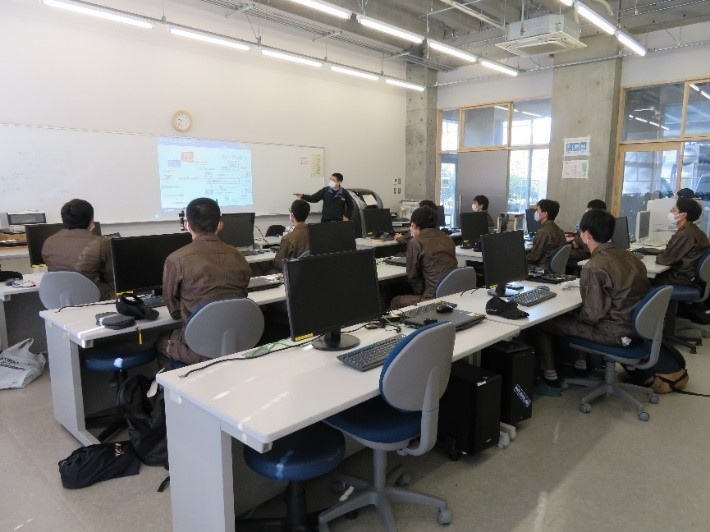 今日は1年生がコース実習でした。今日からローテーションし、生産システム「3DCAD」、情報システム「電子回路設計」、自動車・航空産業「マシニングセンタⅠ」、エネルギー産業コースは「伝送路」と、それぞれ新しい実習に取り組みました。