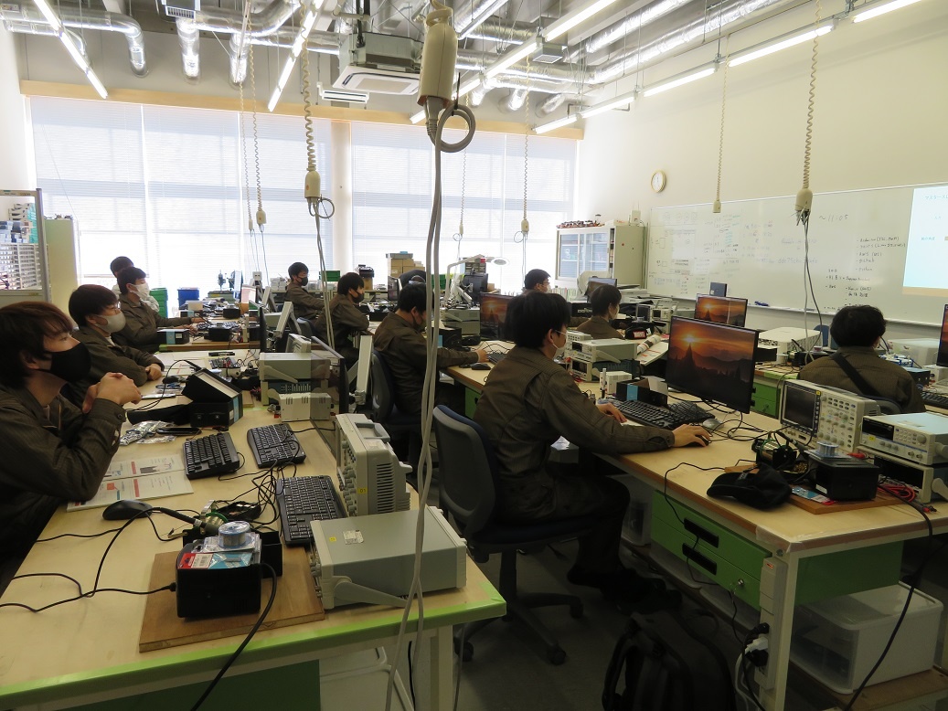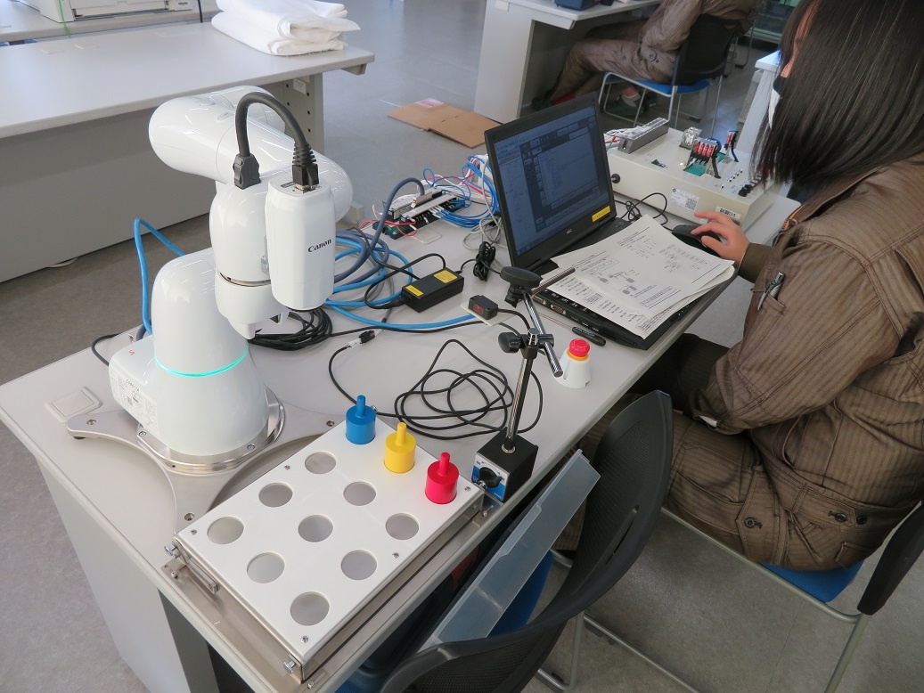 2年生コース実習でした。 生産システムは「FAネットワーク(ロボットIO外部配線)」、情報システムは「AI(高速プロトタイピング)」、エネルギー産業は「伝送路(熱交換理論)」について取り組みました。自動車・航空産業は校外実習で、織機ラーニングセンターにて「機械系保全」に取り組んできました。 エネルギー産業の「伝送路」は、延長コードの抵抗値を測定し発熱量を検証する実験を行いましたが、表記されている基準を超えても発火しませんでした。