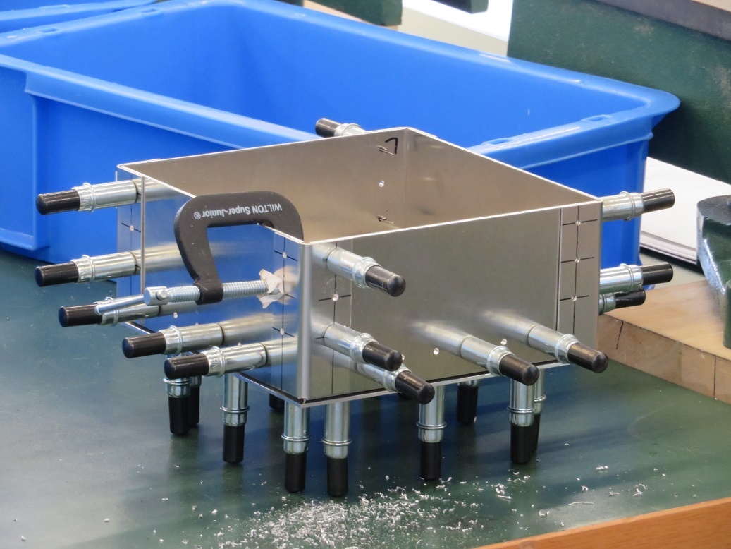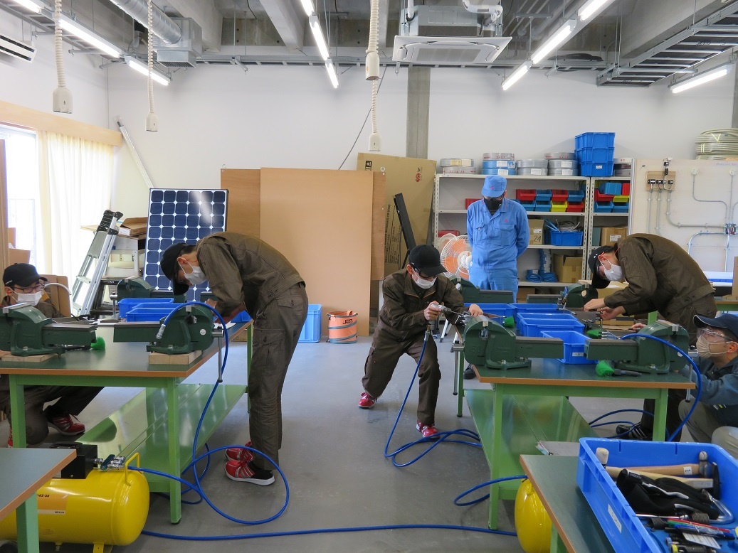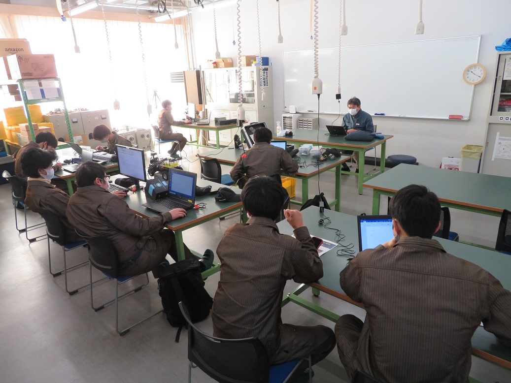 今日は1年生が総合実習でした。成果発表会まで残り3回ということもあり、それぞれまとめを行っている姿がみられました。「航空機の製造技術の研究と実践」では、1年間の実習で取り組んできた穴開けやリベット打ちなど、飛行機製造技術を生かした箱作りに取り組んでいました。