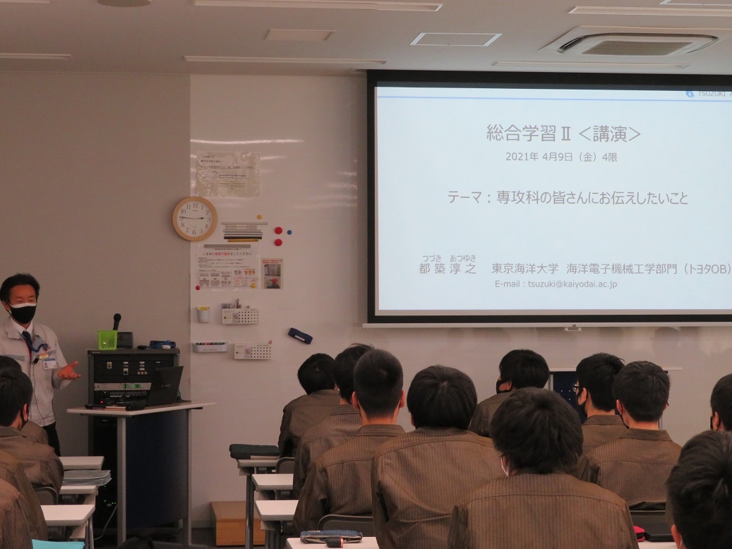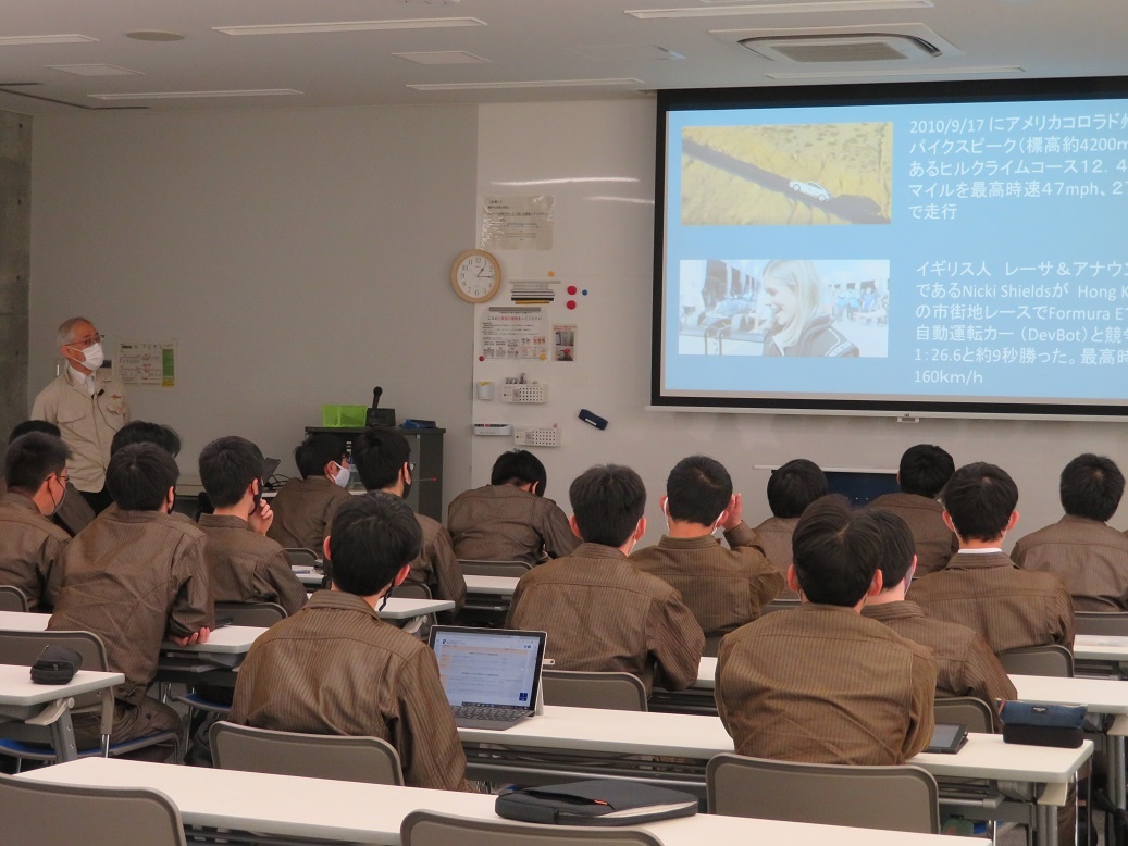 2年生は総合実習オリエンテーションがあり希望調査を行いました。3限は総合実習で「自動運転支援用プレビューセンサの開発と実践」を担当されている勝野先生による講演、4限は「Li電池、FCエネルギーを活用した新モビリティの研究と実践」を担当されている都築先生による講演を聴きました。 1年生は通常授業が始まり、工業力学・組込ソフトウェア技術・電気回路・微分積分・物理学・制御工学などの座学を受けました。清掃活動も始まり、慌ただしくも様々な活動に取り組んでいます。
