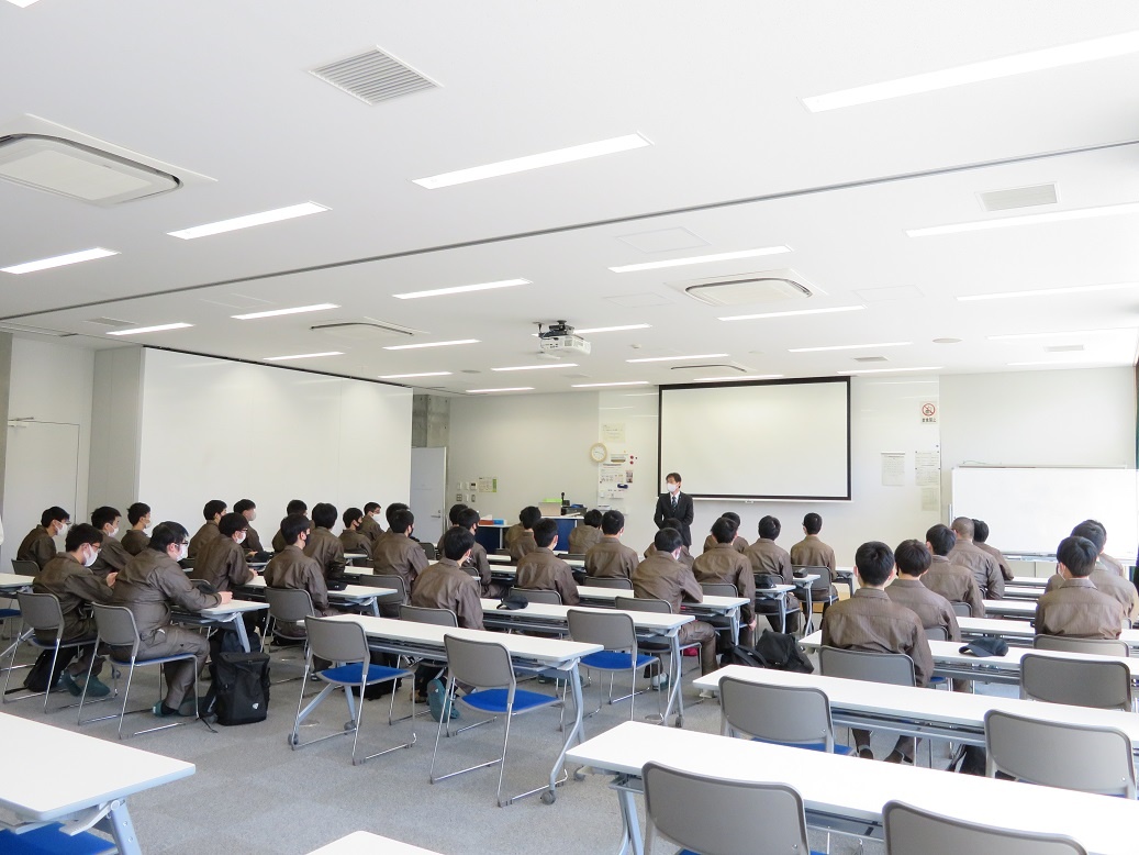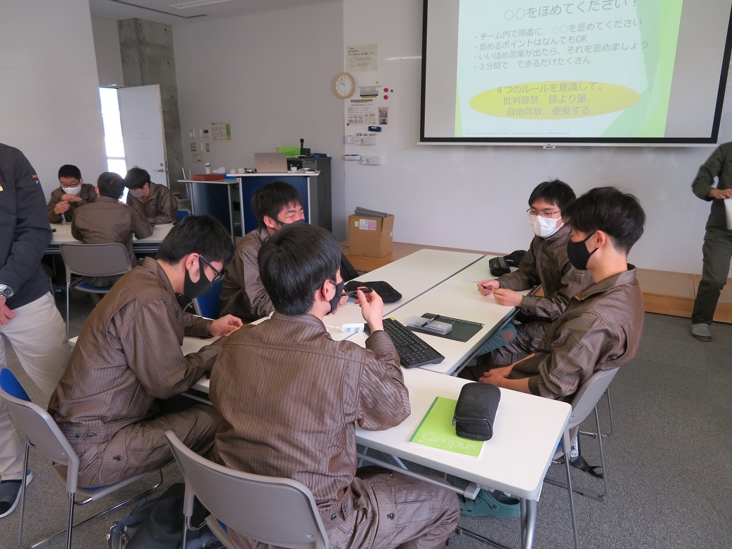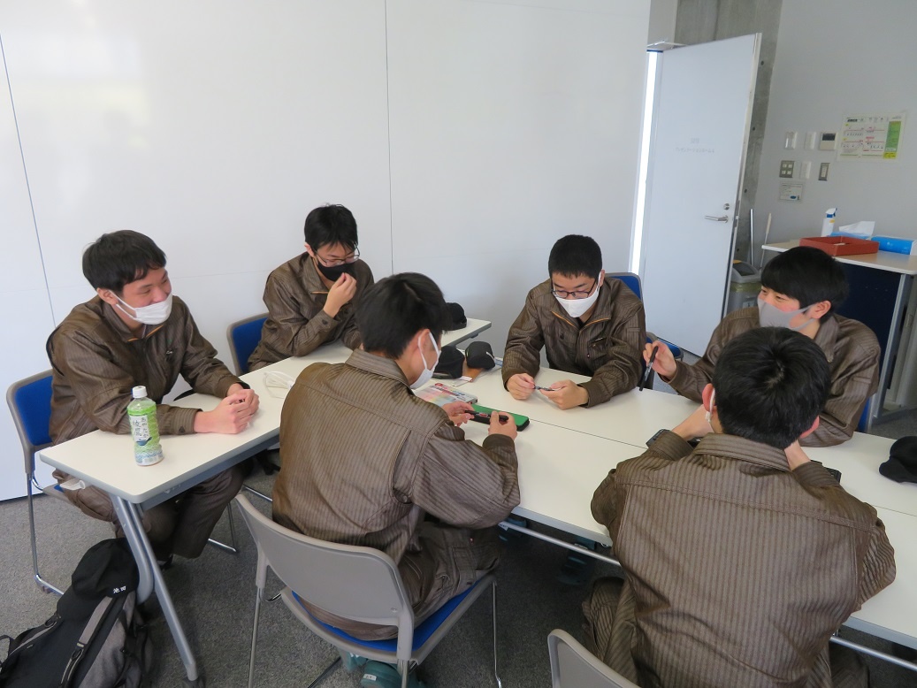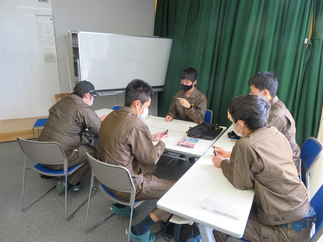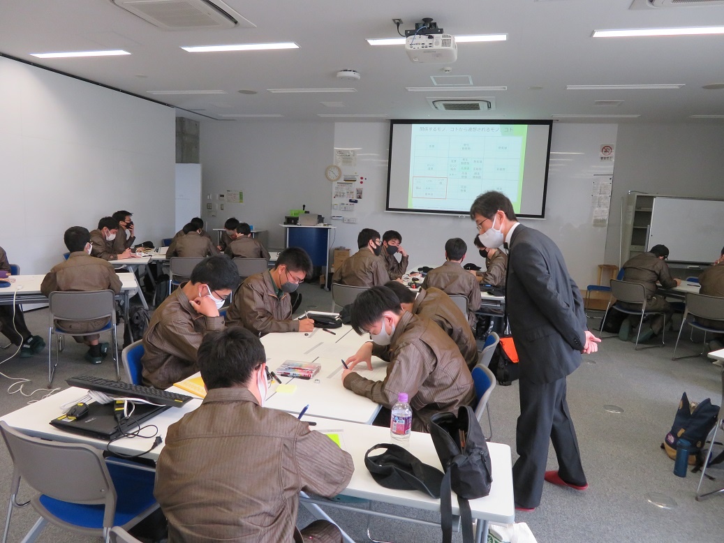 1年生は「英語コミュニケーションⅠ」「線形代数Ⅰ」など1日座学を行いました。 2年生は「コース実習」で、41名全員で「アイディア創出法」という内容に取り組みました。各グループ8人で5グループに分かれ「ファインレボ」という素材を使って、“新しいものを作り出す”というテーマで全3回実施されます。
